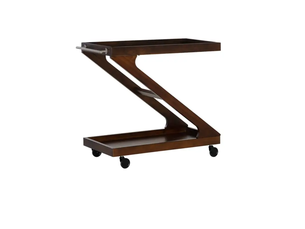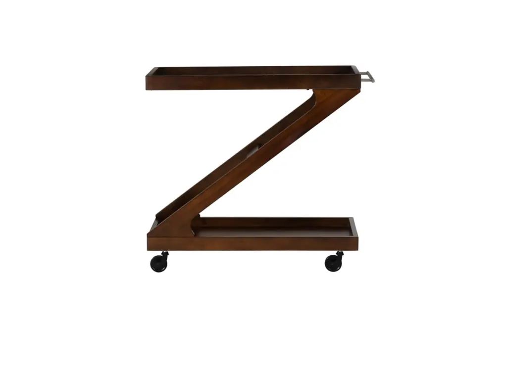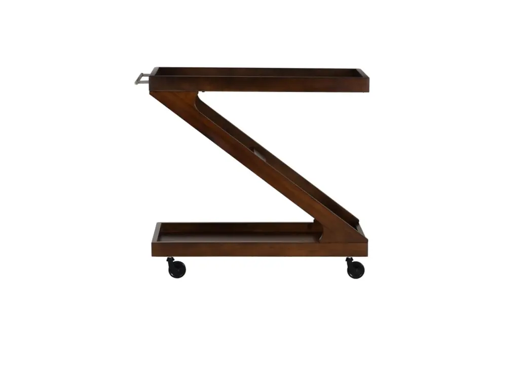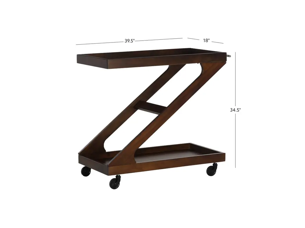 Elevate every gathering with the captivating Z-shaped design of this versatile bar cart. Its solid wood frame, finished in warm brown hues, hosts a tempered glass top and a walnut veneer on the open lower platform. Effortlessly glide through any space with easy rolling wheels, while wooden borders on both levels keep your items secure. Beyond its role as a bar cart, you can transform it into a coffee station, plant stand, dining storage, or end table, ensuring style meets functionality.