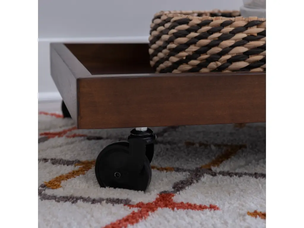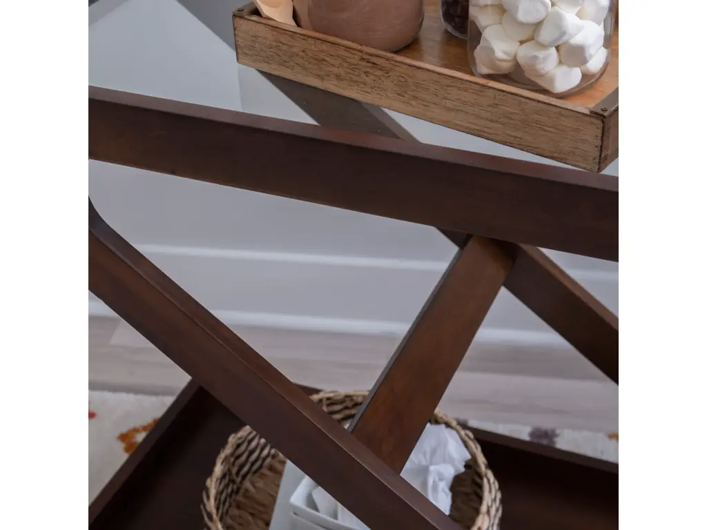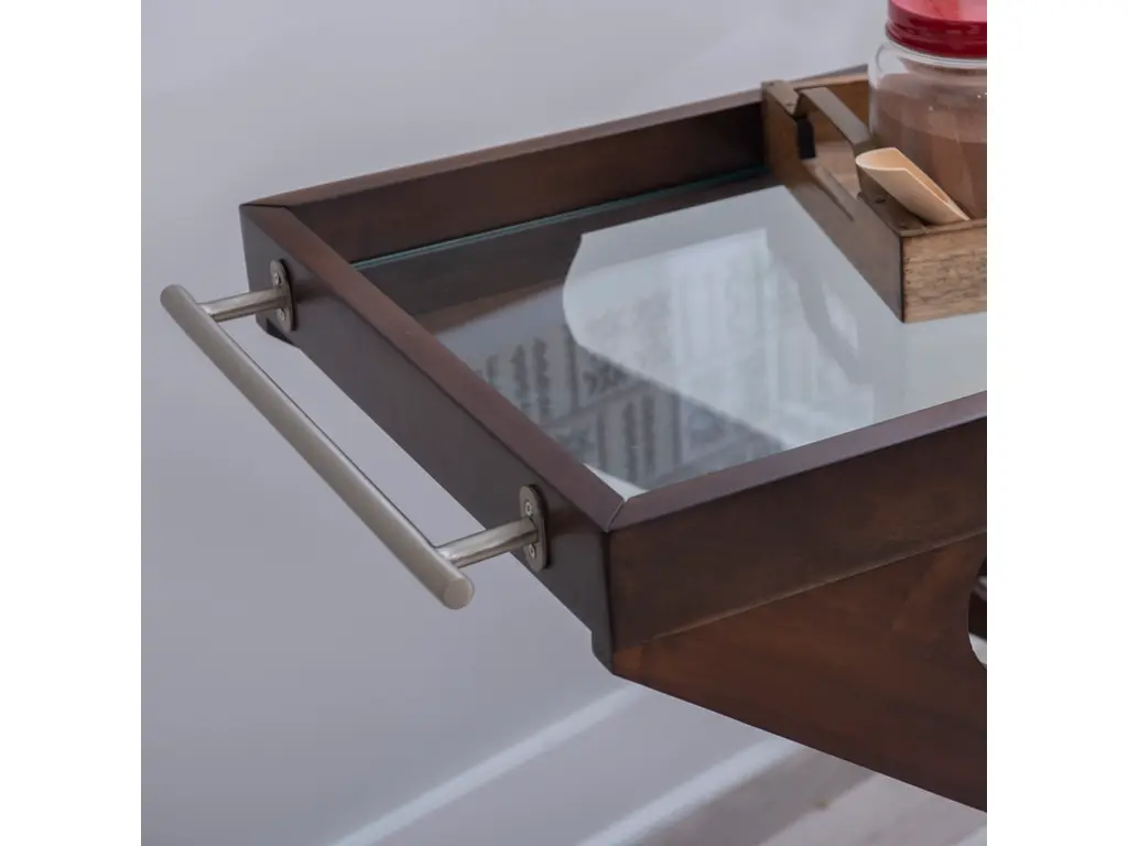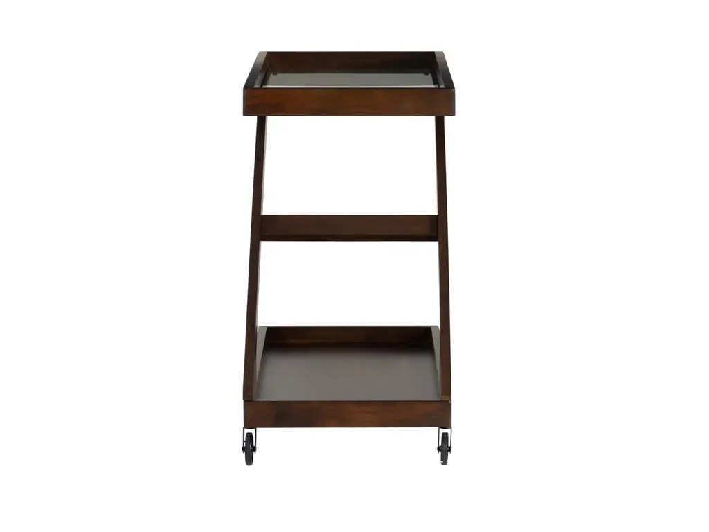 Elevate every gathering with the captivating Z-shaped design of this versatile bar cart. Its solid wood frame, finished in warm brown hues, hosts a tempered glass top and a walnut veneer on the open lower platform. Effortlessly glide through any space with easy rolling wheels, while wooden borders on both levels keep your items secure. Beyond its role as a bar cart, you can transform it into a coffee station, plant stand, dining storage, or end table, ensuring style meets functionality.