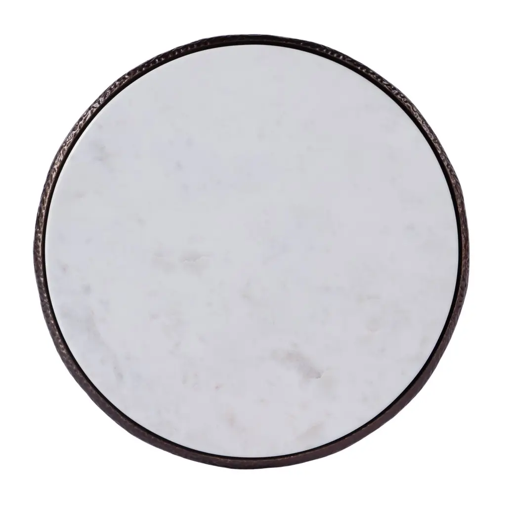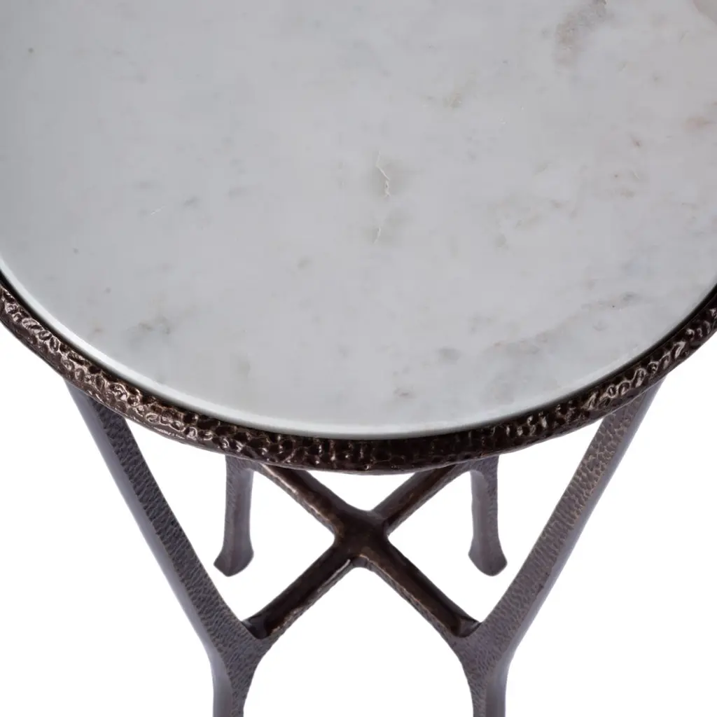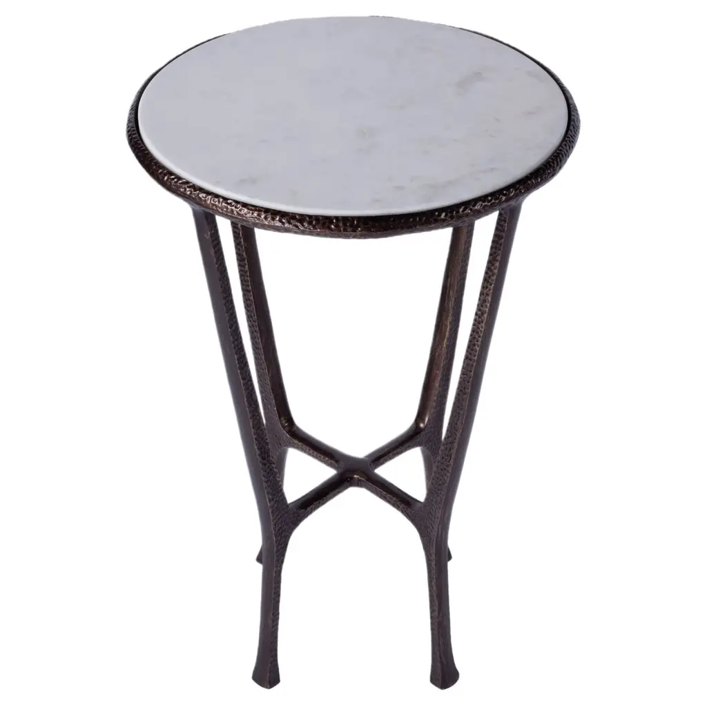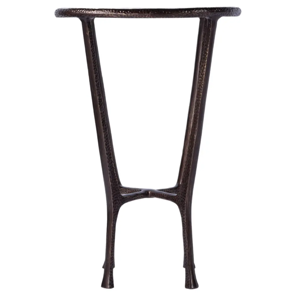Perch your freshly brewed coffee or pour a glass of wine to rest atop this gorgeous outdoor side table. The round table is expertly handcrafted with gorgeous hammered detailing and a cross-leg base. The top is just big enough to hold your mug or glass and a favorite book and has extra lacquer finish to protect it against all outdoor elements.
