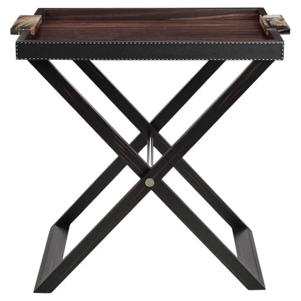 Exquisite design to keep at hand when serving guests, this pliant side table strikes with the depth of its tones and the preciousness of its materials. Distinguishing elements of its opulent design are the rectangular handles in glossy-finished horn and the tray in fine matte Amara ebon, which is partially covered with pebbled black Aida leather and finished with ivory stitched details.