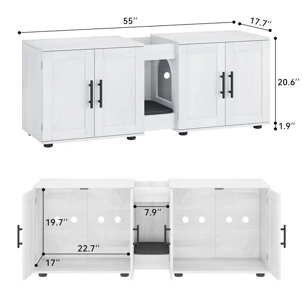 3-in-1 Multi-Functional Design for VersatilityThis double-room litter box enclosure seamlessly combines three functions: a hidden litter box, a cozy cat resting space, and a stylish piece of furniture. It works as a TV stand, side table, or decor accent, blending effortlessly into living rooms, bedrooms, or small spaces. Perfect for multi-cat households, it can separate wet and dry areas or provide individual spots for two cats, maximizing space while keeping pet essentials tucked away.Spacious & Private for Two CatsMeasuring 55¡±L x 17.7¡±W x 22.5¡±H, this large enclosure offers ample room for two cats to use the litter box simultaneously without feeling cramped. The enclosed design ensures privacy¡ªideal for shy felines¡ªwhile containing odors and reducing litter tracking across your floors. It creates a quiet, stress-free washroom where your cats can feel secure, promoting regular use and better hygiene.Easy Access & Optimal VentilationEquipped with two entry holes, the enclosure allows effortless access for your cats, while ensuring proper airflow to prevent odor buildup. A middle cat mat traps scattered litter, keeping floors cleaner, and the waterproof particleboard construction resists moisture, making cleanup simple¡ªjust wipe down surfaces as needed. This design balances accessibility with practical maintenance, keeping both cats and owners happy.Stylish, Sturdy Furniture for Any DecorCrafted from premium, scratch-resistant materials with a crisp farmhouse white finish, this enclosure doubles as a chic home accent. The barn door design adds a rustic touch, complementing various interior styles from modern to country. The sturdy top surface can hold decor, books, or small electronics, serving as a functional side table or mini TV stand¡ªideal for maximizing space in compact homes.Smart Storage for Tidy OrganizationIncluded is a built-in storage groove, perfect for keeping cat food, treats, toys, or grooming supplies within easy reach. This feature eliminates clutter, ensuring all pet essentials stay organized and hidden from view. By combining storage with a hidden litter box, the enclosure maintains a clean, odor-free home while providing your cats with a comfortable, dedicated space to thrive.