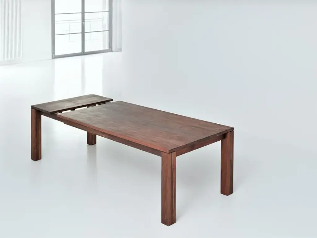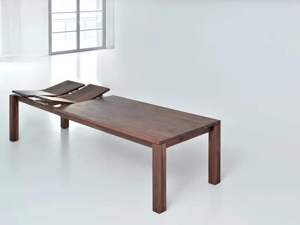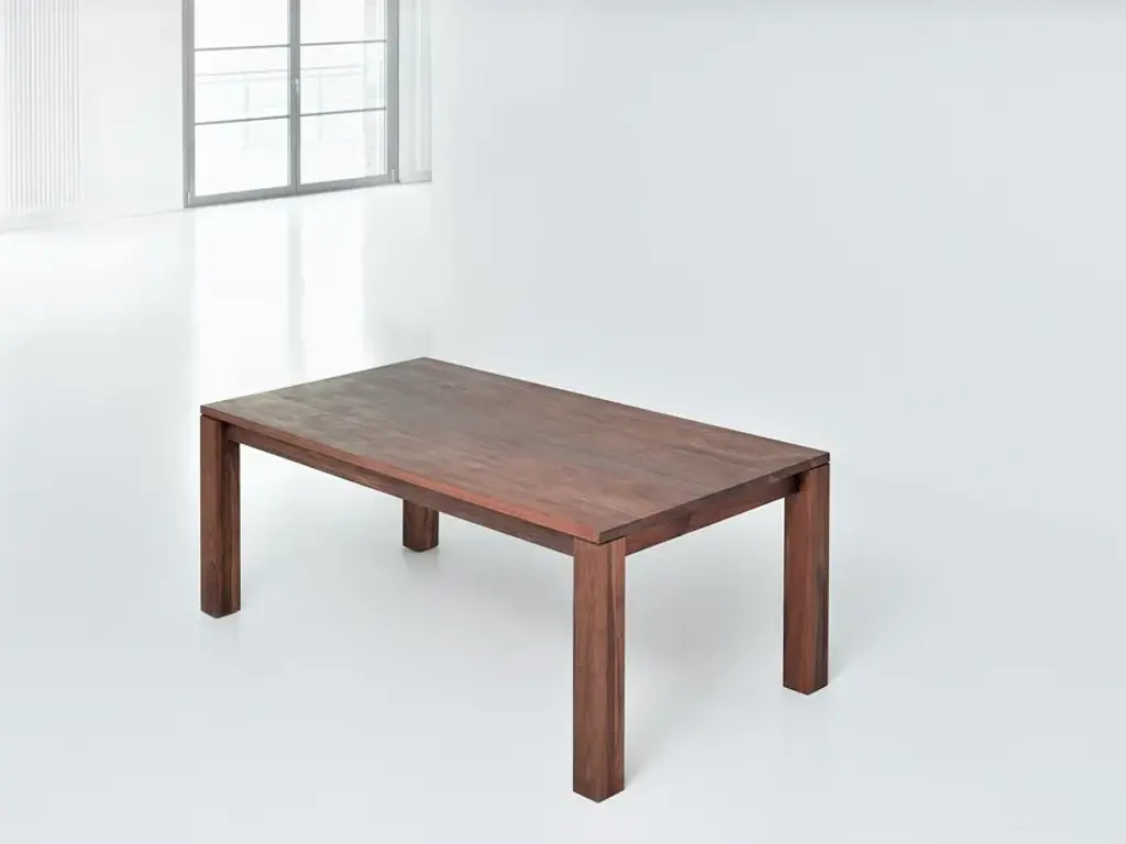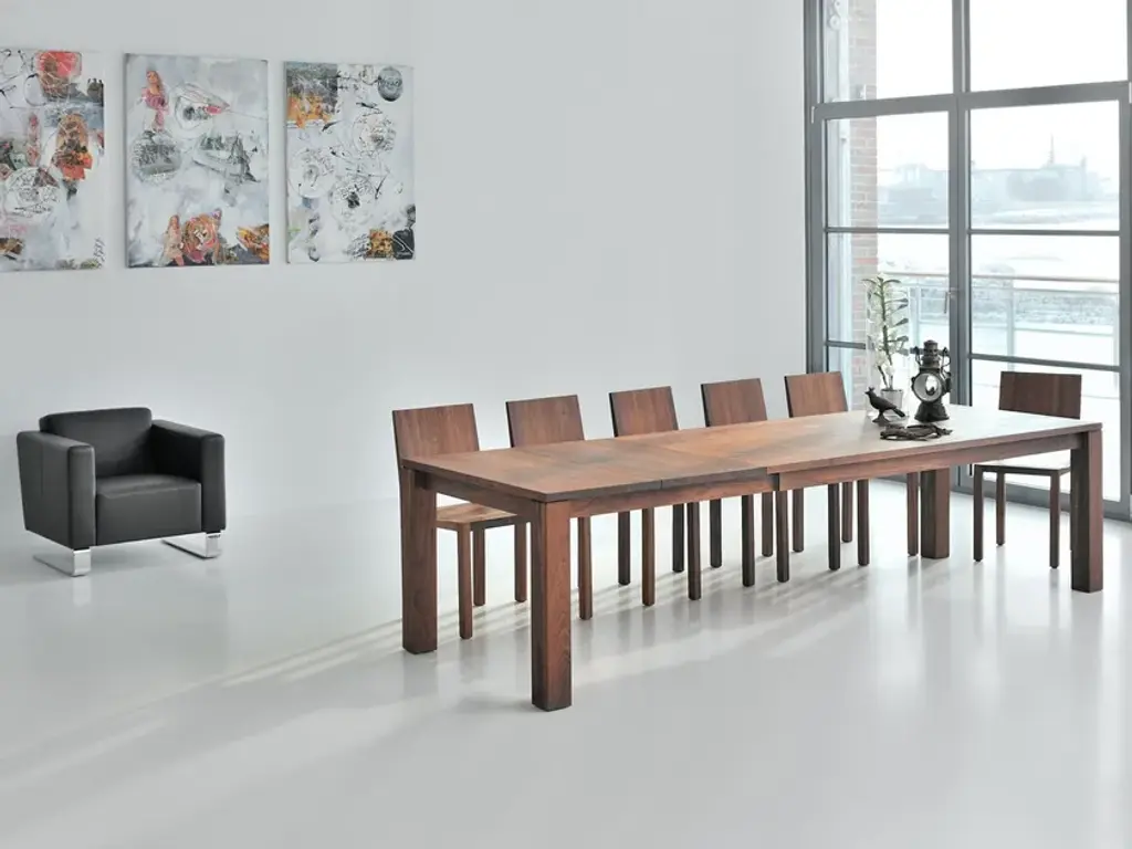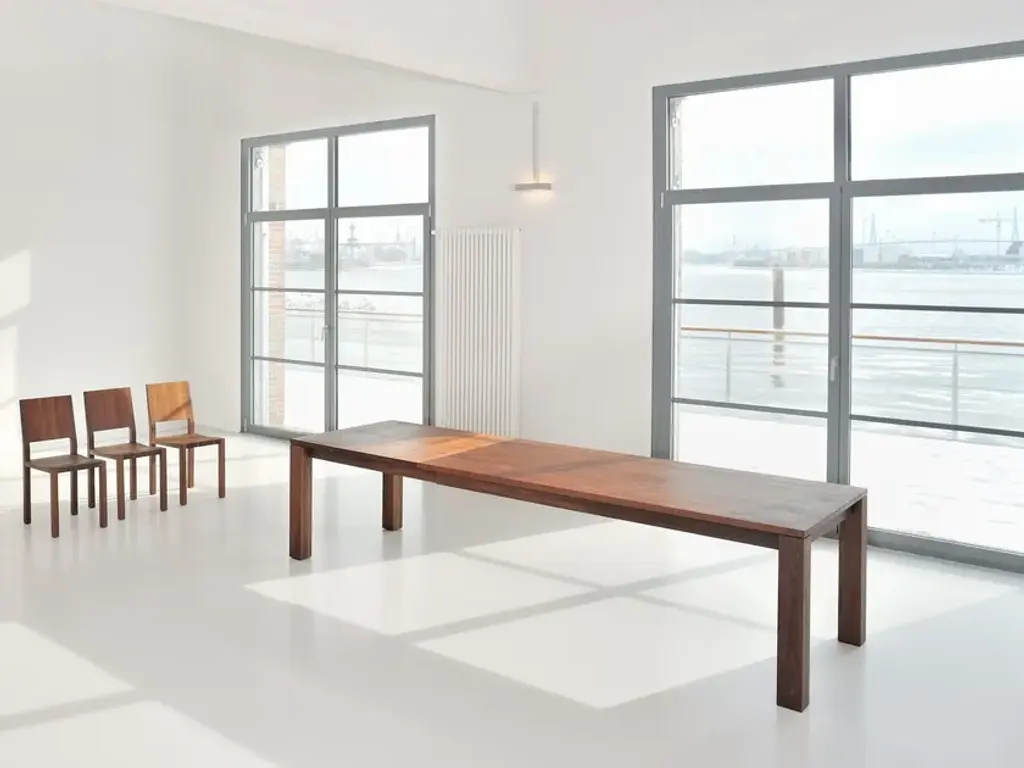 As a basis the table can be supplied optionally in ten lengths from 140 to 300 cm and three possible widths. Thanks to the Butterfly pull-out system it can be easily extended with playful lightness in one swift move up to 117 cm. With one or two folding butterfly leafs hidden inside one-handed operation technology let‘s you reach a maximum length of 417 cm.In extended mode table legs always remain at the outer edges and visually design remains unchanged. Spacious legroom is ensured in every position.Table LIVING now fits perfectly into any room. Another advantage of this smart giant is the possibility of its complete disassembly for transport purposes – thanks to this a generous dining and conference table can also be transported through narrow staircases.The LIVING model can be supplied in the following wood types:European oak and knotted oak, ash, beech, core beech, American walnut and cherry wood, treated with herbal oil.