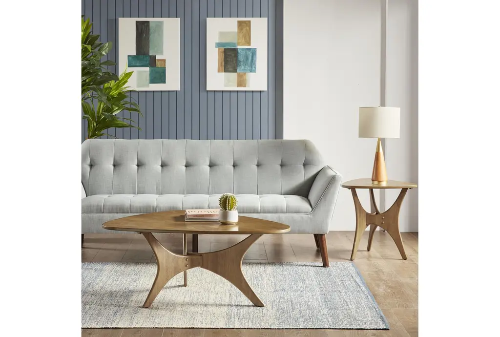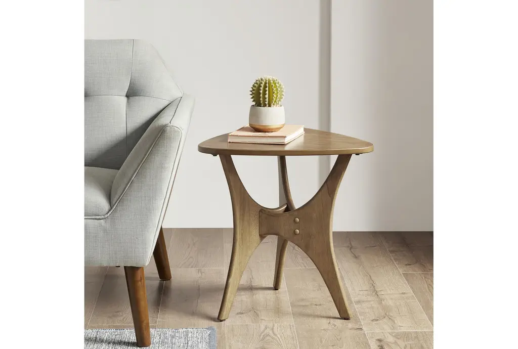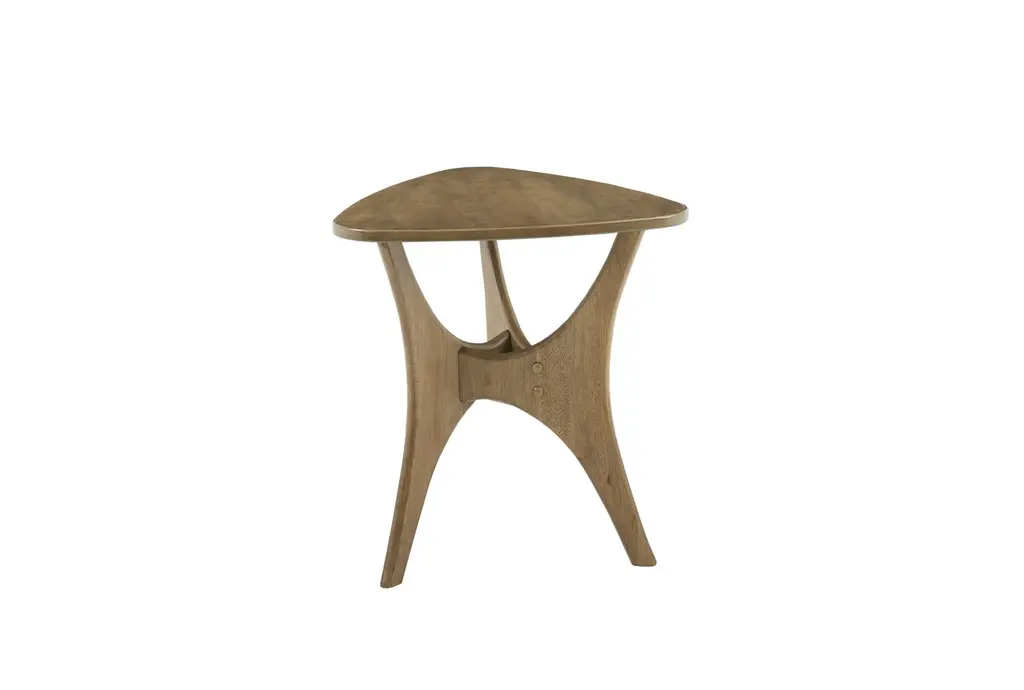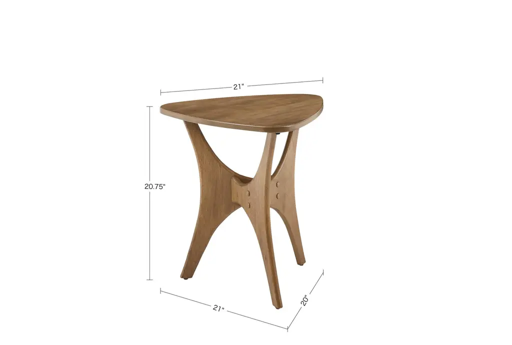The Lizzie Triangle Wood End Table is a stylish and functional addition to any modern living space. Its unique triangular shape and light brown finish make it a standout piece that complements a variety of decor styles, including Mid-Century Modern and Scandinavian. Crafted from high-quality materials, this end table features a solid wood veneer top and solid wood legs, ensuring durability and elegance. This design also serves as the perfect bedside table.