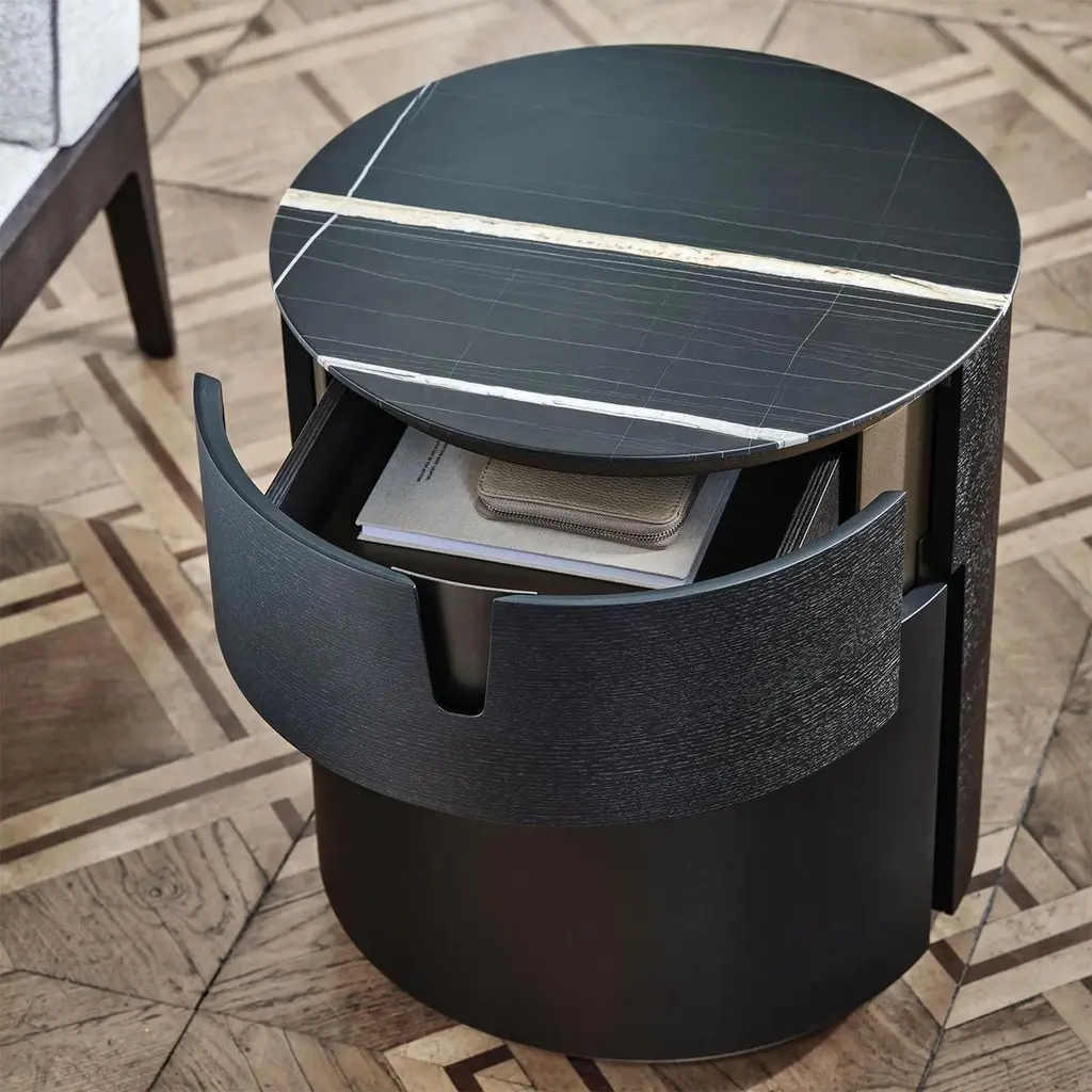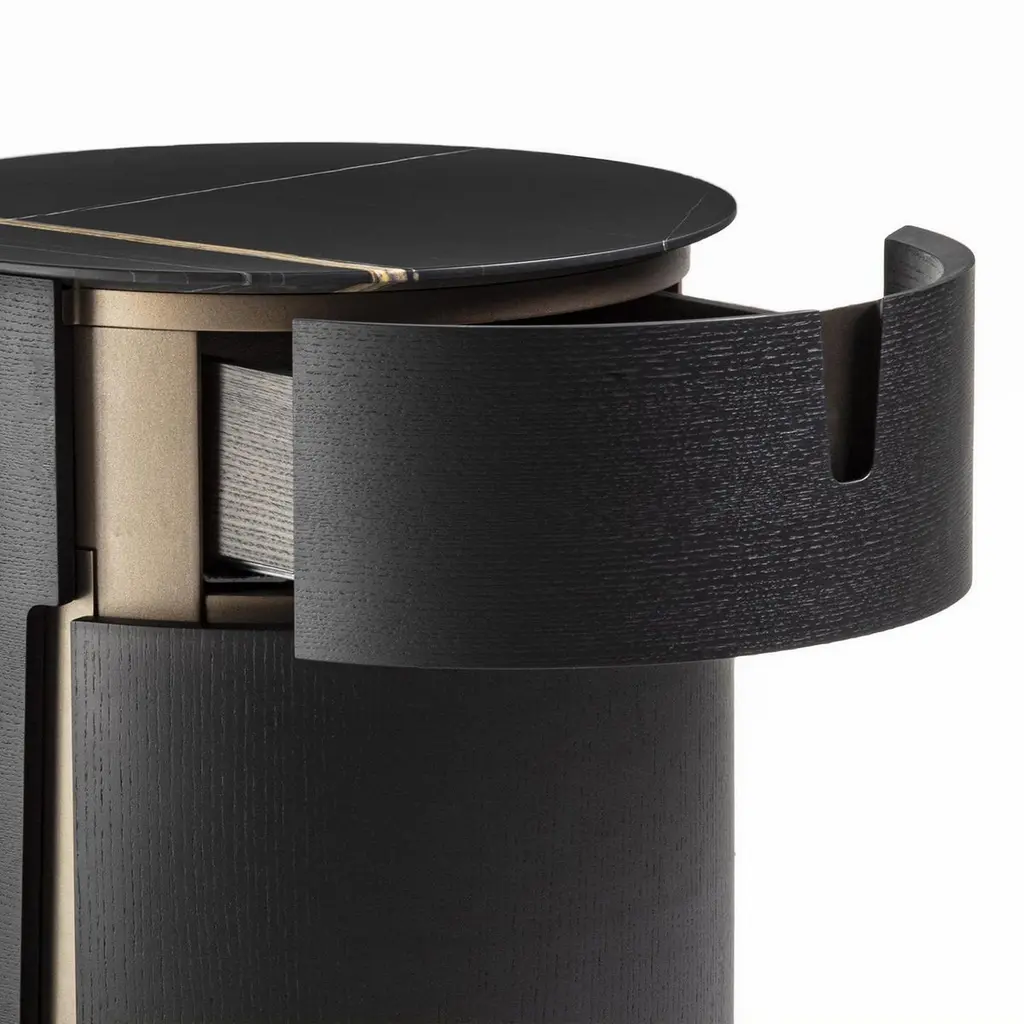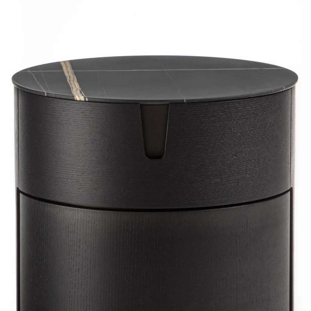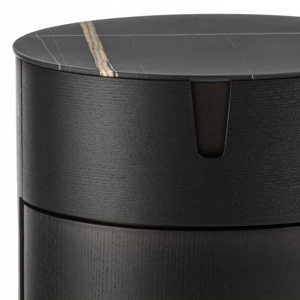 Side Table Lleno Dark Marble with all structure in solidash in dark grey stained finish. With iron structure in bronzedfinish, side table with 1 drawer with easy glide system. Withdark marble polished top.Also available in solid walnut wood and other marble top finish,on request.
