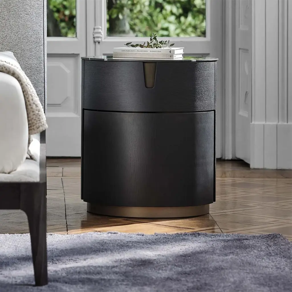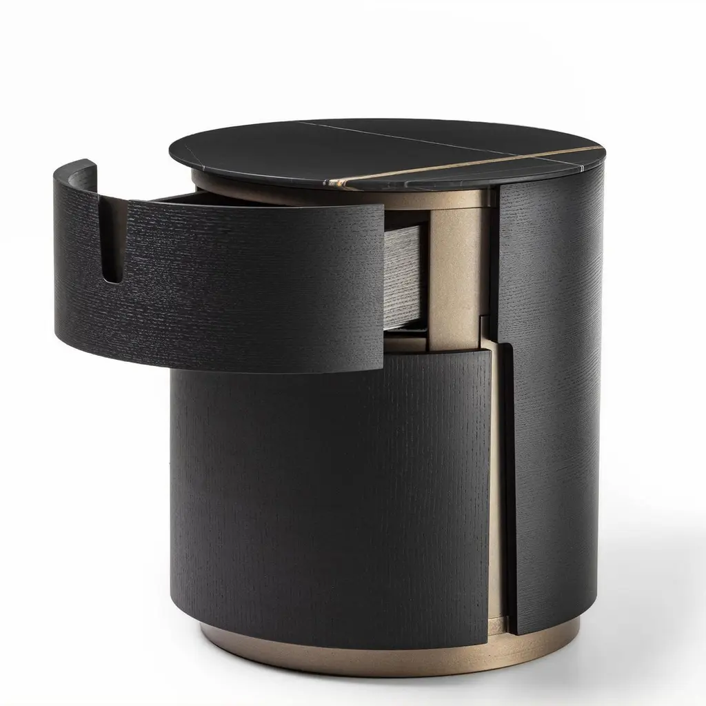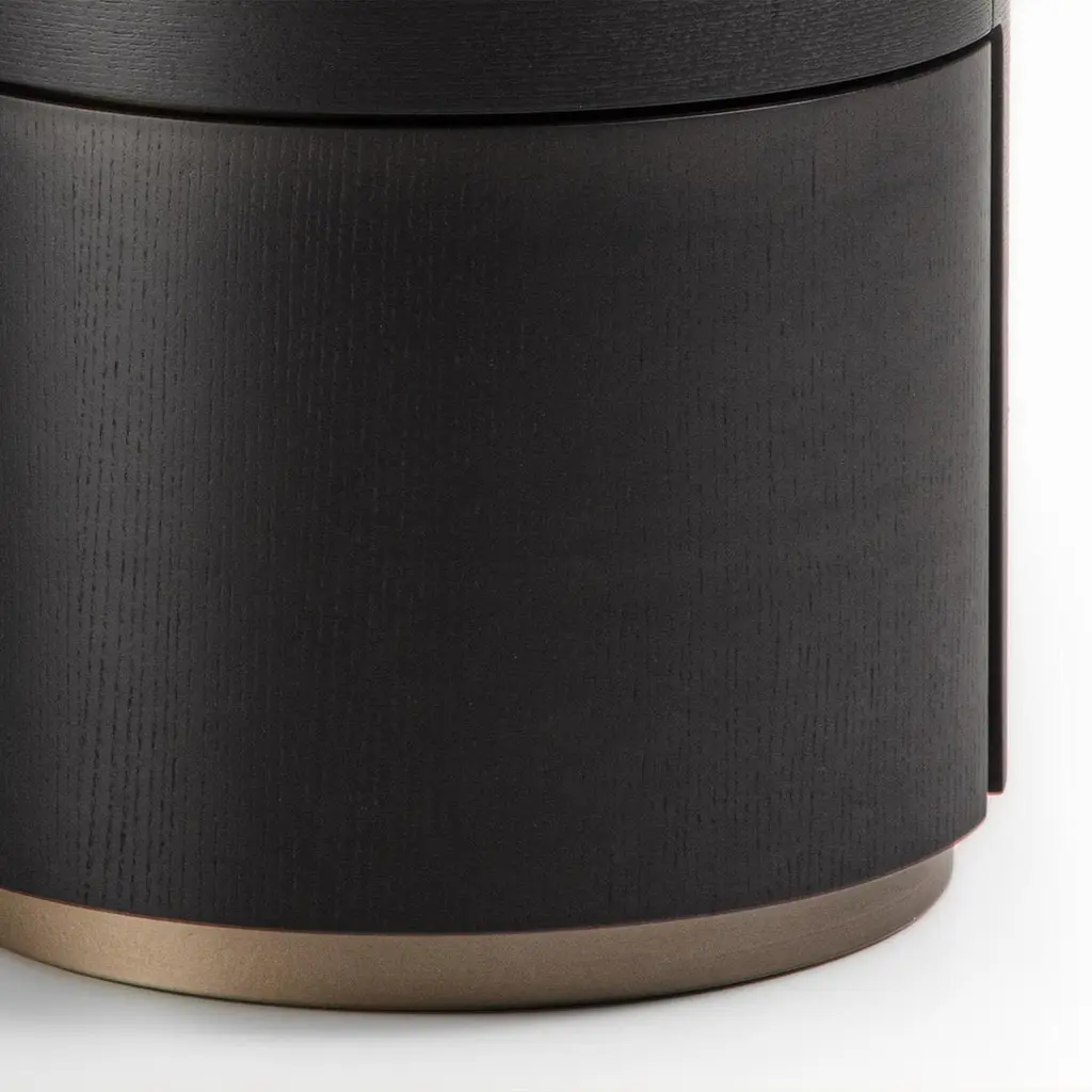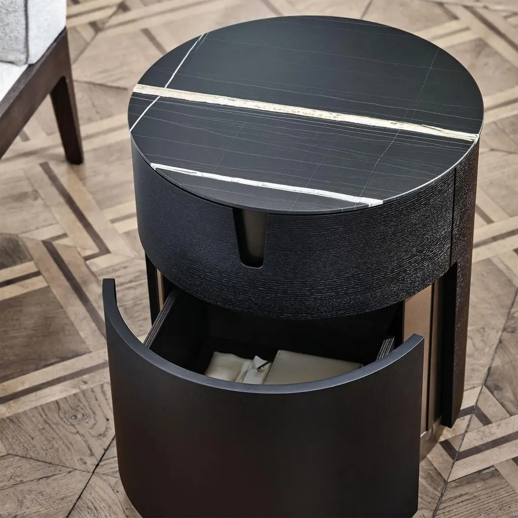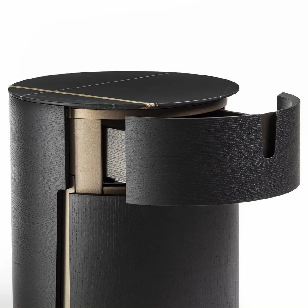 Side Table Lleno Dark Marble with all structure in solidash in dark grey stained finish. With iron structure in bronzedfinish, side table with 1 drawer with easy glide system. Withdark marble polished top.Also available in solid walnut wood and other marble top finish,on request.
