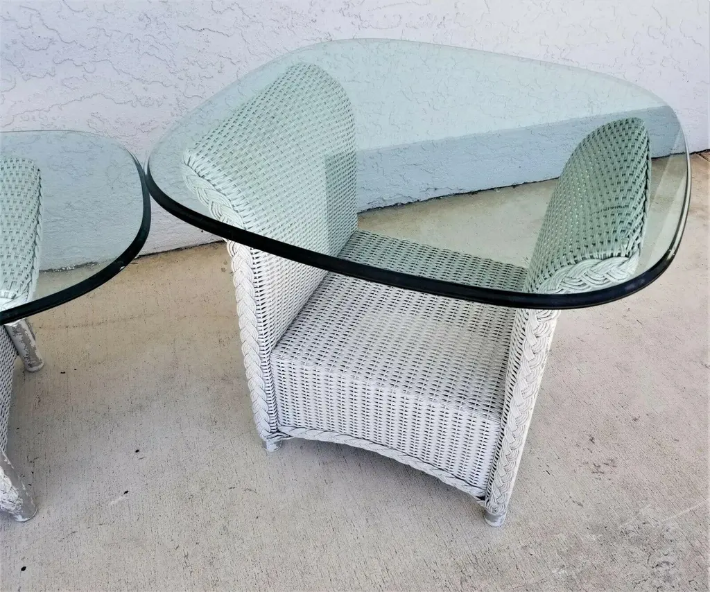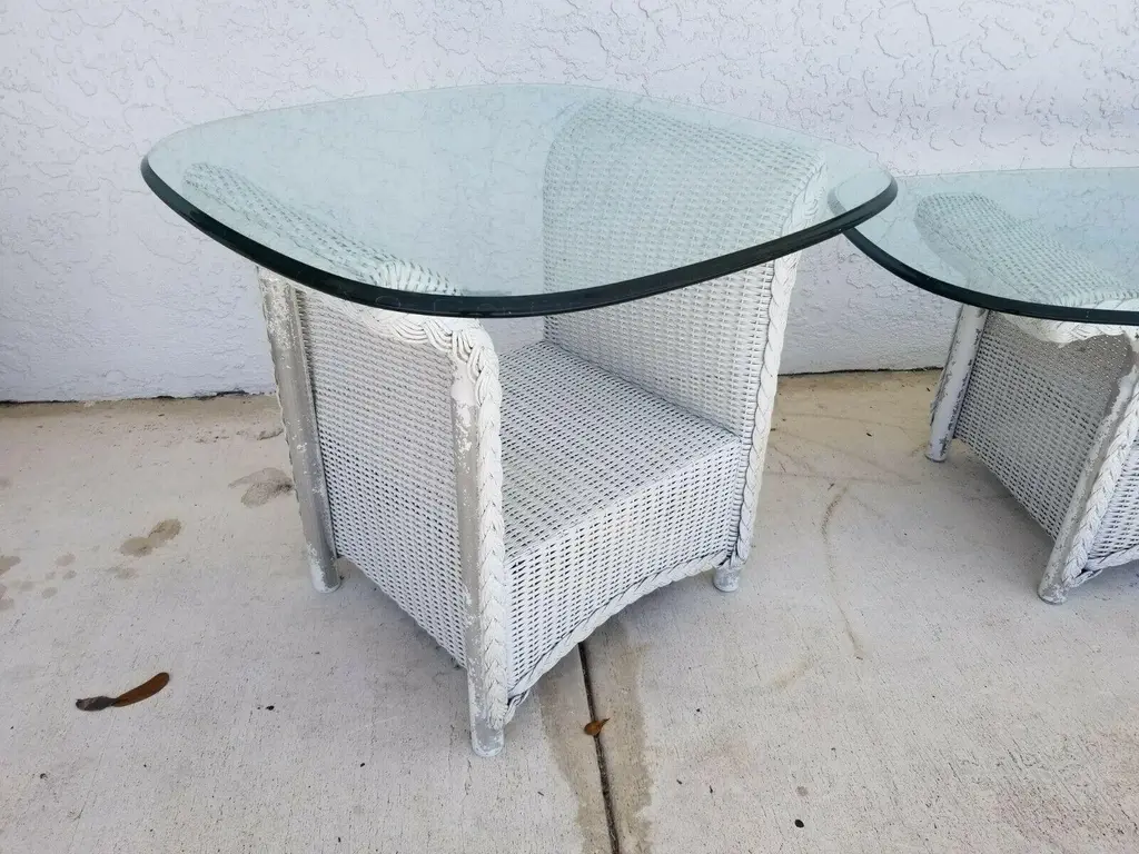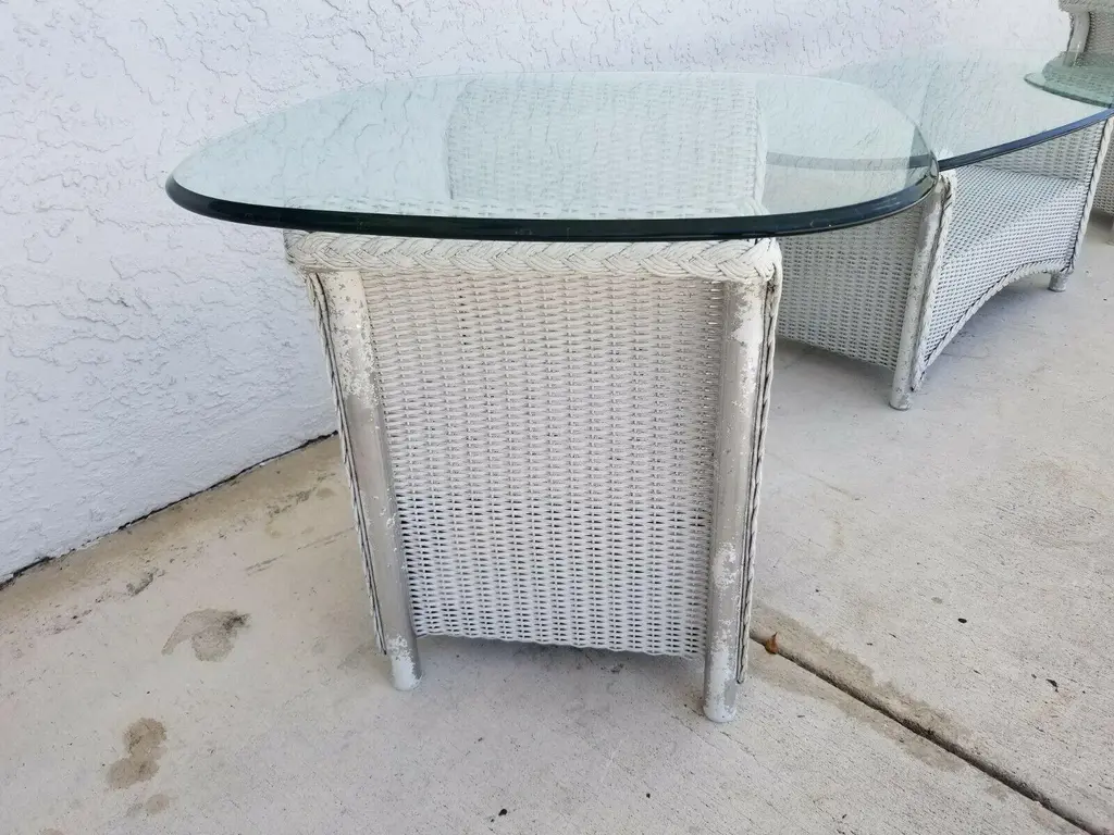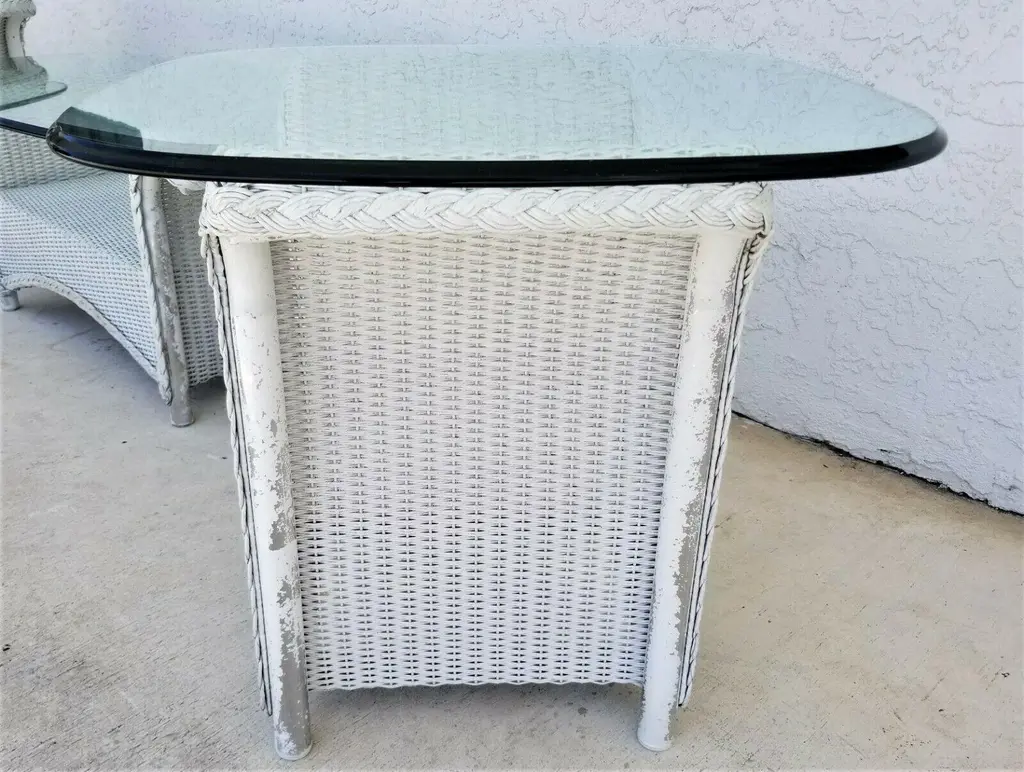 Offering one of our recent Palm Beach Estate Fine Furniture acquisitions of a Vintage Lloyd Flanders Loom Wicker Weather-Resistant Side Table with the original Ogee Edge Glass Top. Approximate Measurements in Inches Side Table: 24" x 24" across glass top x 20 1/2" high Condition Structurally sound and sturdy. The original Ogee edge beveled glass top may have some scratches. No breaks in wicker with some loss of paint mostly on metal legs as shown. Glass may have some scratches. We have the matching coffee table and many other similarly styled furniture listed including a Set of 4 LLOYD LOOM Wicker Over-sized Weather Resistant Armchairs with Sunbrella Cushions and another 5 piece set in brown. Local delivery and pickup available.
