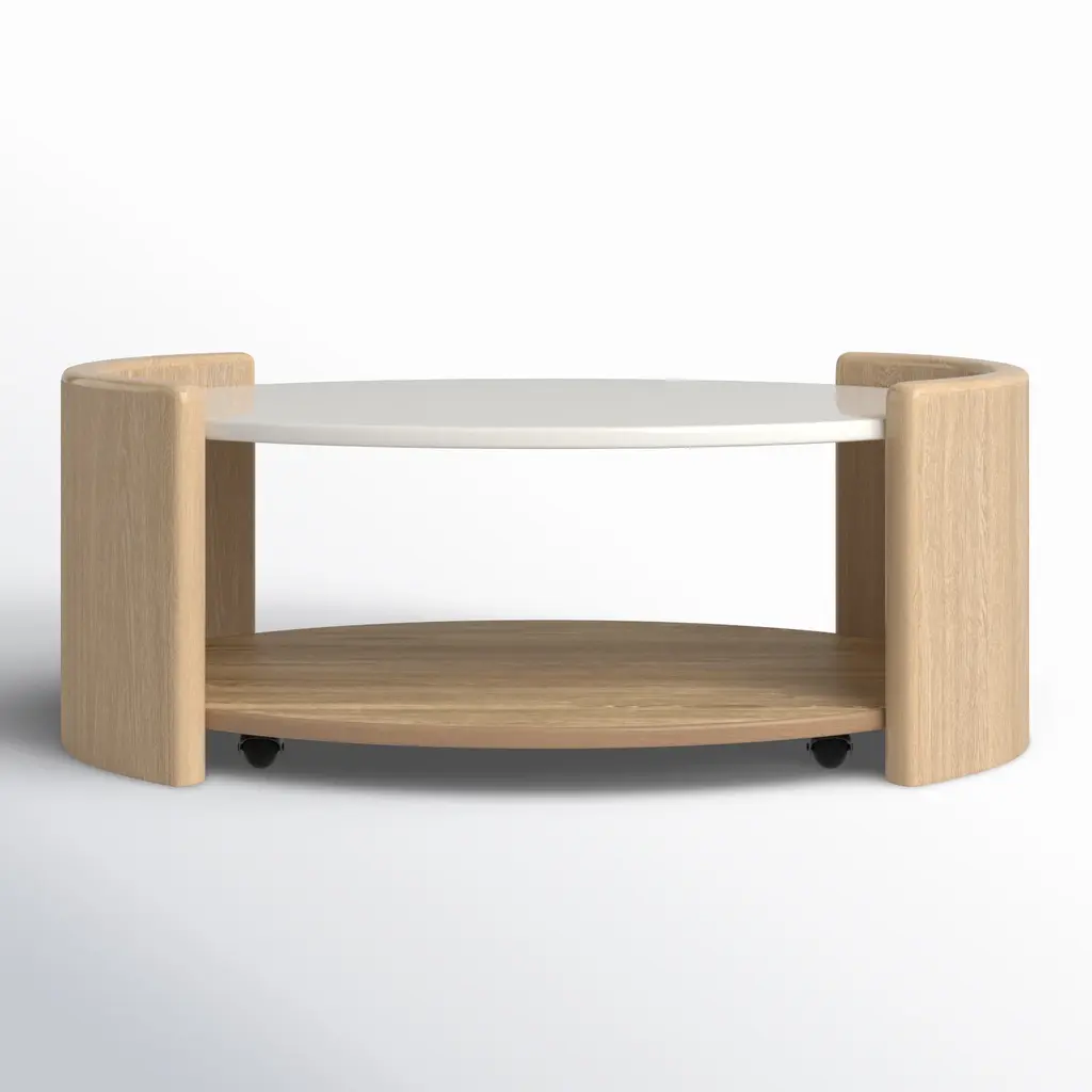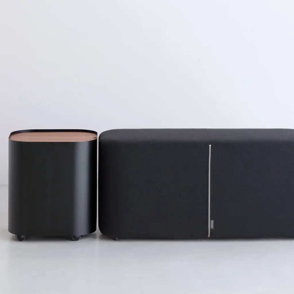 To complement his upholstered bench, designer Keiji Takeuchi adds a similarly shaped side table with the easy maneuverability of rolling casters. Fashioned in powder-coated steel with an inset tabletop in oak or walnut, Loaf has the same rounded contours as the seating. Small handles at the sides also underscore its adaptable utility.