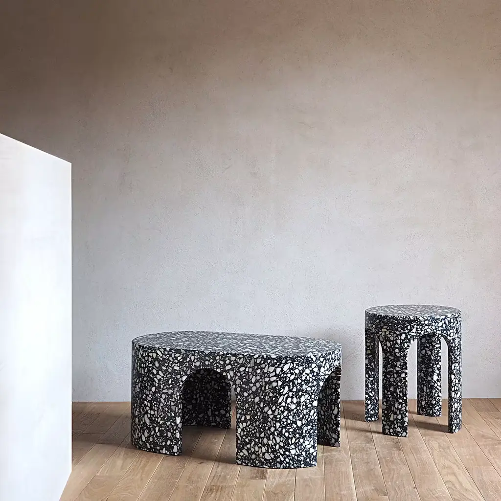 Hot on the scene, terrazzo has been an integral part of Italian homes for centuries, starting with Renaissance palaces. The Loggia Side Table uses the material in a whole new way, paying homage to classic Italian archways, inspired by Greco-Roman architecture. The terrazza side table, in marble and resin grit, is available in two different colors. A coffee table is also available.