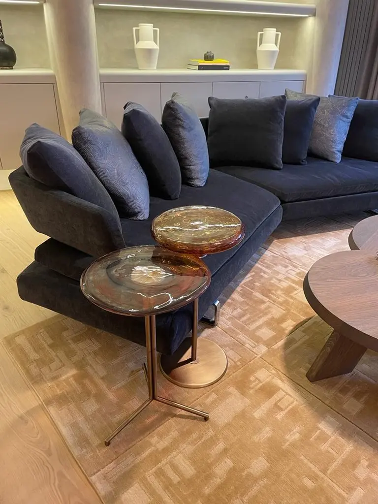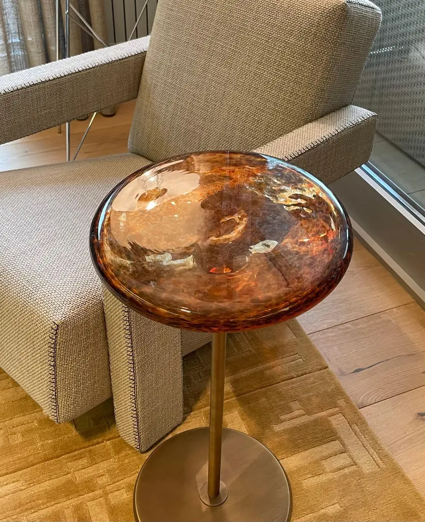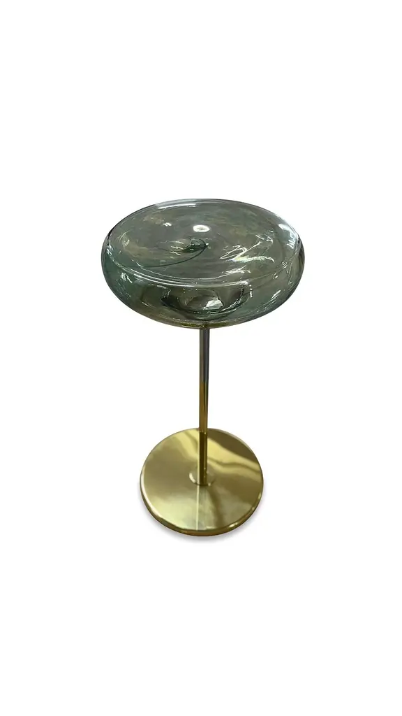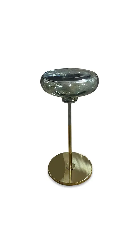 Lollipop Side Table by Ekin VaronDimensions: Ø 27 x H 57 cm. Materials: Blown glass, stainless steel and gold pyd titanium plated stainless steel or antique plated metal.Available in different colors and base options. Please contact us.Lollipop is more than a side table. It’s an object of desire. Even the same-colored ones have many different versions with sub-colors. For the glass part we collaborated with sculptor Tina Varon. The upper part of the side table, produced with the blown glass technique, stands out with its different color formations and the depth it creates. Feet are made of gold pyd titanium plated stainless steel and can also be produced by antique plated metal.Ekin Varon is the founder and creative director of Ekin Varon Design Studio. Born and raised in Istanbul, Ekin has worked in various architecture firms and furniture design studios after completing her academic education in the furniture department of Rhodes Island School of Design. Having a sculptor mother and a father who is in the textile business, Ekin grew up having appreciation of various artistic disciplines and a desire of creative expression. In 2020, former co-founder of 15 West Studio, founded Ekin Varon Design Studio. Interdisciplinary art is at the center of Ekin’s design approach. Using various craftsmanship techniquesat at her designs, she creates multi layered, unique furniture, objects and environments. Originality is the main driver of her designs and she achieves that by creating timeless designs that harmonize modern aesthetics with traditional Turkish craftmanship.