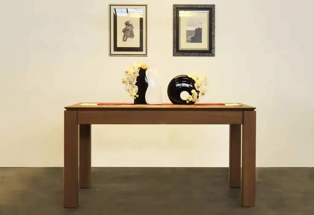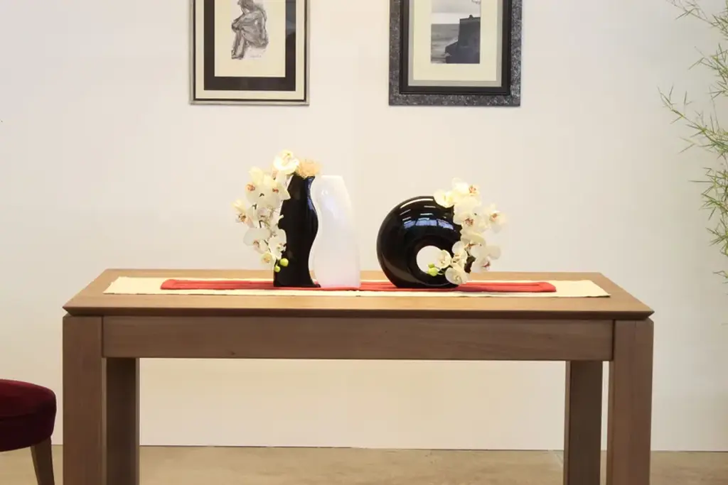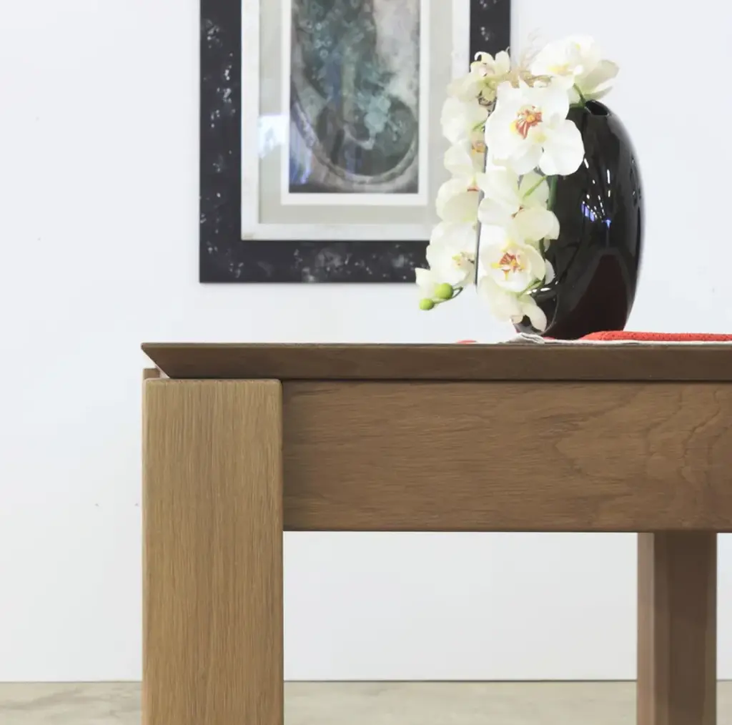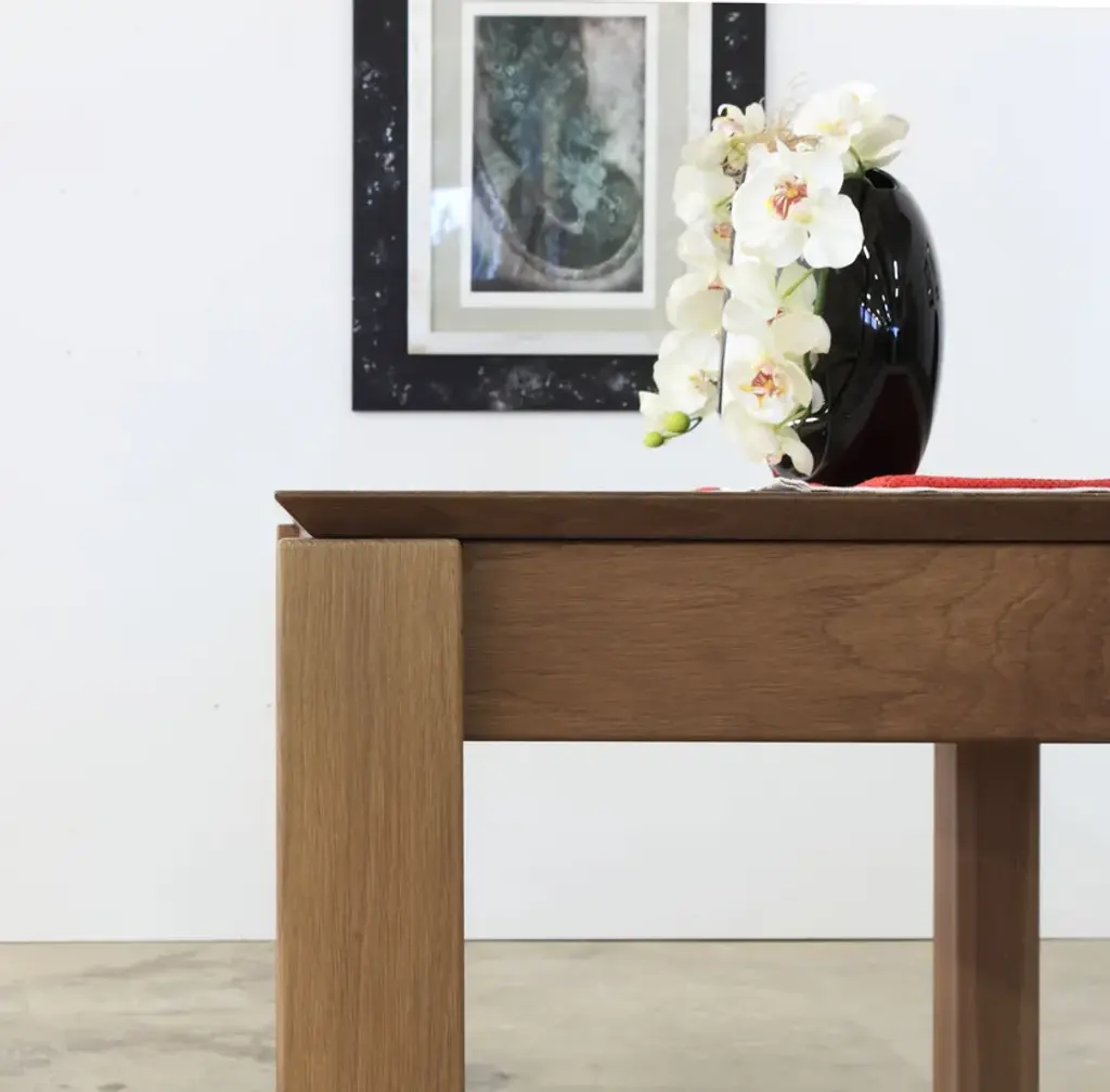 Londra is an extending rectangular oak table.This elegant table is a splendid addition to a modern or classic decor, thanks to its minimalist silhouette and the striking top, resting on four legs with a diamond-shaped edge that resembles the cut of a precious stone. Below the top, a compartment stores the extension elements that will elongate the piece to make it a versatile object suitable for a dining room of any size. Entirely crafted of durmast oak, this piece will make a statement in any decor.Squared legs are in solid wood. Dimensions are 12 cm x 12 cm.Wood finish 5310 Dark Oak5320 Light Oak5330 Grey Oak5340 Bleached OakManufacturing that shows the circular design of the trunk sections, diagonal joints that underline the veins' dynamism and the craftsman's skill, or logs that take shape and acquire meaning by subtraction of matter: thus Wild was born, a collection enhancing the beauty of natural wood. The collection includes furnishing for the living area, as well as ornaments and accessories to decorate walls, such as the Otto and the Pebble shelves.