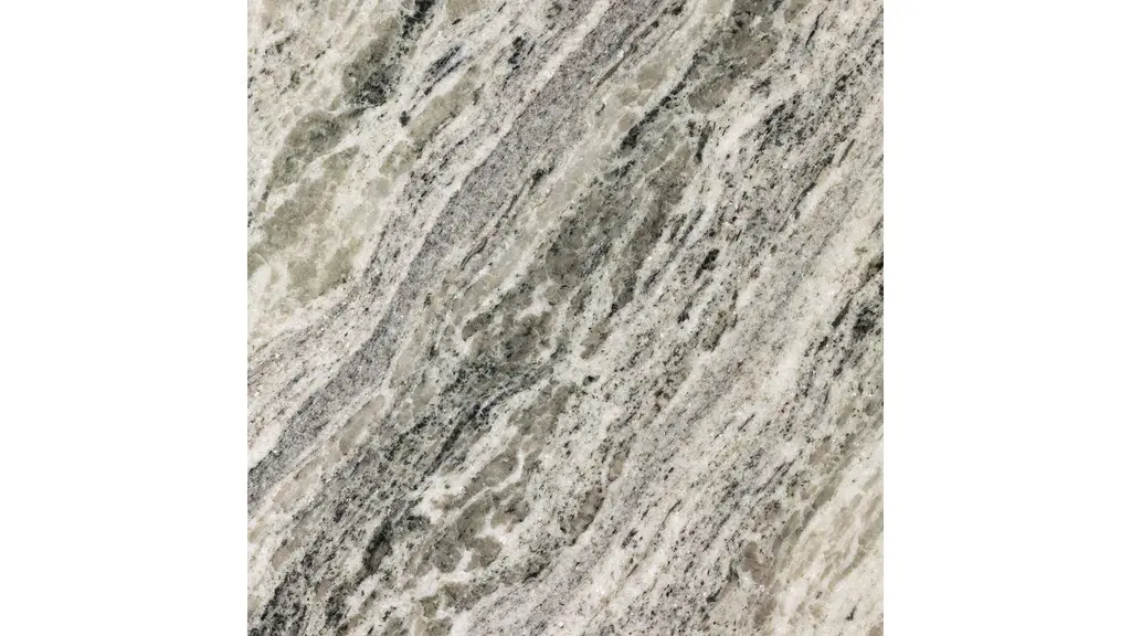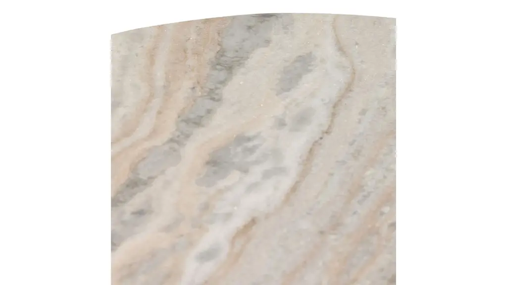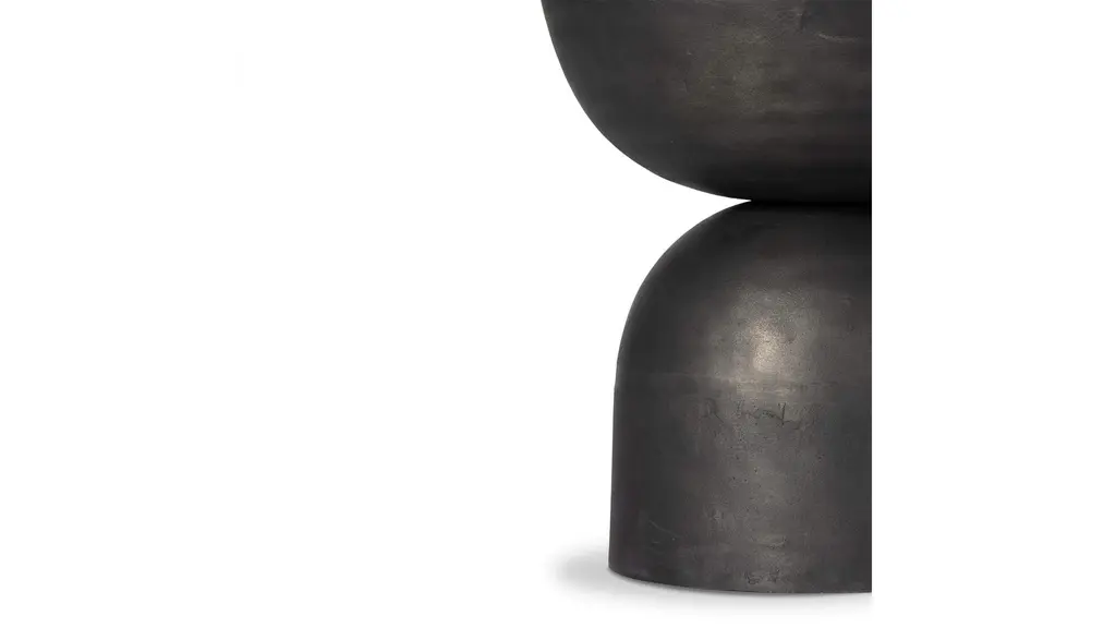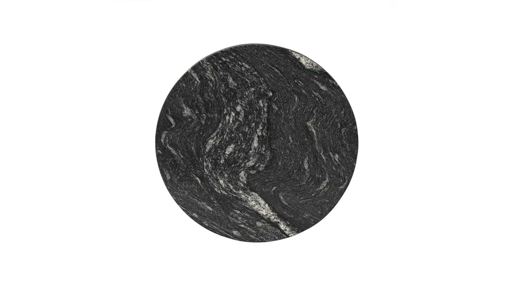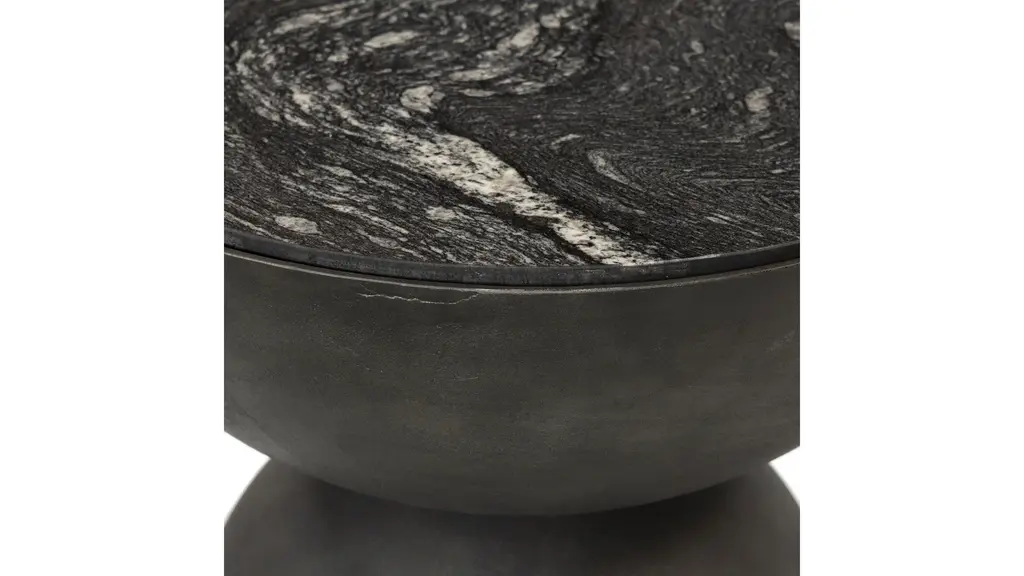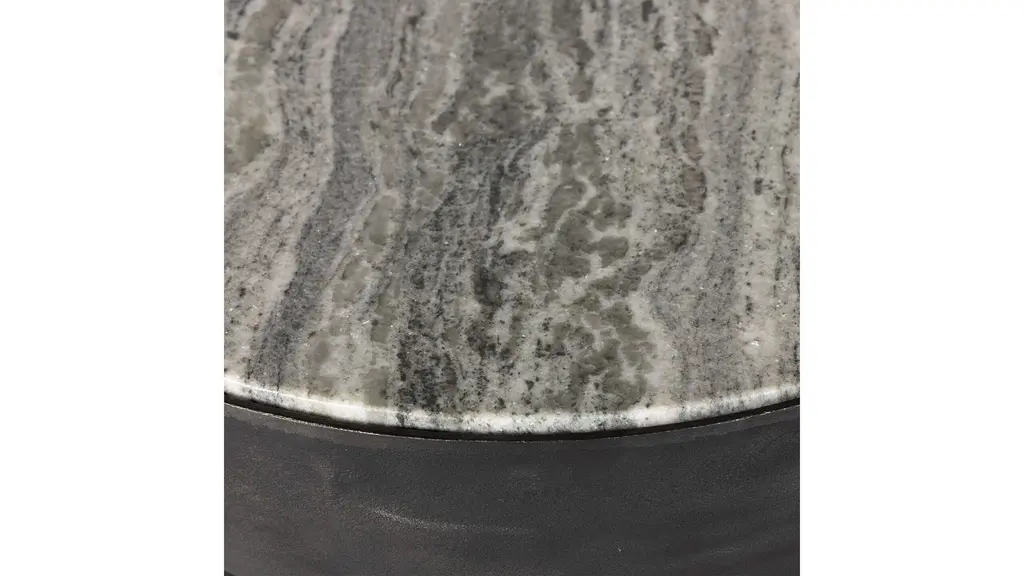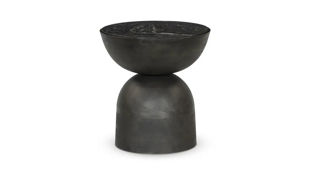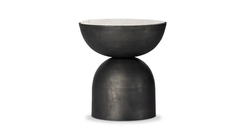 A sculptural play on shape. Hammered grey-finished aluminum base supports a rounded tabletop of grey marble with natural veining. Made in India.