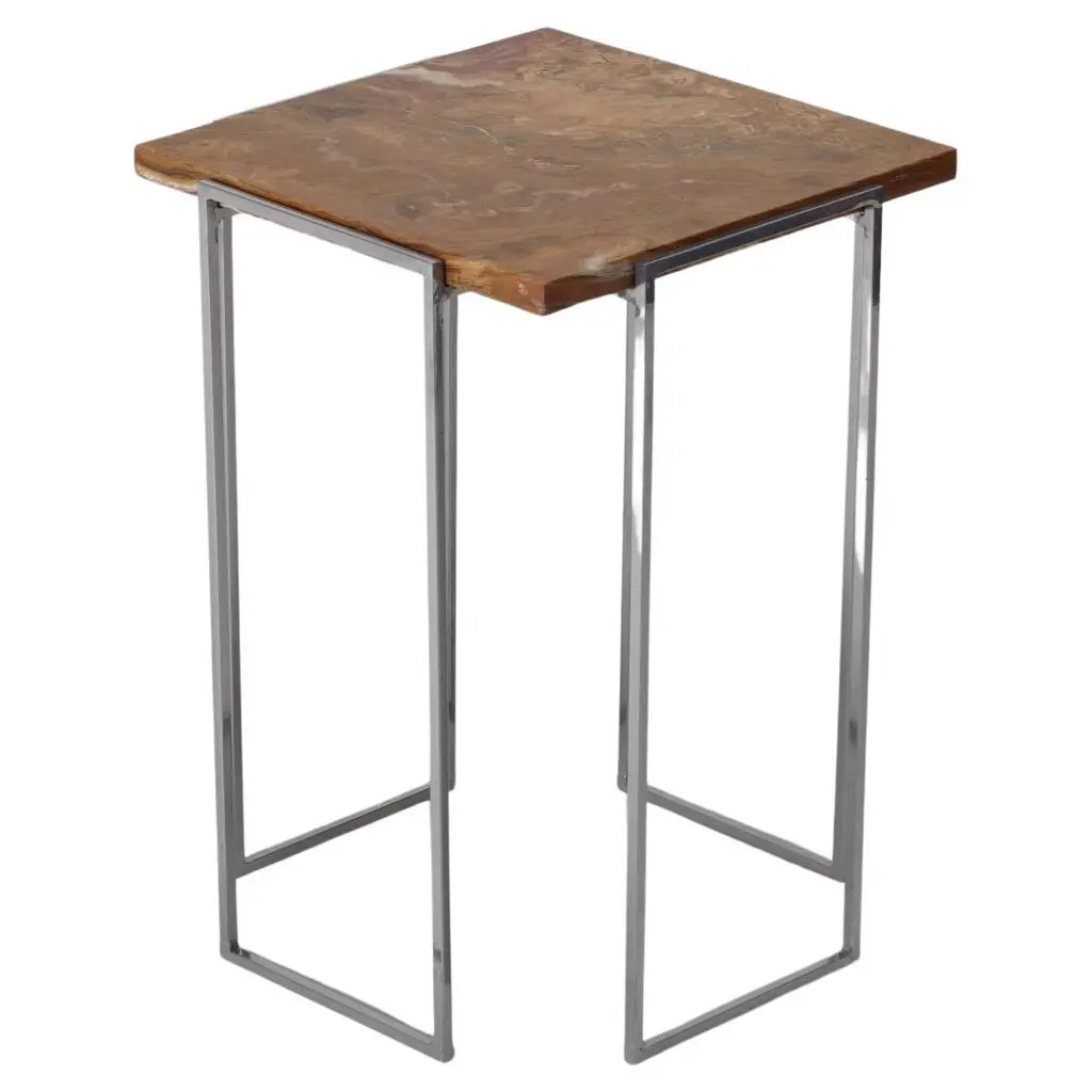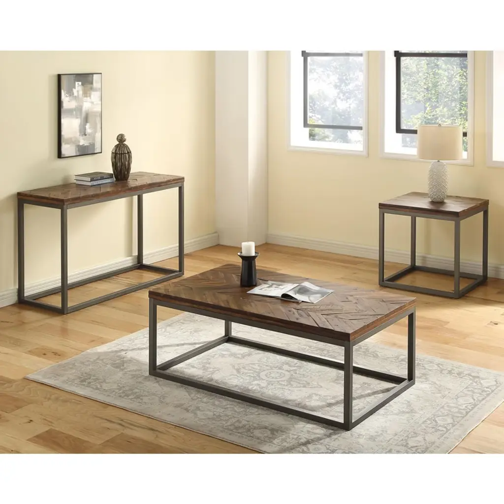 Rustic, casual design with a splash of industrial stylingConstructed of solid acacia wood tops and metal baseStyling details include distressed top in chevron pattern with a natural honey finish and sturdy metal support baseRustic casual styling available in cocktail, end or sofa table