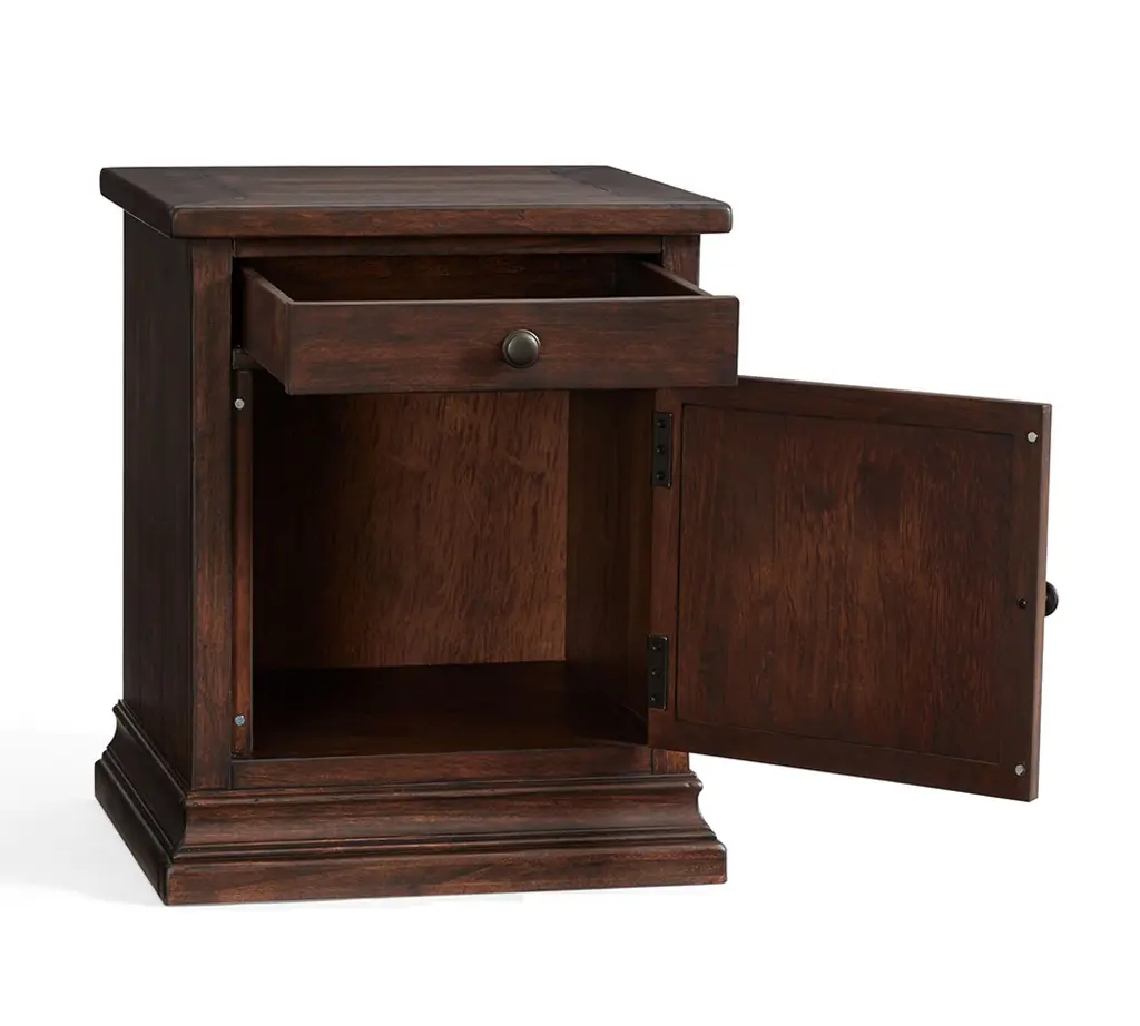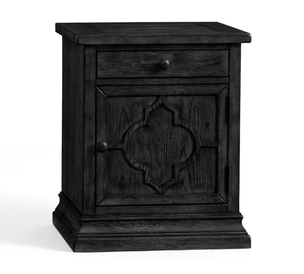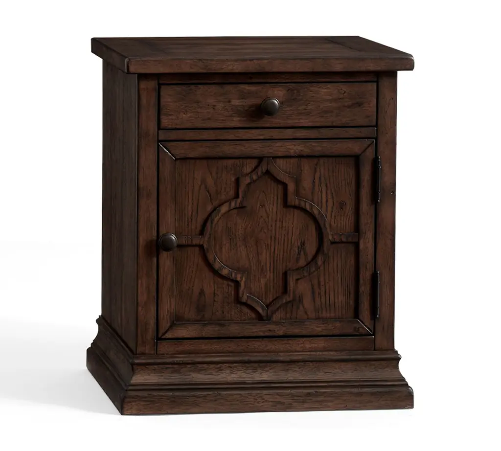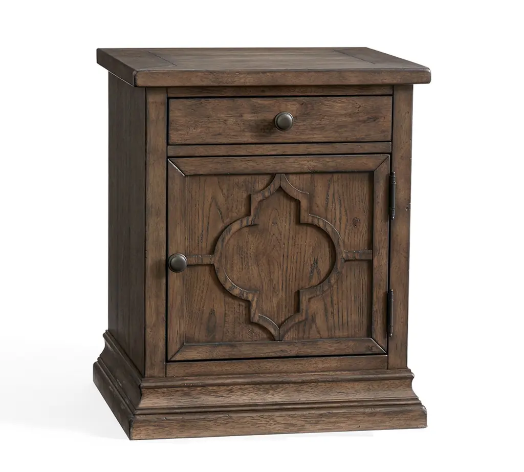 Frame-and-panel construction with mitered corners attests to the rustic good looks of this end table. Part of our Lorraine Collection, it’s inspired by traditional Spanish furniture, built in a bold scale with a quatrefoil overlay on the front and resting on a plinth base.