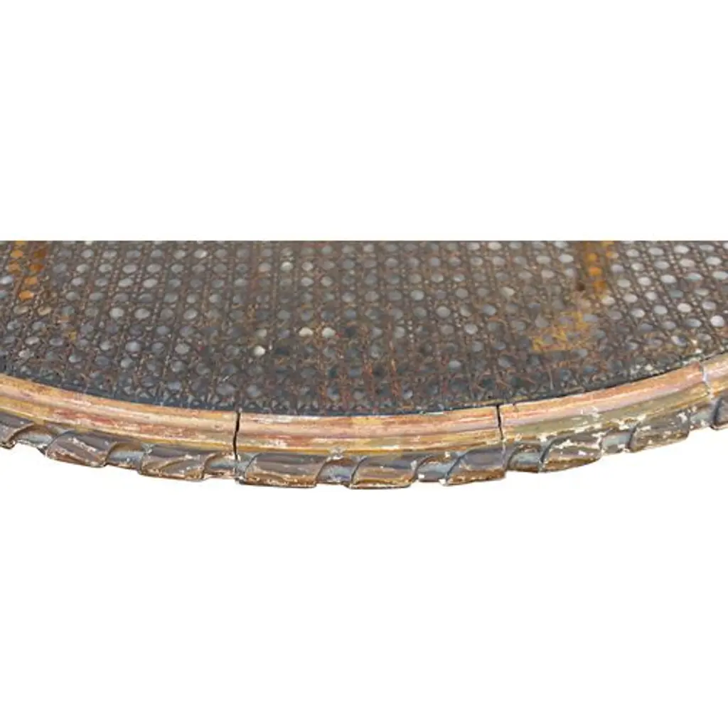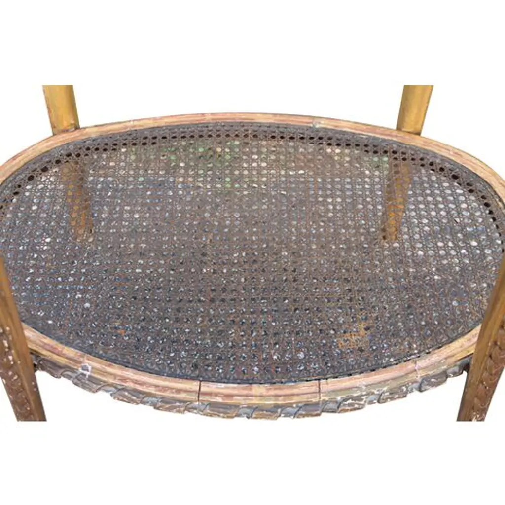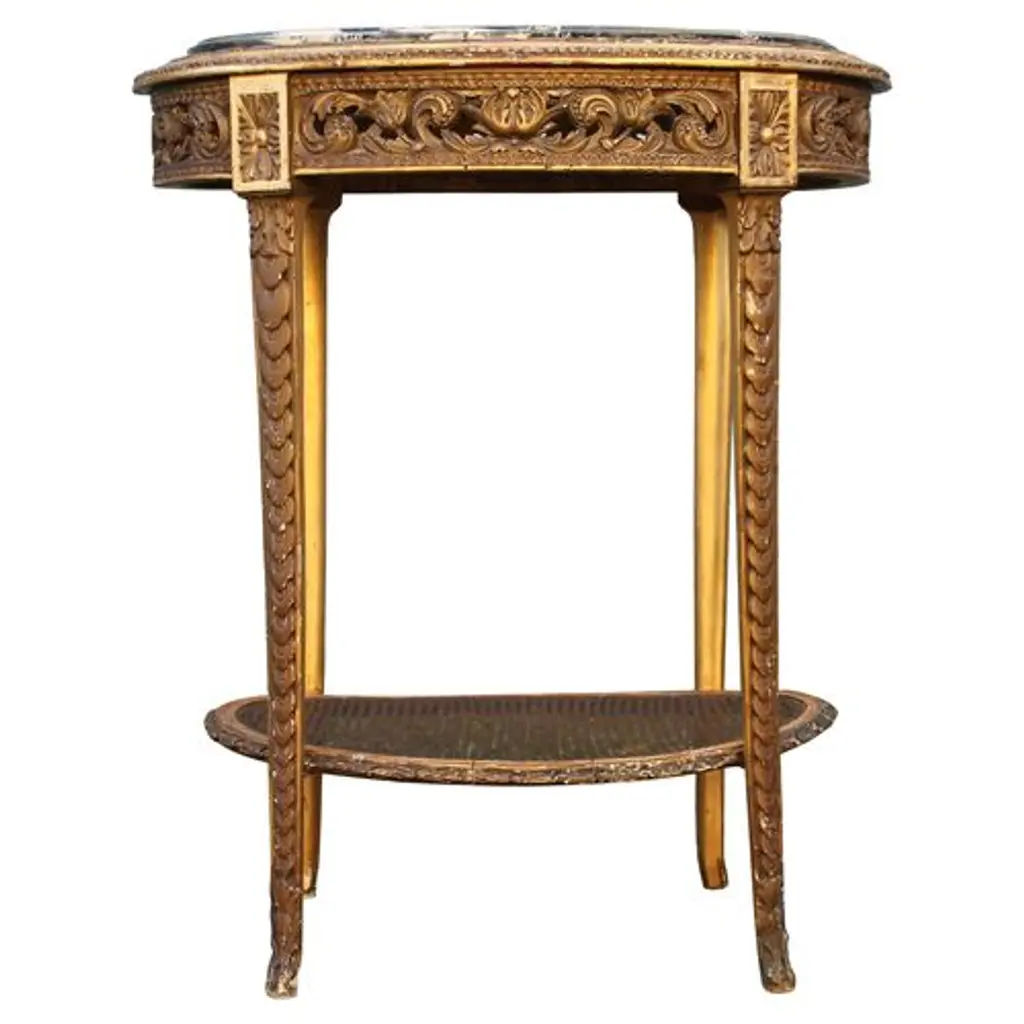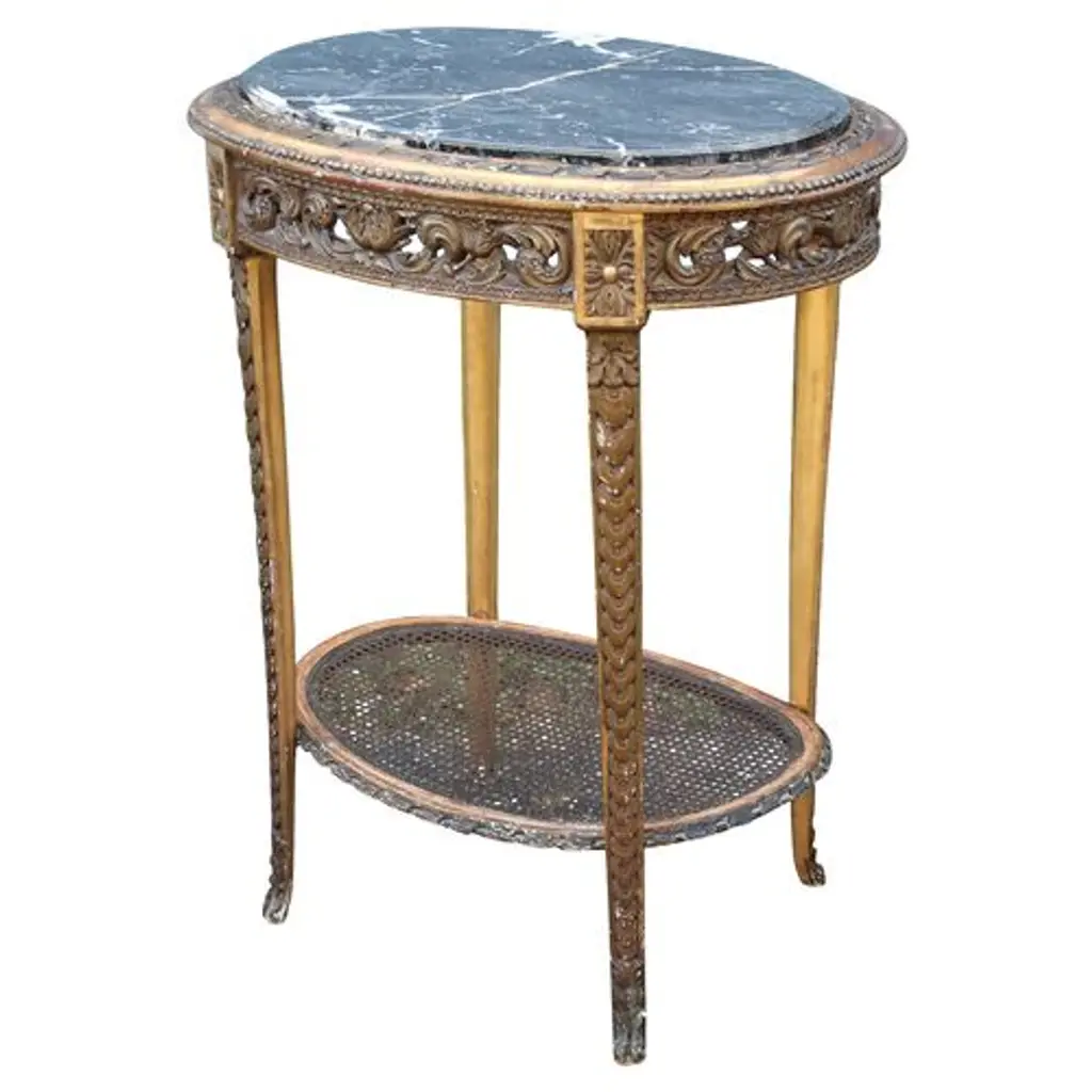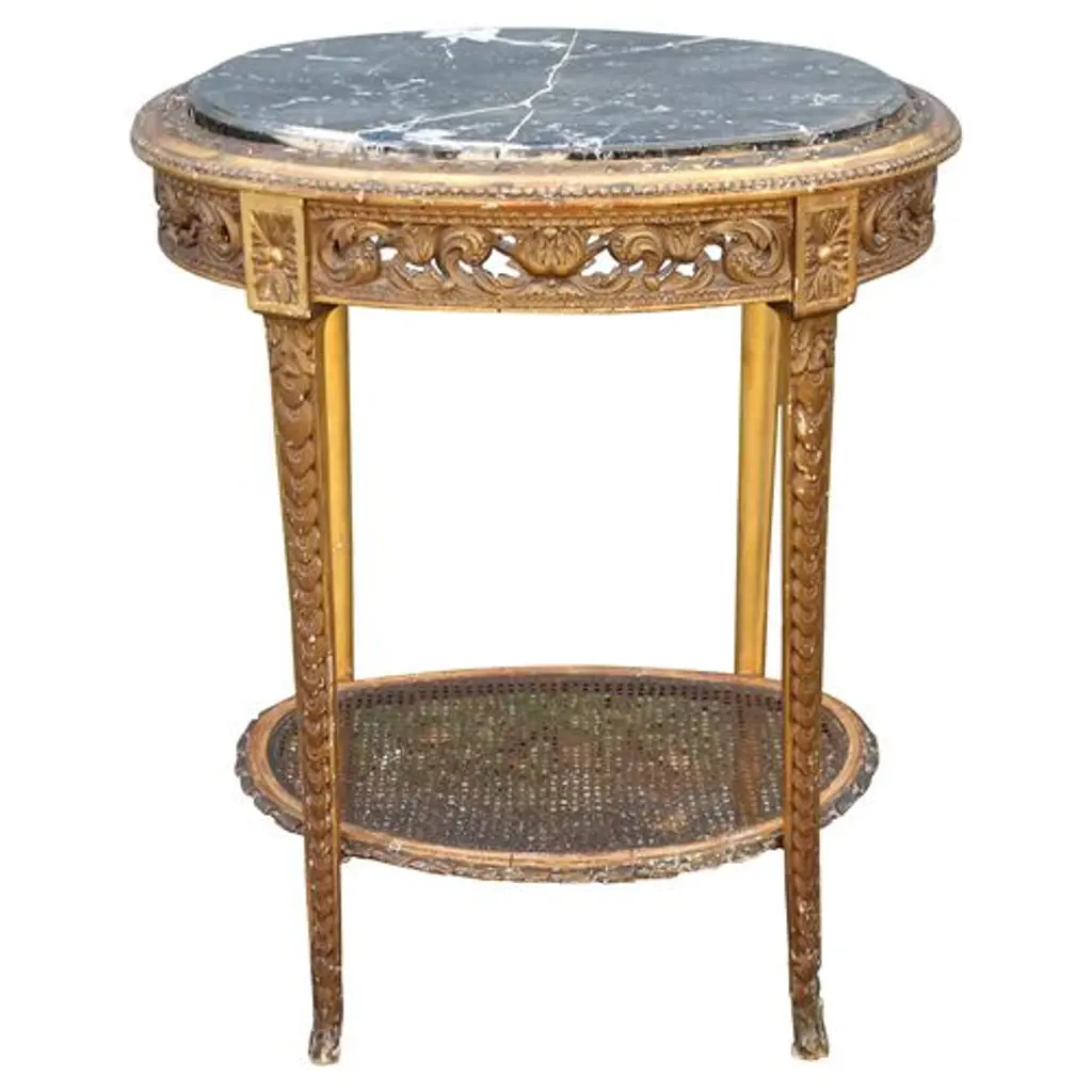 Circa 1850 Louis XVI-style heavily carved giltwood-and-gesso side table finished with a caned lower shelf and marble top. Age wear and nicks to the gilt gesso finish.