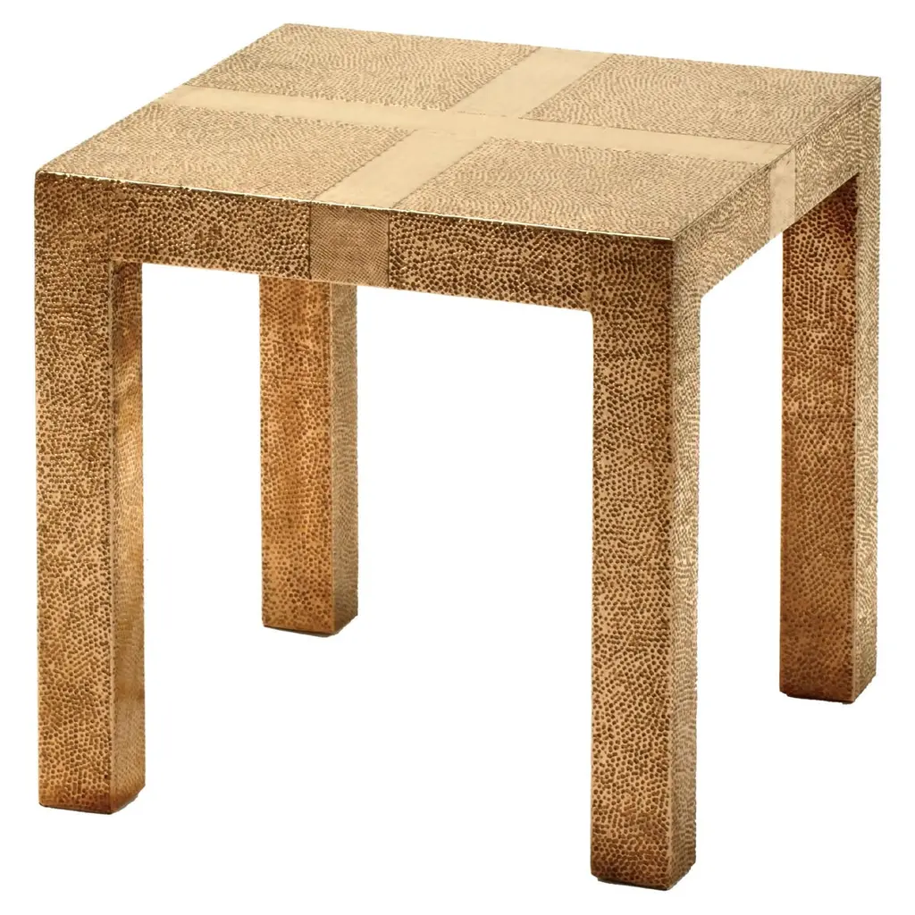 Alison Spear designed this elegant and minimal table for Stephanie Odegard during their trip together to Rajasthan, India. The craftsmen create patterns using different types of hammerings in the metal sheets clad over teak-wood structure.Crafted with utmost care and attention to detail, these Square Drink Table are made to order and are available in twelve metal clad finishes, ensuring that you can choose the perfect one to match your individual style and taste. The use of high-quality materials and expert craftsmanship ensure that each Art Deco Square Drink Table is not only beautiful but also a true piece of art.The Straight legs and side arms of this Art Deco Square Drink Table are hand carved from solid pieces of teak. Pattern makers trace and cut complex forms that will cover the chair in a skin of copper, white bronze, brass or antiqued white bronze The metal finishes will tarnish over time. Regular non-abrasive household metal polishes can be used to restore the original luster.Overall, if you're looking for a piece of furniture that combines luxury, comfort, and style, then the Art Deco Square Drink Table is an excellent choice. With its distinctive curved profile and multiple finish options, this Chair set is sure to elevate the look of any room it is placed in, and be a beloved addition to your home for years to come.The images shown in this listing are shot in different lighting conditions and/or are 3D illustrations. We encourage our customers to please request a sample or a full sample set of 12 finishes so that they can experience the finish first hand. Louise Art Deco Card Tables and Tea Tables Square Drink Table Mid. Hammered Copper by Alison Spear for Stephanie OdegardSize- 18"x 18"x 16"HMaterials - Copper , Metal sheet, Teak, Wood, MetalTechniques: Hand-Crafted, Hand-Carved, Metal Work, Wood Work, Metal Wrapping, PolishedPlease note that moisture in air, sudden change in temperature and natural movement of wood over time causes the metal to wrinkle or bubble up. We use well seasoned, reclaimed teak and high quality marine grade MDF (wherever technically possible) to avoid and delay the mentioned changes. However a perfect stability of metal cannot be guaranteed. Please note that our smooth finish metal clad pieces will have some unavoidable tool marks. This is proof that everything is done by hand. The smooth finish will not come out like a machine made perfect surface and the master artisan will do their best to make it look as good/clean/stable/perfect as he possibly can.The antique white bronze finish is hand done by using an acidic chemical over the white bronze finish to recreate a natural patination. Like with the natural patination of silver, copper, or brass, the final result and color uniformity of the patina cannot be guaranteed. The goal of this finish is to achieve rainbow-like shades with dull, shiny, cloudy, and streaky patches to give an illusion of antiquing. Please note:None of our metal clad pieces are treated with a protective “finish” thus enabling the items to age naturally over time. We will of course polish them well before we pack them. a) Copper oxidizes faster than the other metals. In six to twelve months it will most likely lose its shine and will gradually turn to different shades of brown and/or green/blue. This aging process and its effect is referred to as verdigris. After a year the piece should not change much more. Copper does not rust, but does require periodic cleaning in order to retain its original shine if that the preferred option. ('BRASSO' or any known copper polish can be used to polish copper).b) Brass retains its shine for far longer than others, but will tarnish if not cleaned on occasion. ('BRASSO' is made to polish brass).c) White bronze, has the least tendency to show age or tarnish. If kept in a controlled climate, this metal will hold its shine for years. It can be cleaned with a cleanser and polished with a cloth. d) The antiqued white bronze finish will react with the natural elements the fastest in the beginning but it too will stop reacting and will settle down in a stable state like copper after 6-12 months. Since it is already antiqued and looked like it is tarnished, as described in an earlier message, this fast reaction will not change the over all look. In that way this surface is most forgiving. The images shown in this listing are shot in different lighting conditions and/or are 3D illustrations. We encourage our customers to please request a sample or a full sample set of 12 finishes so that they can experience the finish first hand.