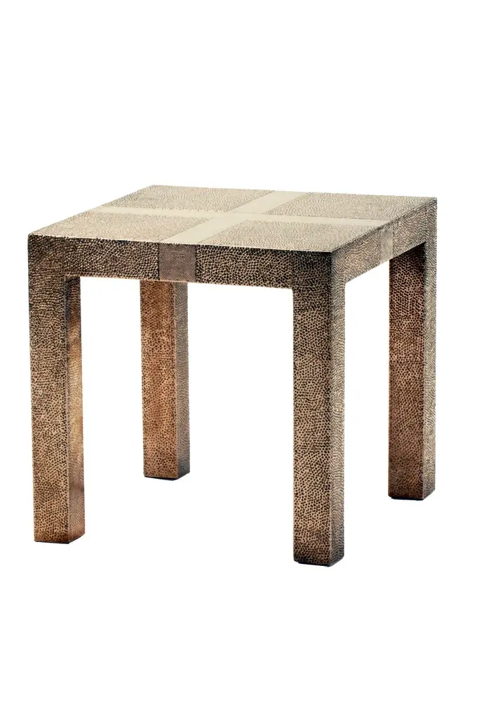 Alison Spear designed this elegant and minimal table for Stephanie Odegard during their trip together to Rajasthan, India. The craftsmen create patterns using different types of hammerings in the metal sheets clad over teak-wood structure.Crafted with utmost care and attention to detail, these Square Drink Table are made to order and are available in twelve metal clad finishes, ensuring that you can choose the perfect one to match your individual style and taste. The use of high-quality materials and expert craftsmanship ensure that each Art Deco Square Drink Table is not only beautiful but also a true piece of art.The Straight legs and side arms of this Art Deco Square Drink Table are hand carved from solid pieces of teak. Pattern makers trace and cut complex forms that will cover the chair in a skin of copper, white bronze, brass or antiqued white bronze The metal finishes will tarnish over time. Regular non-abrasive household metal polishes can be used to restore the original luster.Overall, if you're looking for a piece of furniture that combines luxury, comfort, and style, then the Art Deco Square Drink Table is an excellent choice. With its distinctive curved profile and multiple finish options, this Chair set is sure to elevate the look of any room it is placed in, and be a beloved addition to your home for years to come.The images shown in this listing are shot in different lighting conditions and/or are 3D illustrations. We encourage our customers to please request a sample or a full sample set of 12 finishes so that they can experience the finish first hand. Louise Art Deco Farm Tables Square Drink Table Smooth Brass by Alison Spear for Stephanie Odegard Size- 18"x 18"x 16"H Materials - Brass, Metal sheet, Teak, Wood, Metal Techniques: Hand-Crafted, Hand-Carved, Metal Work, Wood Work, Metal Wrapping, PolishedPlease note that moisture in air, sudden change in temperature and natural movement of wood over time causes the metal to wrinkle or bubble up. We use well seasoned, reclaimed teak and high quality marine grade MDF (wherever technically possible) to avoid and delay the mentioned changes. However a perfect stability of metal cannot be guaranteed. Please note that our smooth finish metal clad pieces will have some unavoidable tool marks. This is proof that everything is done by hand. The smooth finish will not come out like a machine made perfect surface and the master artisan will do their best to make it look as good/clean/stable/perfect as he possibly can.The antique white bronze finish is hand done by using an acidic chemical over the white bronze finish to recreate a natural patination. Like with the natural patination of silver, copper, or brass, the final result and color uniformity of the patina cannot be guaranteed. The goal of this finish is to achieve rainbow-like shades with dull, shiny, cloudy, and streaky patches to give an illusion of antiquing. Please note:None of our metal clad pieces are treated with a protective “finish” thus enabling the items to age naturally over time. We will of course polish them well before we pack them. a) Copper oxidizes faster than the other metals. In six to twelve months it will most likely lose its shine and will gradually turn to different shades of brown and/or green/blue. This aging process and its effect is referred to as verdigris. After a year the piece should not change much more. Copper does not rust, but does require periodic cleaning in order to retain its original shine if that the preferred option. ('BRASSO' or any known copper polish can be used to polish copper).b) Brass retains its shine for far longer than others, but will tarnish if not cleaned on occasion. ('BRASSO' is made to polish brass).c) White bronze, has the least tendency to show age or tarnish. If kept in a controlled climate, this metal will hold its shine for years. It can be cleaned with a cleanser and polished with a cloth. d) The antiqued white bronze finish will react with the natural elements the fastest in the beginning but it too will stop reacting and will settle down in a stable state like copper after 6-12 months. Since it is already antiqued and looked like it is tarnished, as described in an earlier message, this fast reaction will not change the over all look. In that way this surface is most forgiving. The images shown in this listing are shot in different lighting conditions and/or are 3D illustrations. We encourage our customers to please request a sample or a full sample set of 12 finishes so that they can experience the finish first hand.