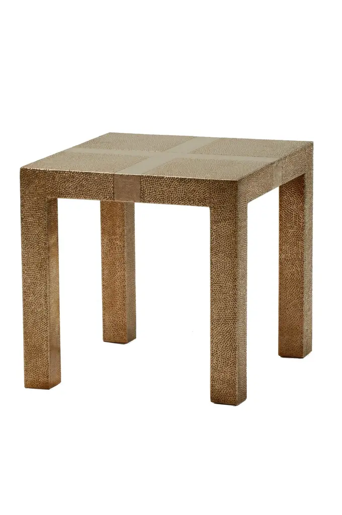 Alison Spear designed this elegant and minimal table for Stephanie Odegard during their trip together to Rajasthan, India. The craftsmen create patterns using different types of hammerings in the metal sheets clad over teak-wood structure.Crafted with utmost care and attention to detail, these Square Drink Table are made to order and are available in twelve metal clad finishes, ensuring that you can choose the perfect one to match your individual style and taste. The use of high-quality materials and expert craftsmanship ensure that each Art Deco Square Drink Table is not only beautiful but also a true piece of art.The Straight legs and side arms of this Art Deco Square Drink Table are hand carved from solid pieces of teak. Pattern makers trace and cut complex forms that will cover the chair in a skin of copper, white bronze, brass or antiqued white bronze The metal finishes will tarnish over time. Regular non-abrasive household metal polishes can be used to restore the original luster.Overall, if you're looking for a piece of furniture that combines luxury, comfort, and style, then the Art Deco Square Drink Table is an excellent choice. With its distinctive curved profile and multiple finish options, this Chair set is sure to elevate the look of any room it is placed in, and be a beloved addition to your home for years to come.The images shown in this listing are shot in different lighting conditions and/or are 3D illustrations. We encourage our customers to please request a sample or a full sample set of 12 finishes so that they can experience the finish first hand. Louise Art Deco Lowboys Square Drink Table Smooth Copper by Alison Spear for Stephanie Odegard Size- 18"x 18"x 16"H Materials - Copper , Metal sheet, Teak, Wood, Metal Techniques: Hand-Crafted, Hand-Carved, Metal Work, Wood Work, Metal Wrapping, PolishedPlease note that moisture in air, sudden change in temperature and natural movement of wood over time causes the metal to wrinkle or bubble up. We use well seasoned, reclaimed teak and high quality marine grade MDF (wherever technically possible) to avoid and delay the mentioned changes. However a perfect stability of metal cannot be guaranteed. Please note that our smooth finish metal clad pieces will have some unavoidable tool marks. This is proof that everything is done by hand. The smooth finish will not come out like a machine made perfect surface and the master artisan will do their best to make it look as good/clean/stable/perfect as he possibly can.The antique white bronze finish is hand done by using an acidic chemical over the white bronze finish to recreate a natural patination. Like with the natural patination of silver, copper, or brass, the final result and color uniformity of the patina cannot be guaranteed. The goal of this finish is to achieve rainbow-like shades with dull, shiny, cloudy, and streaky patches to give an illusion of antiquing. Please note:None of our metal clad pieces are treated with a protective “finish” thus enabling the items to age naturally over time. We will of course polish them well before we pack them. a) Copper oxidizes faster than the other metals. In six to twelve months it will most likely lose its shine and will gradually turn to different shades of brown and/or green/blue. This aging process and its effect is referred to as verdigris. After a year the piece should not change much more. Copper does not rust, but does require periodic cleaning in order to retain its original shine if that the preferred option. ('BRASSO' or any known copper polish can be used to polish copper).b) Brass retains its shine for far longer than others, but will tarnish if not cleaned on occasion. ('BRASSO' is made to polish brass).c) White bronze, has the least tendency to show age or tarnish. If kept in a controlled climate, this metal will hold its shine for years. It can be cleaned with a cleanser and polished with a cloth. d) The antiqued white bronze finish will react with the natural elements the fastest in the beginning but it too will stop reacting and will settle down in a stable state like copper after 6-12 months. Since it is already antiqued and looked like it is tarnished, as described in an earlier message, this fast reaction will not change the over all look. In that way this surface is most forgiving. The images shown in this listing are shot in different lighting conditions and/or are 3D illustrations. We encourage our customers to please request a sample or a full sample set of 12 finishes so that they can experience the finish first hand.