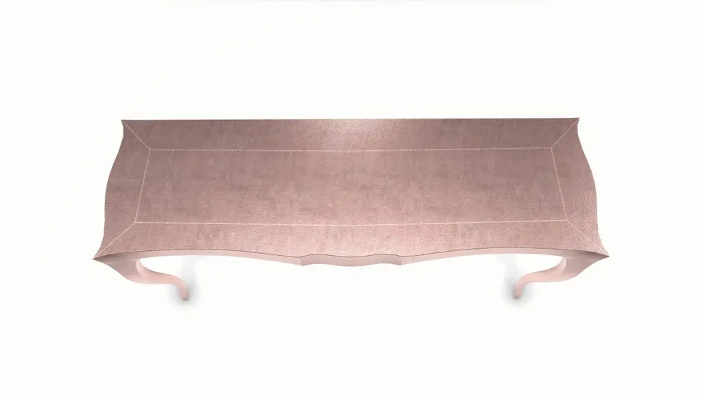 Louise Console Table from our Louise Collection. The renowned designer Paul Mathieu chose the name “Louise” when he created his more feminine version of Louis XV (1730-1760) furniture. The characteristic cabriole leg, curving outward at the knee and inward towards the foot in an "S" shape was born during this period. It is during the same era that English furniture makers produced the Queen Anne and Chippendale styles.Crafted with utmost care and attention to detail, these Louis Card Tables are made to order and are available in twelve metal clad finishes, ensuring that you can choose the perfect one to match your individual style and taste. The use of high-quality materials and expert craftsmanship ensure that each Art Deco Louis Card Tables is not only beautiful but also a true piece of Art.The curved legs and side arms of this Art Deco Louis Card Tables are hand carved from solid pieces of teak. Pattern makers trace and cut complex forms that will cover the chair in a skin of copper, white bronze, brass or antiqued white bronze The metal finishes will tarnish over time. Regular non-abrasive household metal polishes can be used to restore the original luster.Overall, if you're looking for a piece of furniture that combines luxury, comfort, and style, then the Art Deco Card Tables is an excellent choice. With its distinctive curved profile and multiple finish options, this Chair set is sure to elevate the look of any room it is placed in, and be a beloved addition to your home for years to come.The images shown in this listing are shot in different lighting conditions and/or are 3D illustrations. We encourage our customers to please request a sample or a full sample set of 12 finishes so that they can experience the finish first hand. Louise Console Art Deco Side Tables Mid. Hammered Copper by Paul Mathieu for Stephanie OdegardSize- 60"x 18.5"x 30"HMaterials - Copper, Metal sheet, Teak, Wood, MetalTechniques: Hand-Crafted, Hand-Carved, Metal Work, Wood Work, Metal Wrapping, PolishedPlease note that moisture in air, sudden change in temperature and natural movement of wood over time causes the metal to wrinkle or bubble up. We use well seasoned, reclaimed teak and high quality marine grade MDF (wherever technically possible) to avoid and delay the mentioned changes. However a perfect stability of metal cannot be guaranteed. Please note that our smooth finish metal clad pieces will have some unavoidable tool marks. This is proof that everything is done by hand. The smooth finish will not come out like a machine made perfect surface and the master Artisan will do their best to make it look as good/clean/stable/perfect as he possibly can.The antique white bronze finish is hand done by using an acidic chemical over the white bronze finish to recreate a natural patination. Like with the natural patination of silver, copper, or brass, the final result and color uniformity of the patina cannot be guaranteed. The goal of this finish is to achieve rainbow-like shades with dull, shiny, cloudy, and streaky patches to give an illusion of antiquing. Please note:None of our metal clad pieces are treated with a protective “finish” thus enabling the items to age naturally over time. We will of course polish them well before we pack them. a) Copper oxidizes faster than the other metals. In six to twelve months it will most likely lose its shine and will gradually turn to different shades of brown and/or green/blue. This aging process and its effect is referred to as verdigris. After a year the piece should not change much more. Copper does not rust, but does require periodic cleaning in order to retain its original shine if that the preferred option. ('BRASSO' or any known copper polish can be used to polish copper).b) Brass retains its shine for far longer than others, but will tarnish if not cleaned on occasion. ('BRASSO' is made to polish brass).c) White bronze, has the least tendency to show age or tarnish. If kept in a controlled climate, this metal will hold its shine for years. It can be cleaned with a cleanser and polished with a cloth. d) The antiqued white bronze finish will react with the natural elements the fastest in the beginning but it too will stop reacting and will settle down in a stable state like copper after 6-12 months. Since it is already antiqued and looked like it is tarnished, as described in an earlier message, this fast reaction will not change the over all look. In that way this surface is most forgiving. The images shown in this listing are shot in different lighting conditions and/or are 3D illustrations. We encourage our customers to please request a sample or a full sample set of 12 finishes so that they can experience the finish first hand.