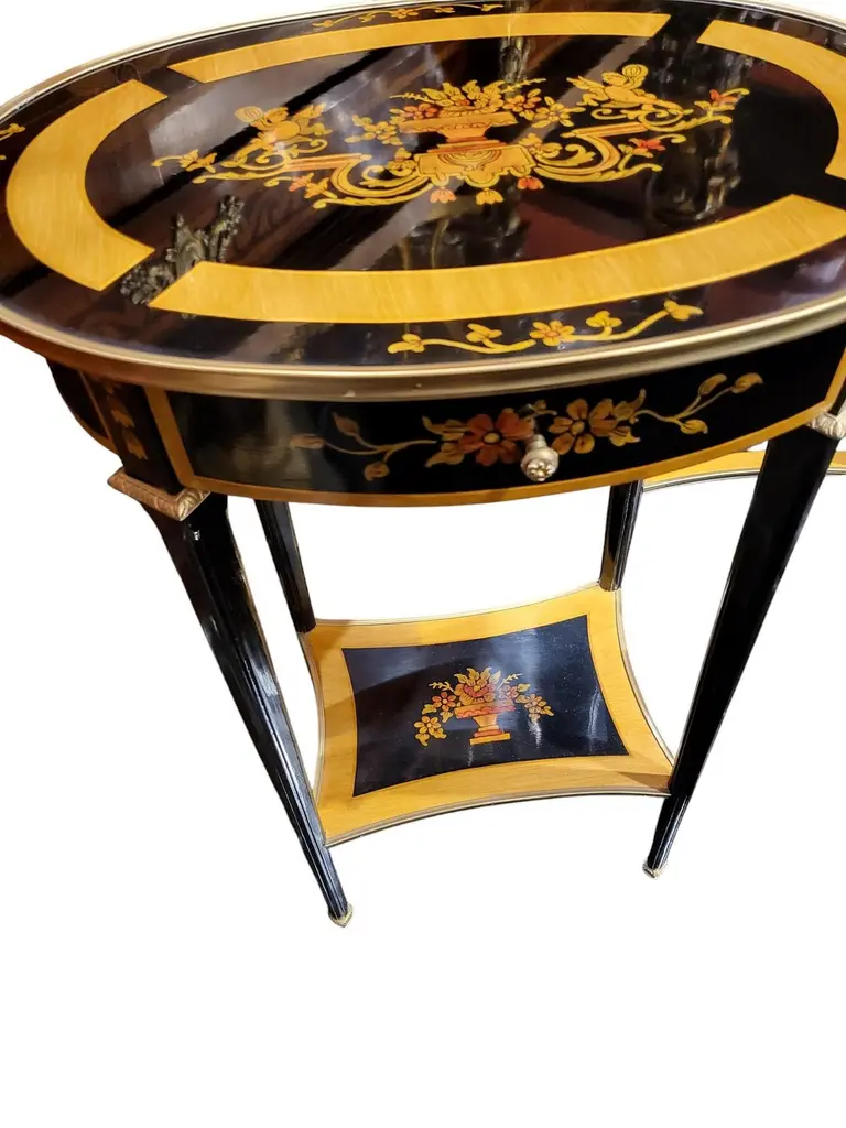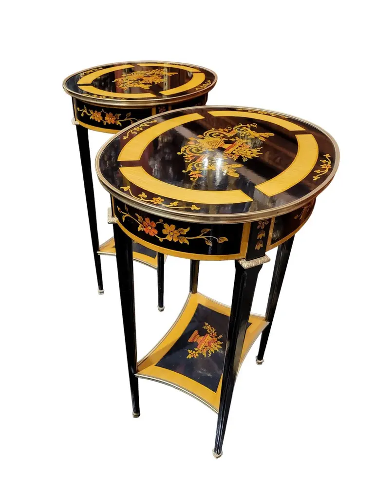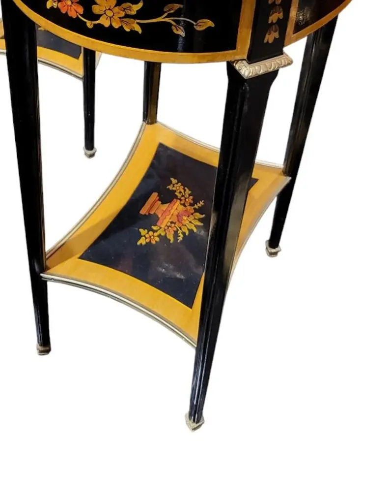 A Striking Pair of French Style Side Tables with Black Lacquer Finish and Floral DecorationLovely DetailDated C20th