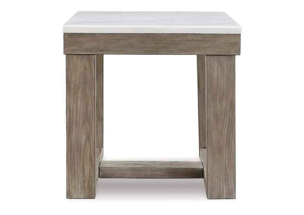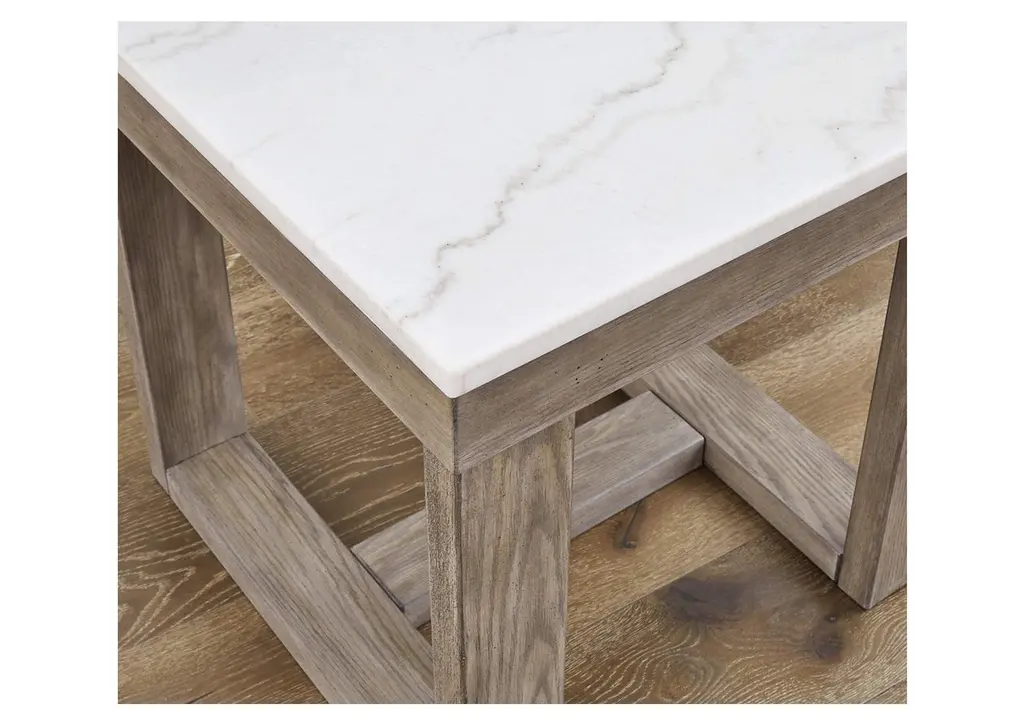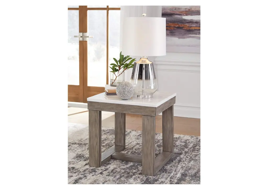 The Loyaska square end table is simple in design but big on style. Finished with a trend-right grayish brown wood tone, its bold, blocky profile and natural marble top are timeless classic choices that work so well with a variety of settings. Adding to its beauty, the marble top's color variations, fissures, mineral deposits and veining are naturally formed and are not defects. Weight 71.000 lbs. (31.95kgs.)