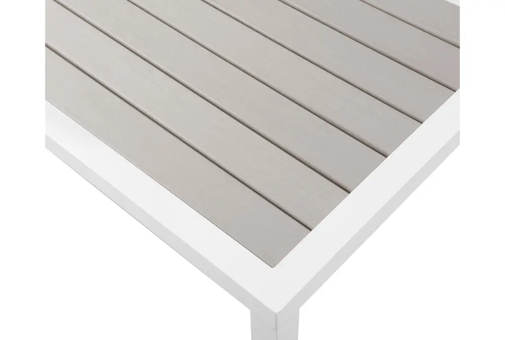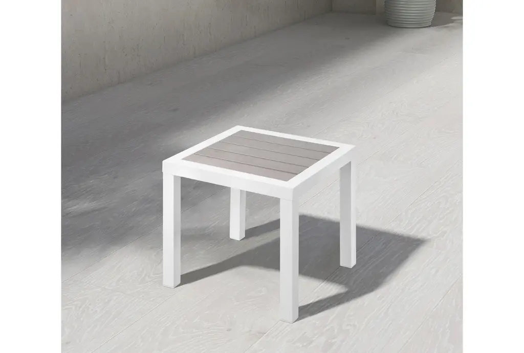 Enhance your outdoor living space with the Lucas Grey Wood Look Accent Paneling Outdoor Patio Aluminum End Table. This modern end table features a grey wood look accent that adds a touch of sophistication to any patio or deck. Its square shape and weather-resistant materials make it perfect for outdoor use, ensuring durability and style.