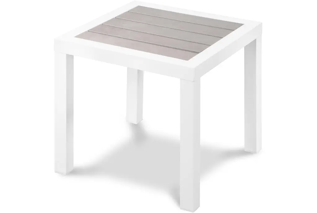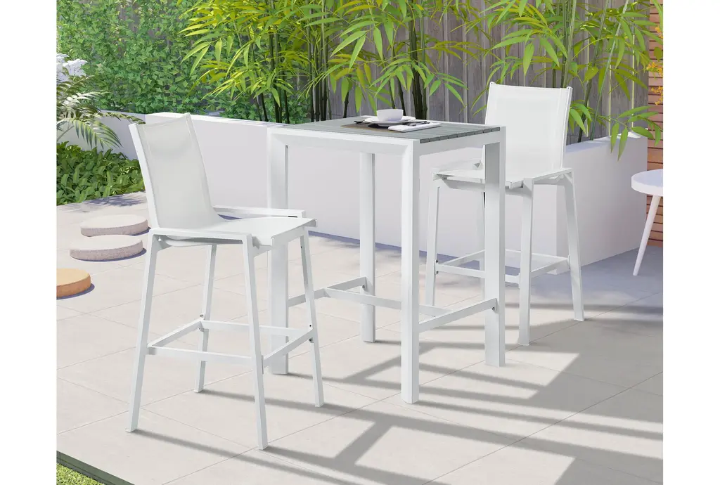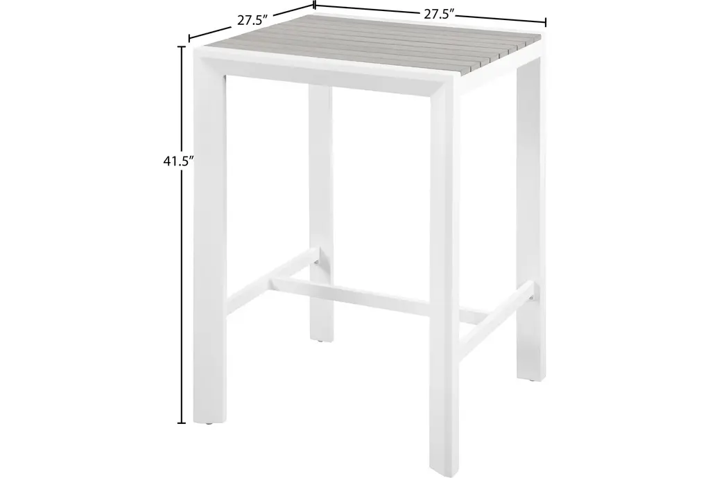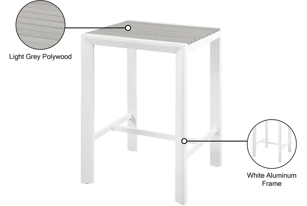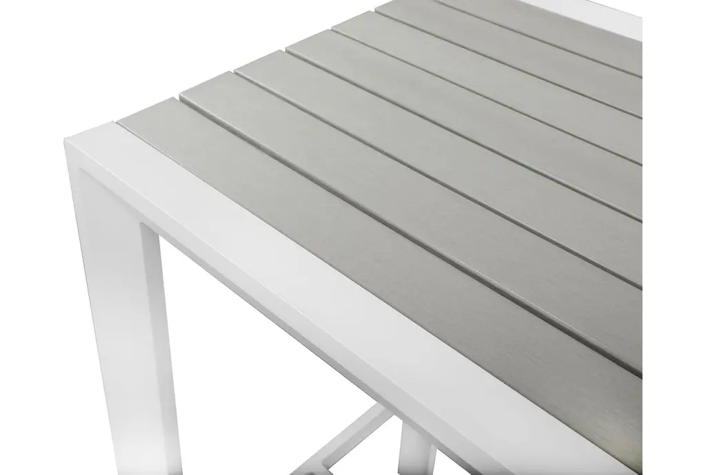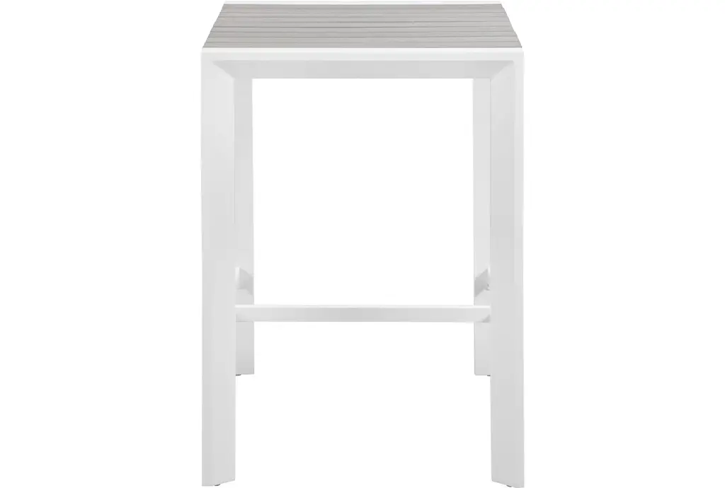 The Lucas Square bar table features grey wood look accent paneling on top that contrasts the white aluminum frame. Perfect for your patio or balcony, you'll love entertaining here.
