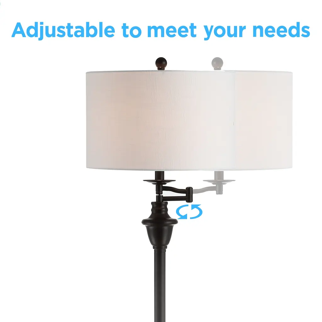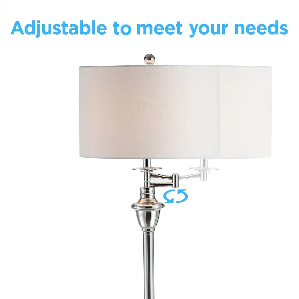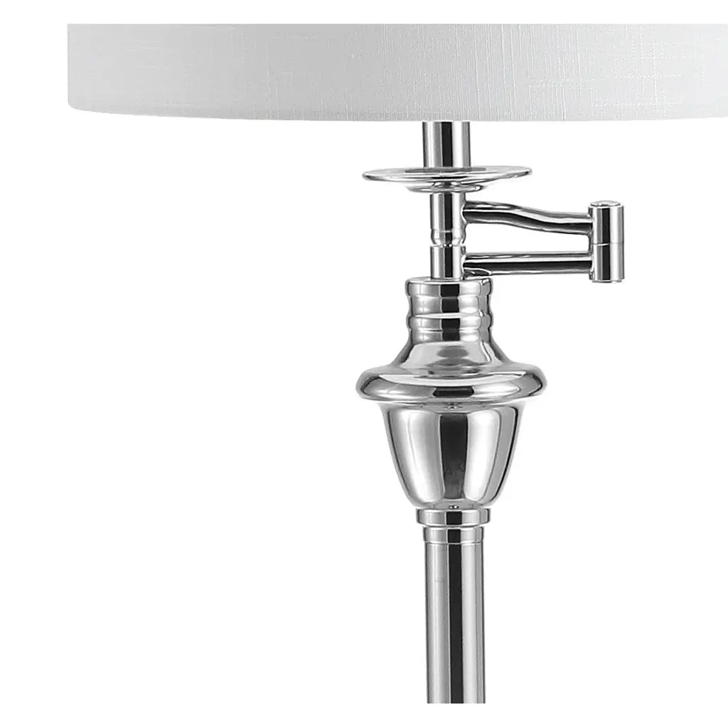 This floor lamp design offers both classic form and function. It comes with a built-in glass tray at perfect side-table height that's ideal for holding your favorite novel or a TV remote. A step-on on/off switch and swing arm make it a practical choice for reading areas. Simultaneously, the chrome finish, urn-shaped column detail and linen drum shade make it an impeccable addition to any style of home decor. Features:Dimensions:About us:You see a lamp.We see a decorative work of art.A perfectly curved shade casts a dramatic shadow on a floor. A silk cord you never want to hide. LED lightbulbs: as easy on the environment as they are on the eyes. The JONATHAN Y Lighting collection considers every detail from impeccably sourced materials to designer styling. And our prices are so attractive, we've transformed a functional necessity into a fashion accessory.JONATHAN Y Lighting - a fashion revolution in home decor.