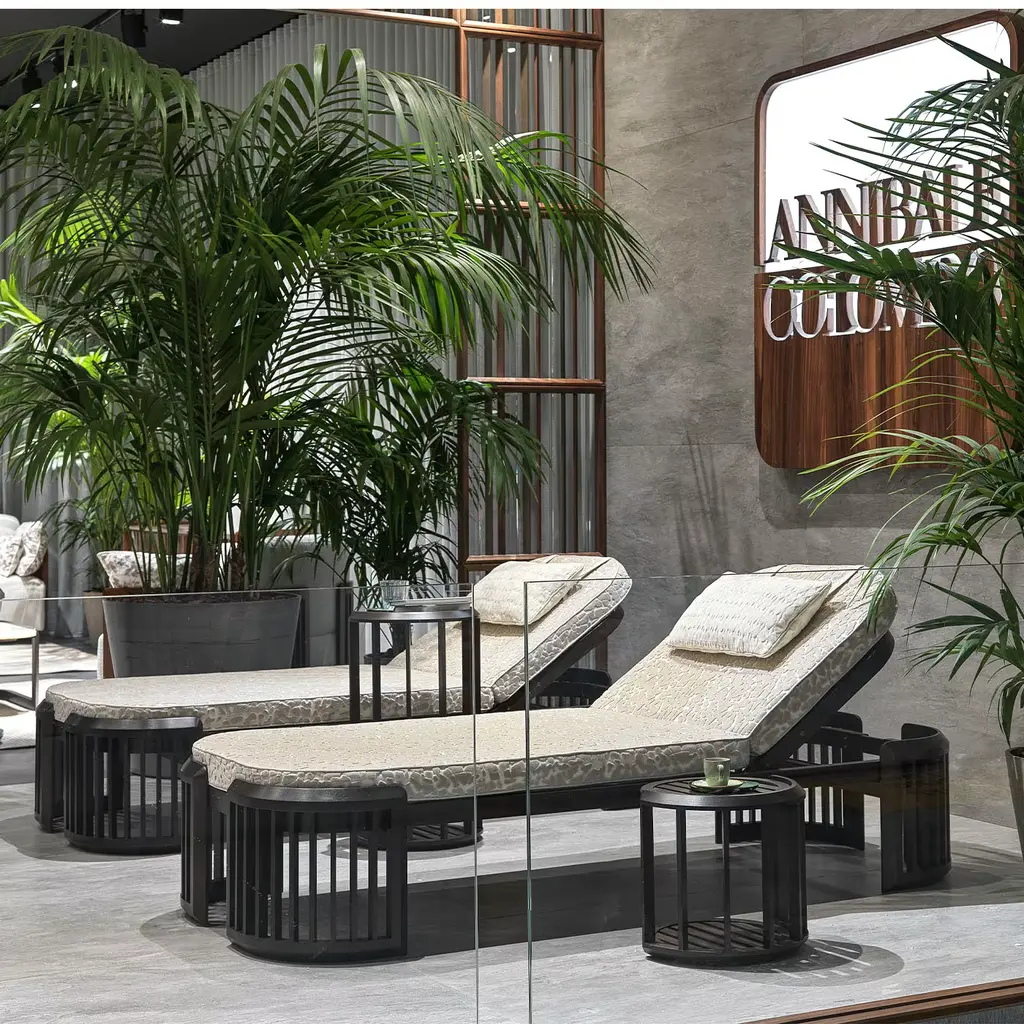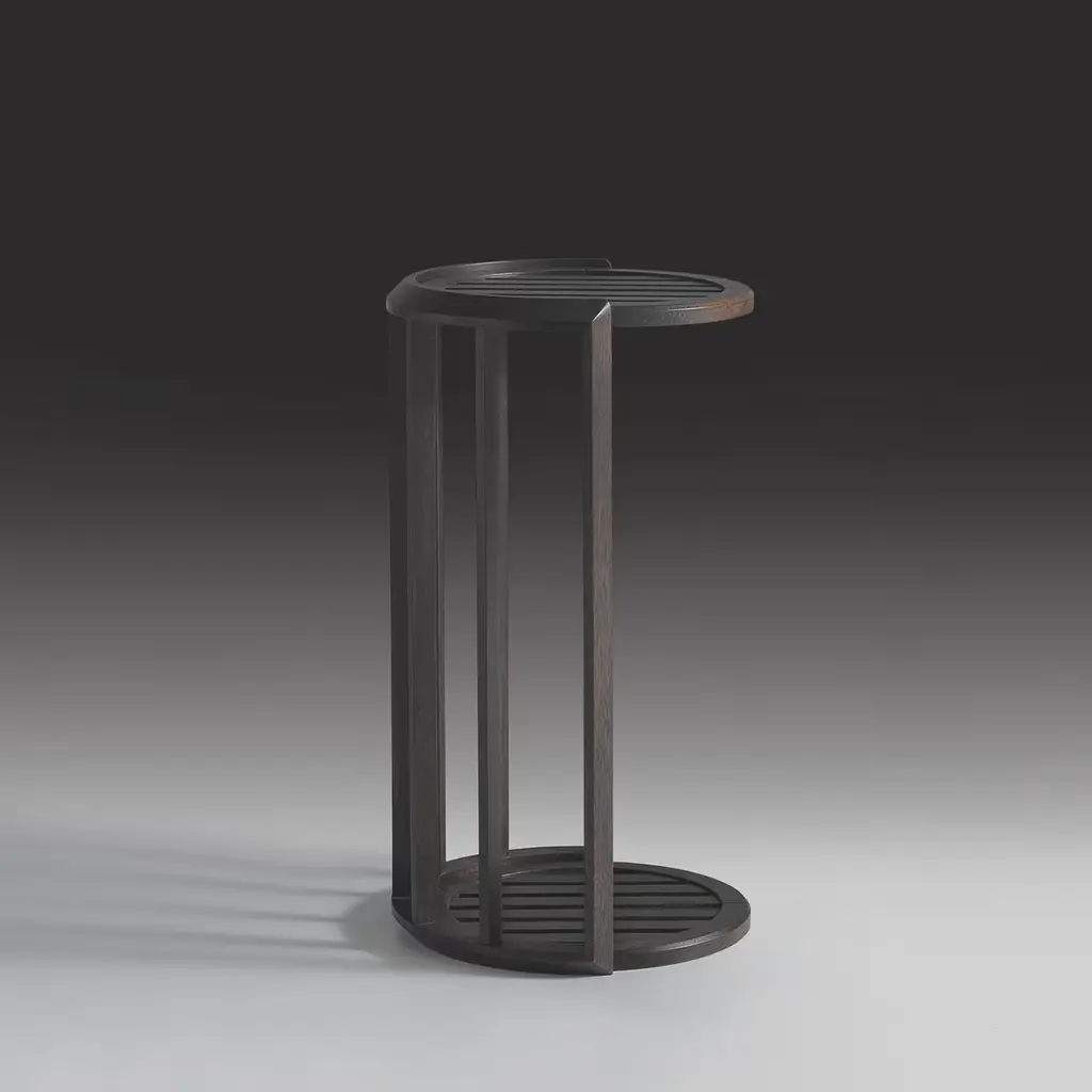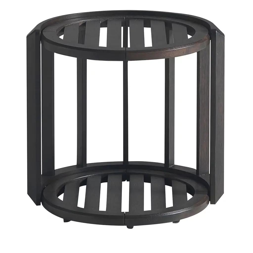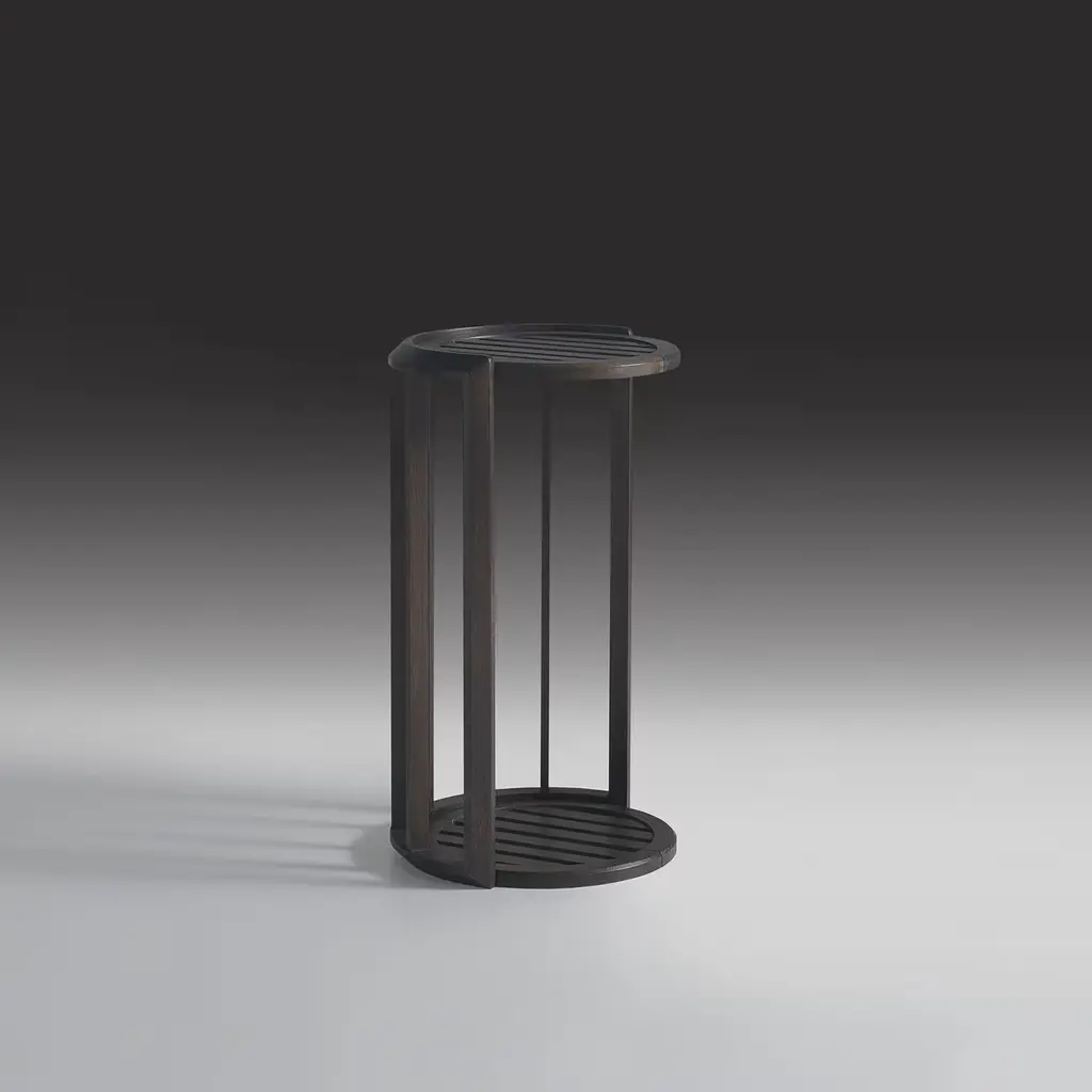 The Lucio side table crafted in iroko, features a sleek cylindrical design with slatted surfaces on the top and bottom, providing both style and functionality for outdoor spaces. Its elevated height makes it suitable for use beside lounge chairs or patios, while the durable construction ensures stability and weather resistance. This version is presented in a rich brown finish, complementing natural outdoor settings and enhancing any exterior décor. Also available in a lighter color, contact the Concierge for more details.