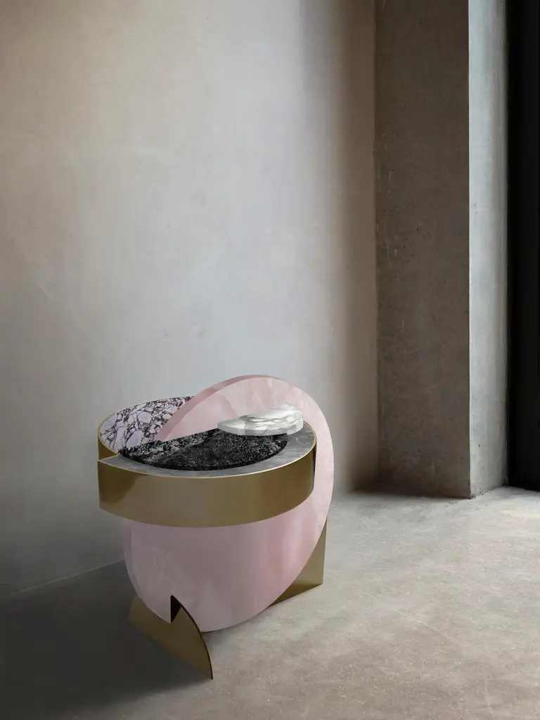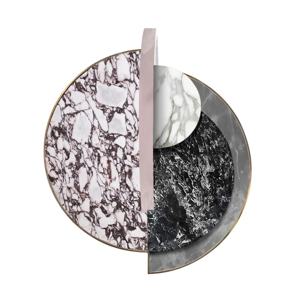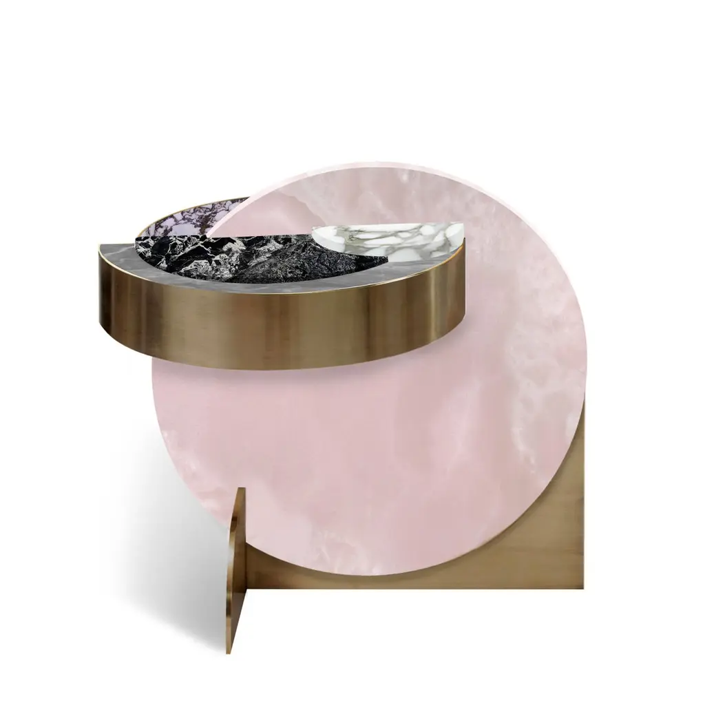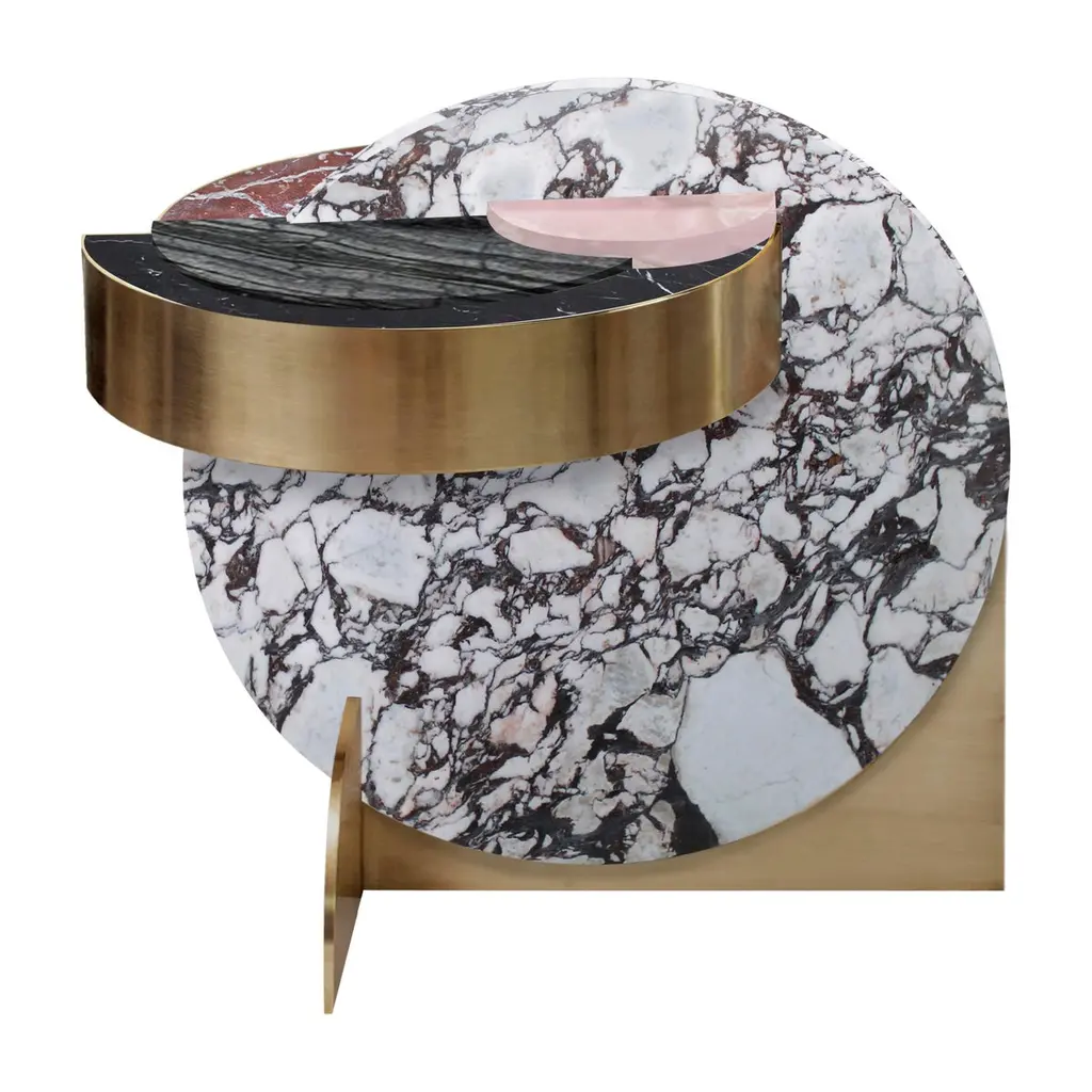 Lunar collection of table furniture takes the sheer glamour of stone into yet another galaxy. Following the design language of Solaris, they take inspiration from the planets and their orbital movements, featuring highly-figured, richly-coloured marbles set, like precious jewels, within brass rims.Discs echoing planetary forms are bisected or overlaid to create surface patterns and structural elements, forming dynamically-poised bases and tops.Please note that no two marbles are alike and there will be variations in the pattern as well as in the colour of the pieces.The table has three slightly visible solder joints on the metal rim. There are also two visible screws on the half disc that supports the large marble disk. Please note that these is not an imperfections, but they are integral part of the piece.Each piece of furniture is individually numbered and comes with a signed Certificate of authenticity to prove that it is Bohinc Studio original.MATERIALS: brass galvanised steel metalwork and marbles: Pink Onyx, Calacatta, Nero Anico, Calacatta Viola, Silver WaveDIMENSIONS: height 60cm, length 65cm, width 65cmWEIGHT: approximately 85kgHandmade in Italy.