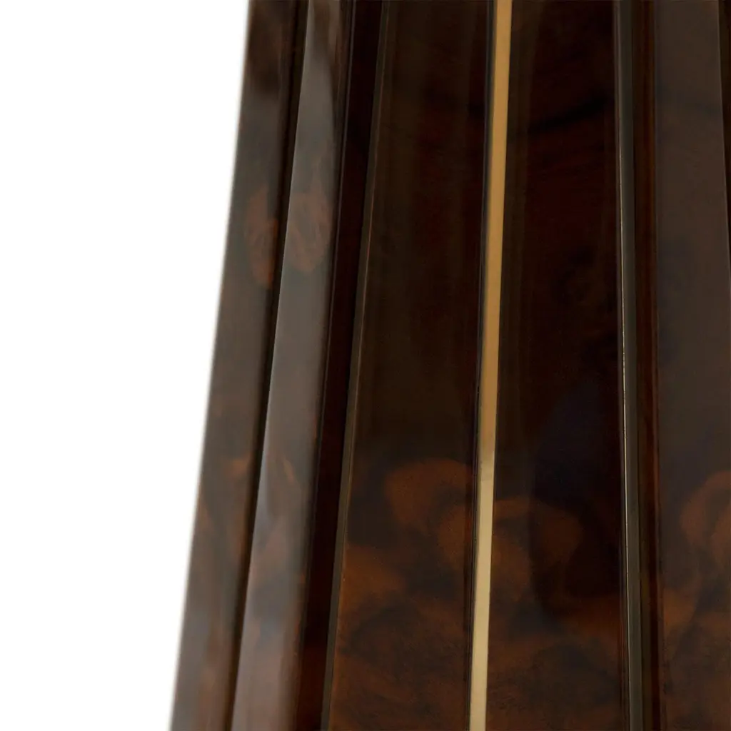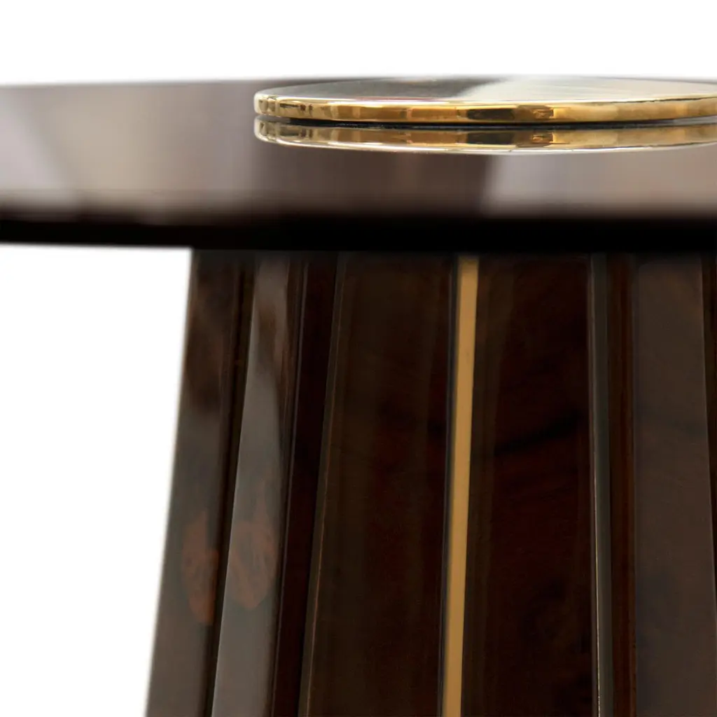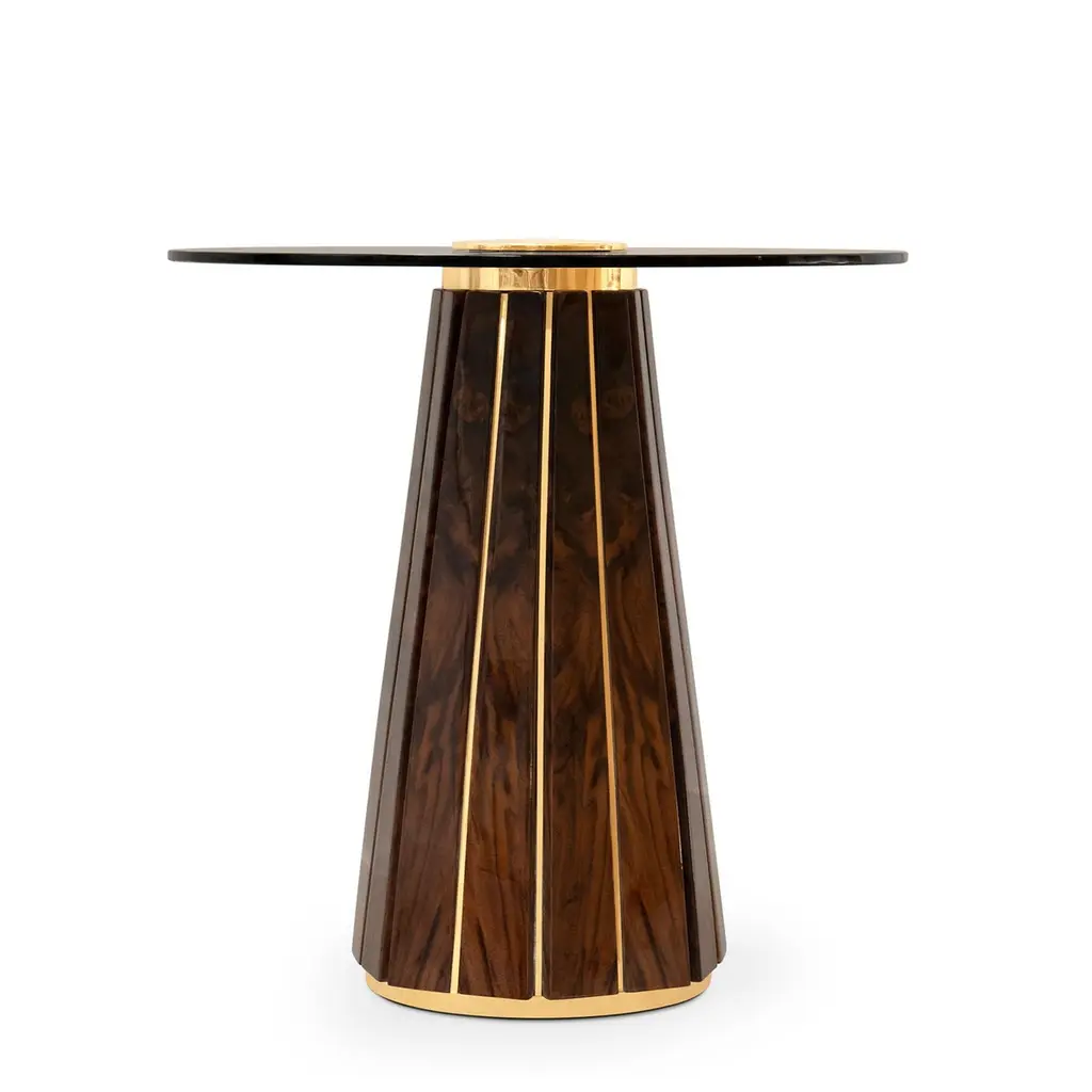 Side table Lupus with structure in solid brasscovered with solid walnut root in varnished finish.With a blackened glass top with center ring in solidpolished brass.