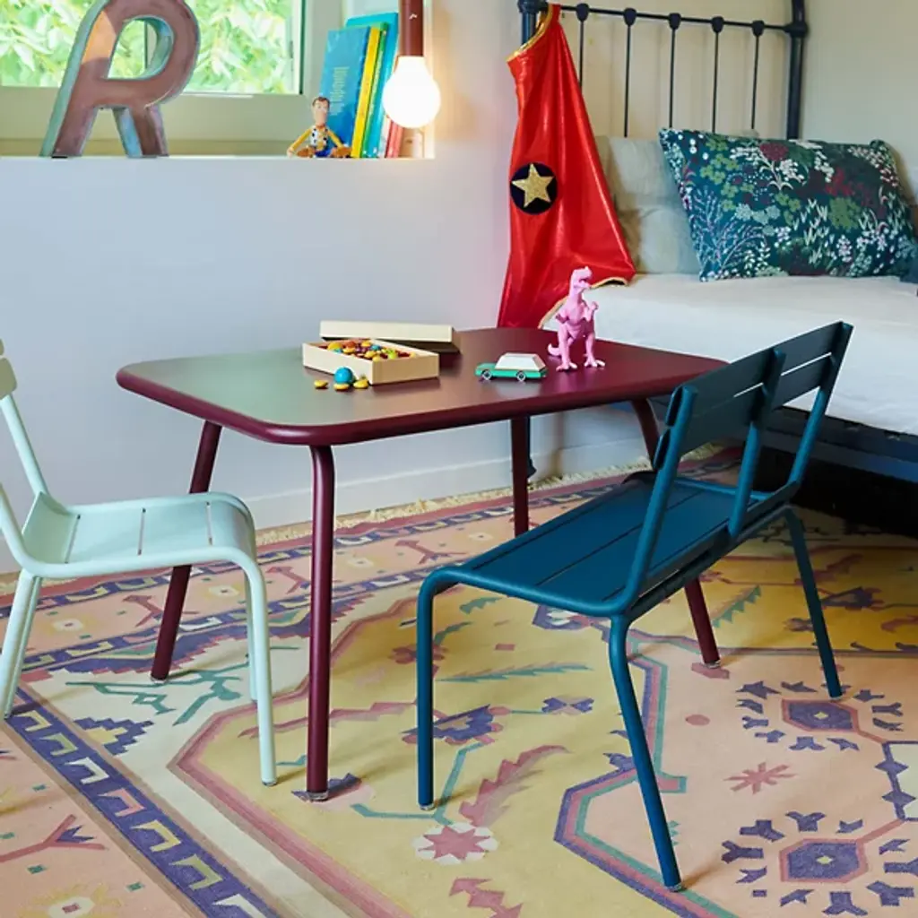 Refined design for kids to enjoy. The Luxembourg Rectangular Kid Table by Fermob has all the strength, durability and smooth lines of the full-sized version, just made on a smaller scale for children who are about 3-6 years old. This petite table is made mostly with steel for stability and strength, including a steel sheet top (reinforced with an aluminum frame) and tubular steel legs. It’s great for use indoors in a child’s room or outside in a garden play area. Designed by Frederic Sofia.