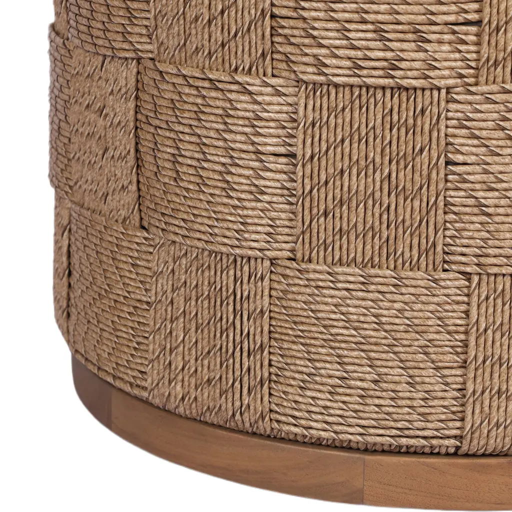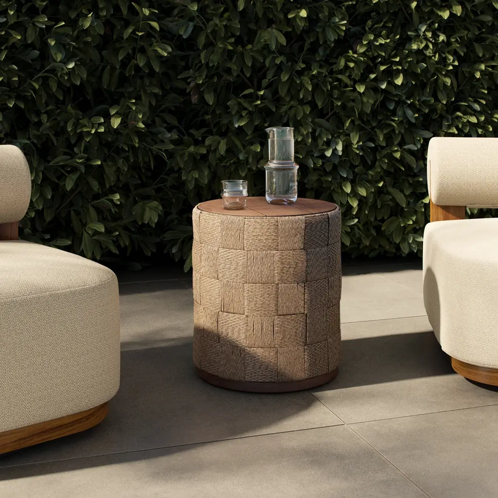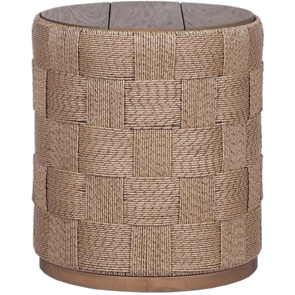 The Luxen Outdoor End Table is a stunning blend of mixed materials, perfect for both indoor and outdoor settings. This versatile piece features a chunky box-woven frame crafted from all-weather wicker, complemented by an inset teak top. Its texture-rich design adds a sophisticated touch to any outdoor styling. To maintain its beauty, it is recommended to cover or store the table indoors during inclement weather and when not in use.