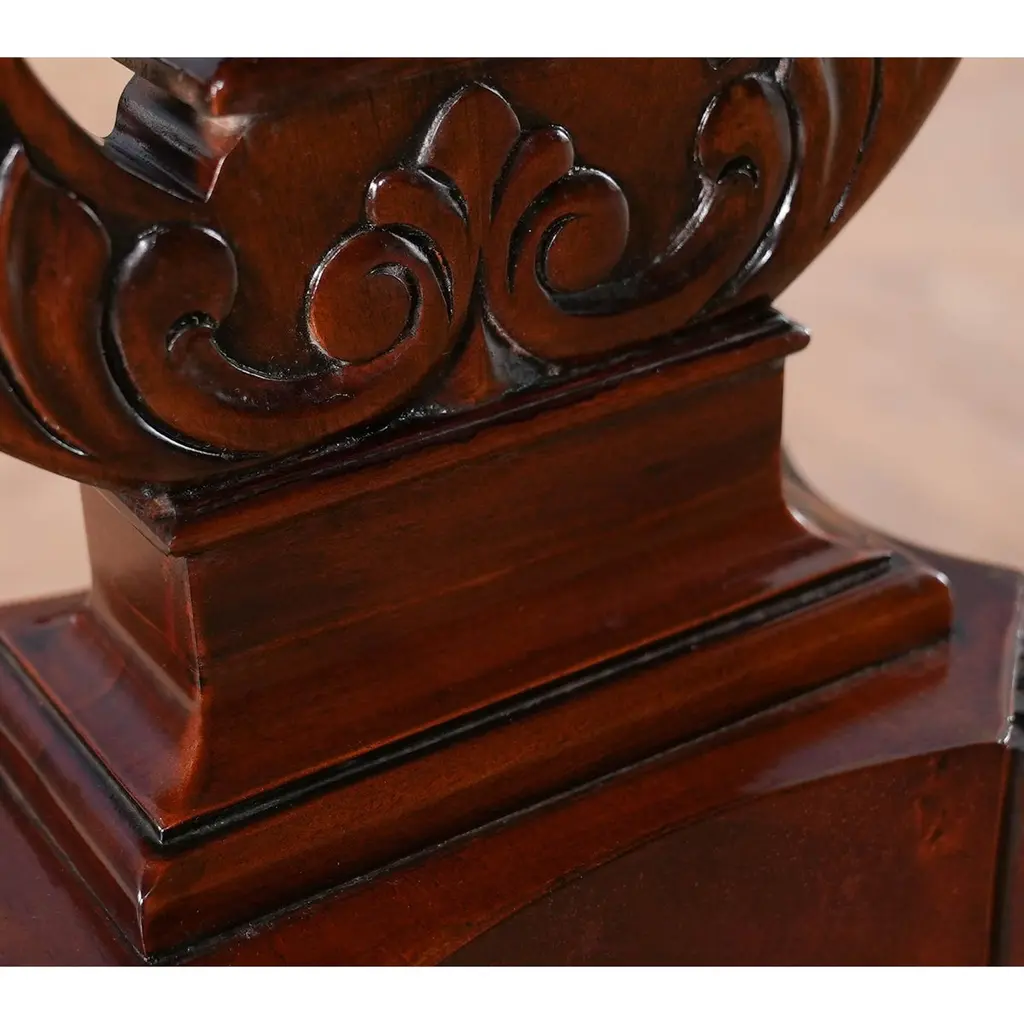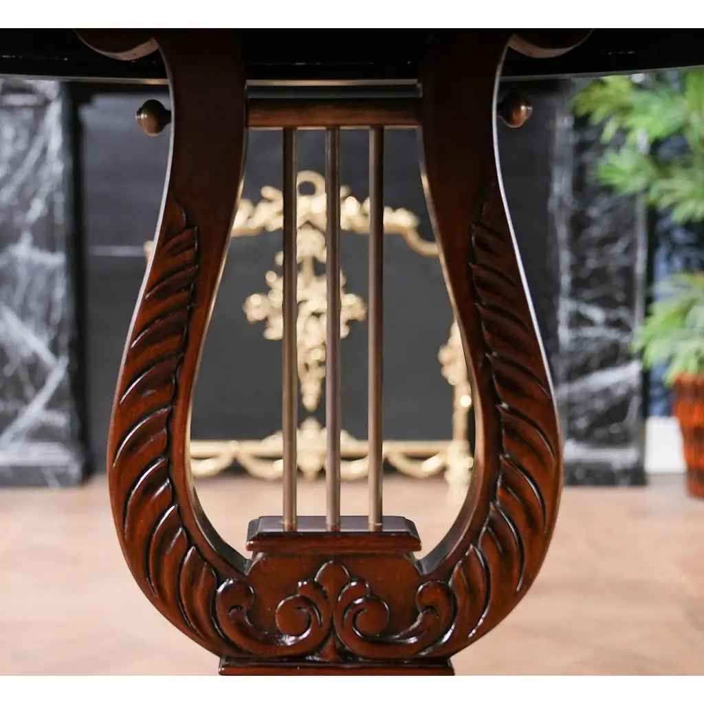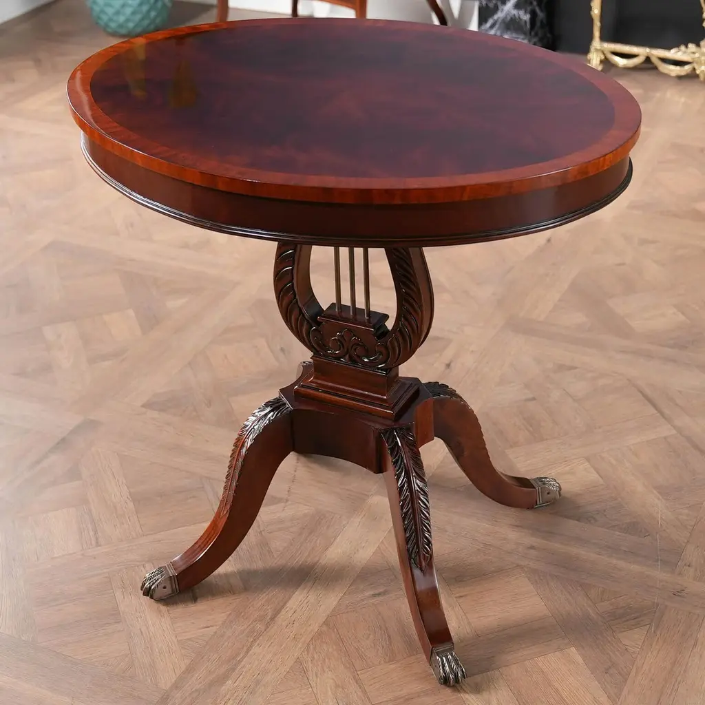 Starting with it’s oval top the Lyre Lamp Table from Niagara Furniture is an exercise in elegance. The sweeping mahogany base is created in a lyre or harp shaped form are executed in solid mahogany. Hand carved by master craftsmen the base of each Lyre Lamp Table is a work of art in itself combining the ingredients of brass with solid mahogany to create a beautiful addition to any setting.Measures 32″w x 25″d x 30″h metric 81 64 76