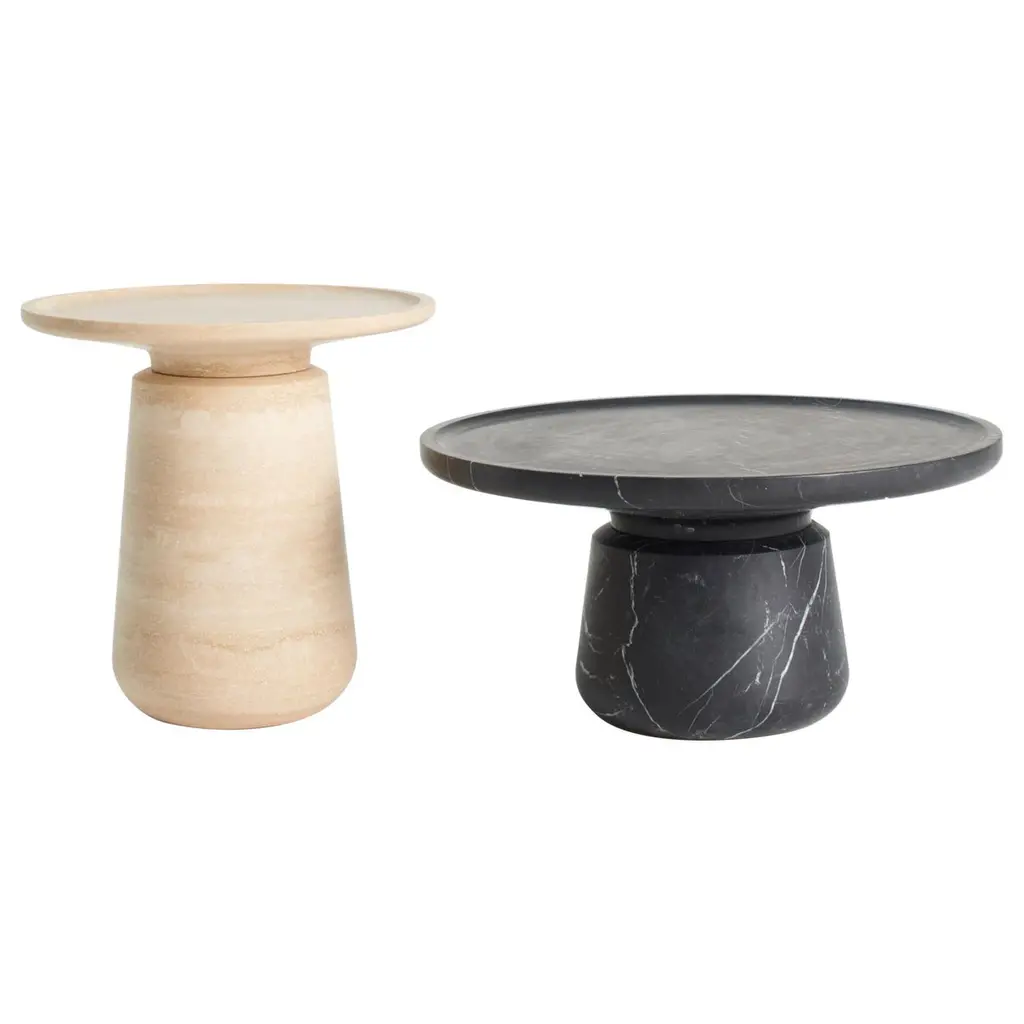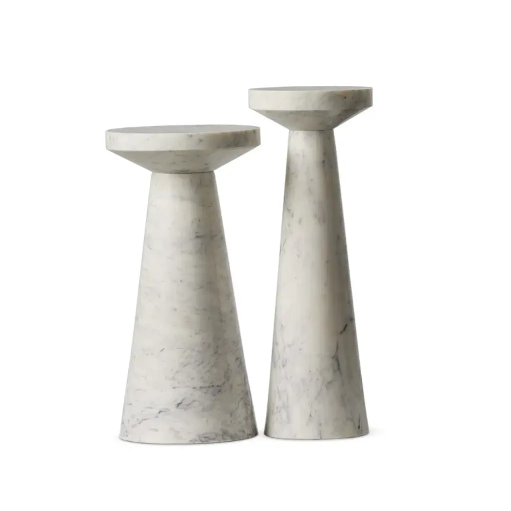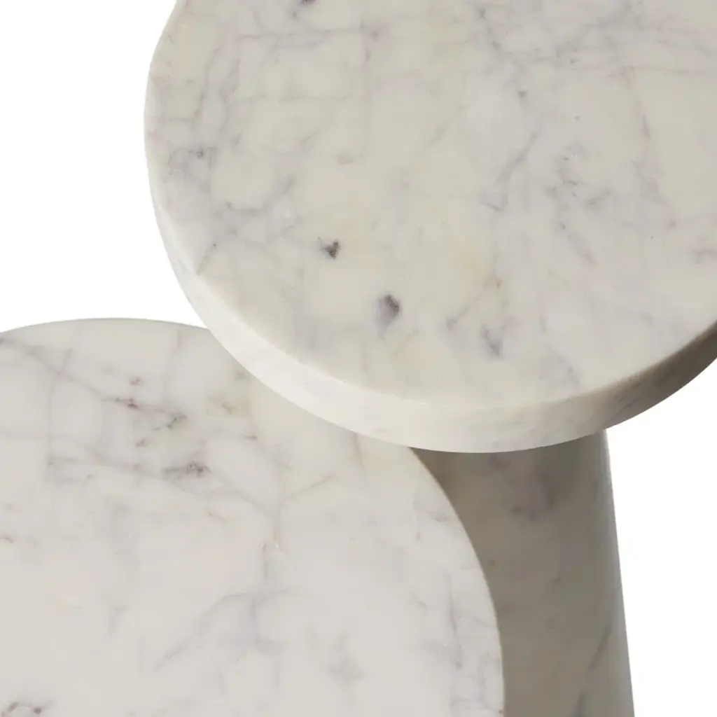Beautifully veined white marble brings a timeless, polished look to a set of nesting tables with staggered heights.