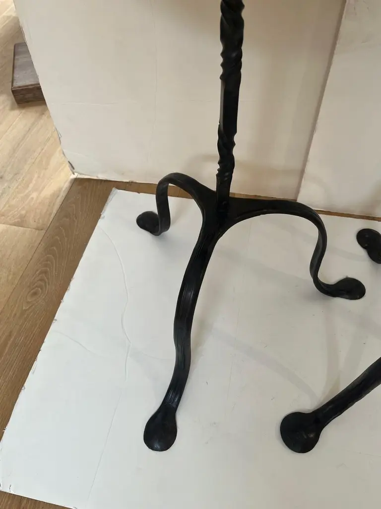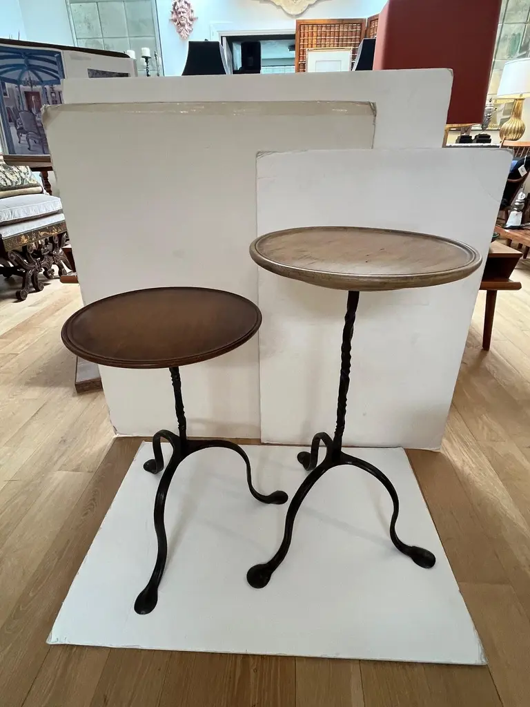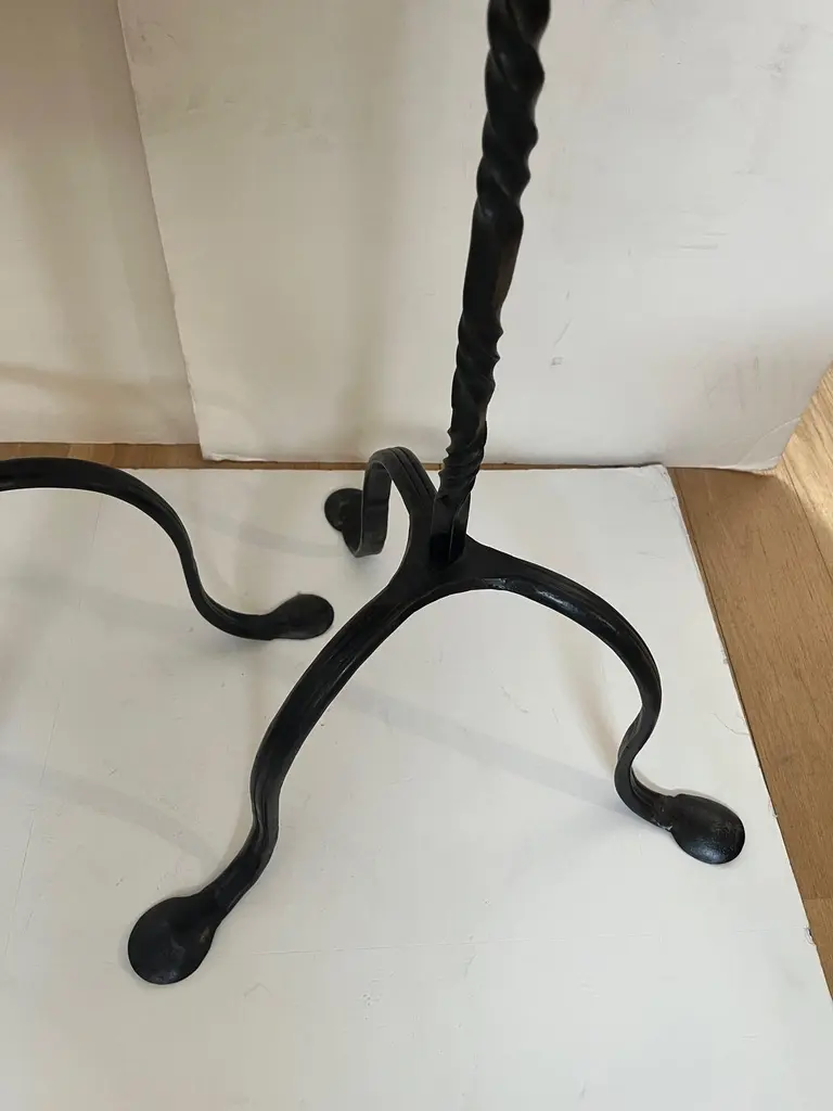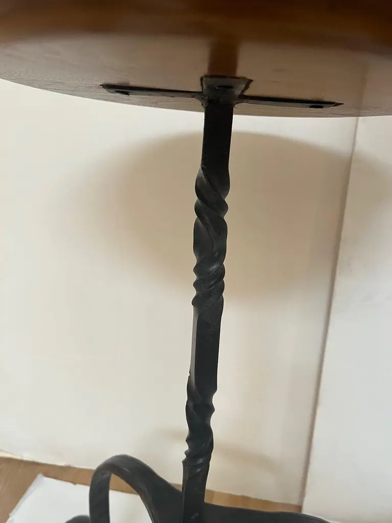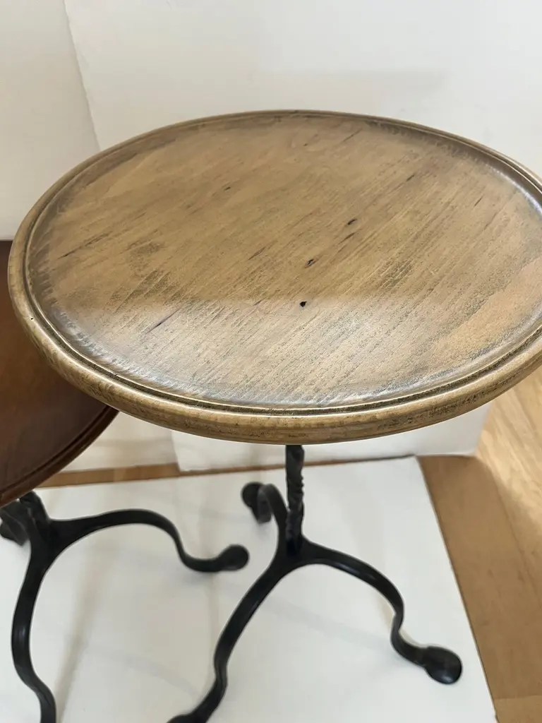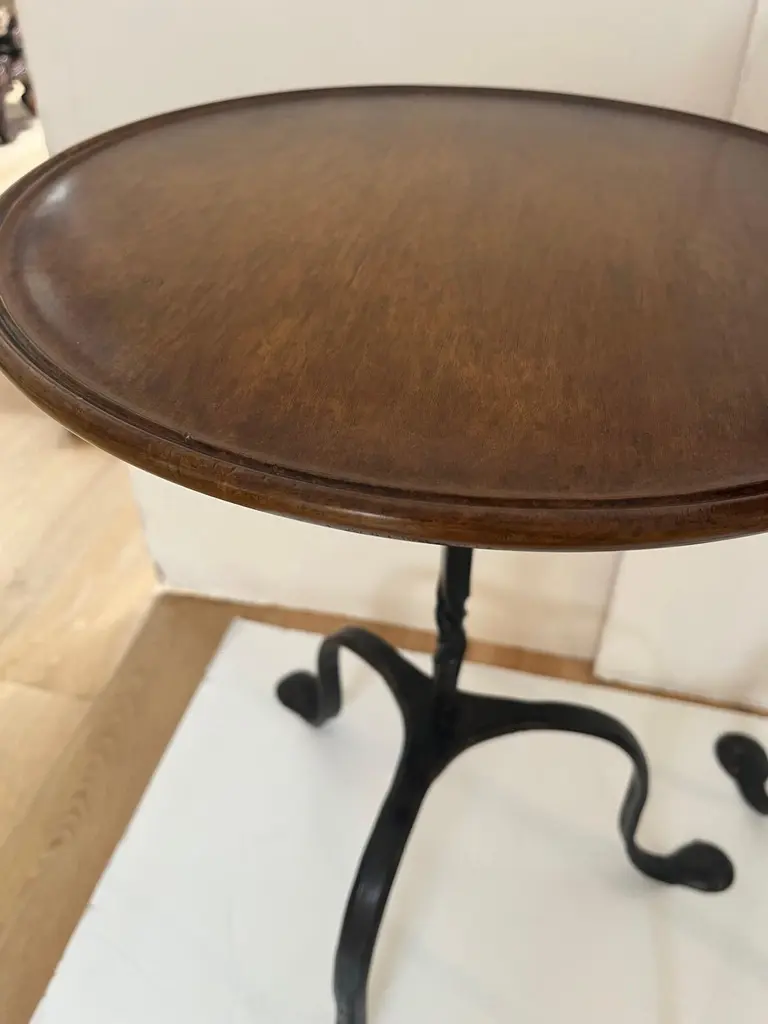 Made to Order Forged Iron Tripod Base Side Table or Drinks Table, Round Wooden Top with Lip in Dark Walnut Finish and Blond Walnut Finish, Tripod Base Forged Iron with Twisted Rope Edge and Patinated in Dark BronzeAvailable in Tall, and Short as you see in the Picture.Dimensions: Tall: 16" Diameter X 30" HeightShort: 16" Diameter X 23.5" Height