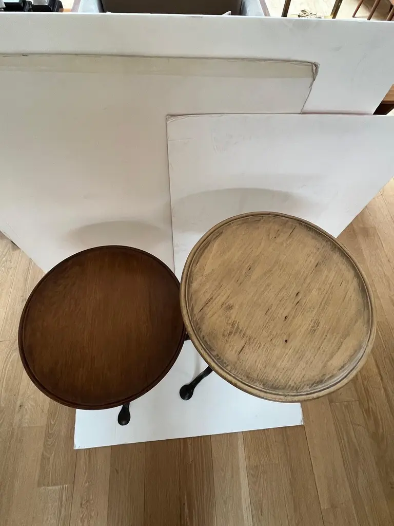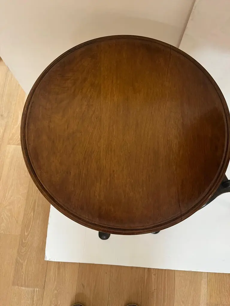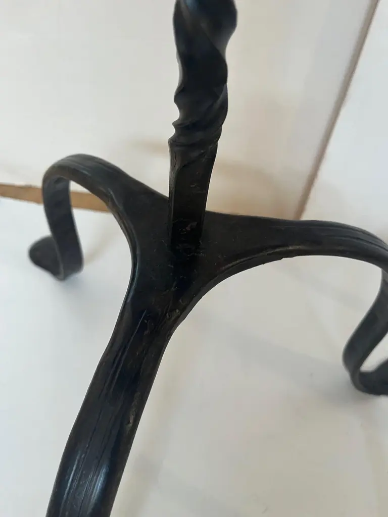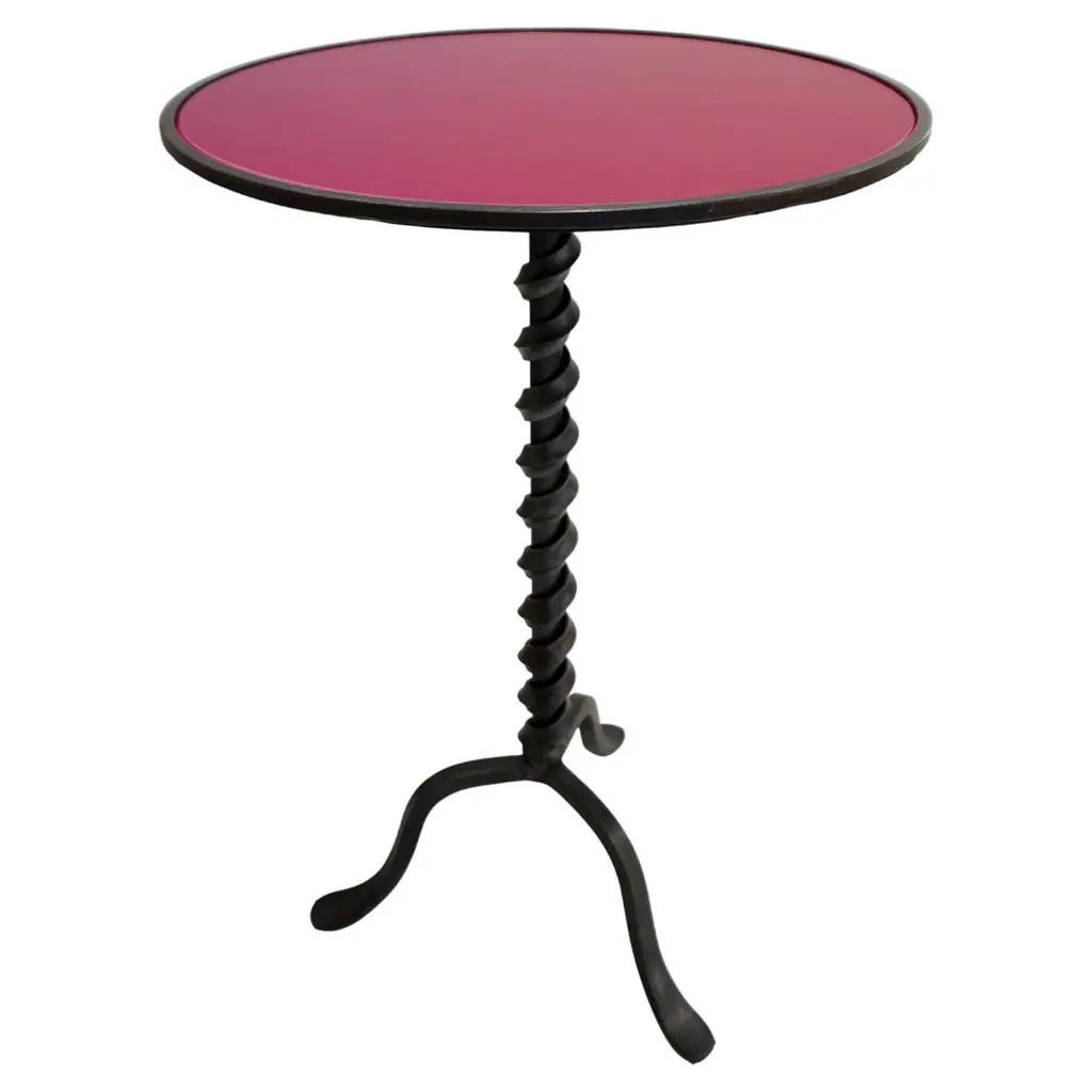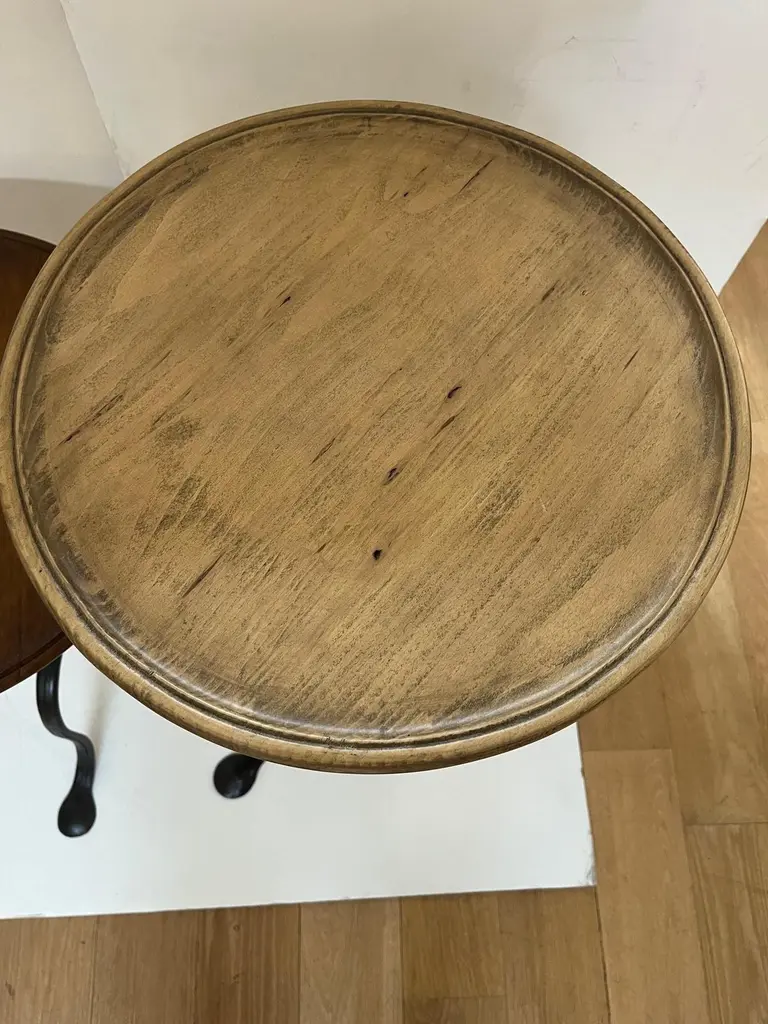 Made to Order Forged Iron Tripod Base Side Table or Drinks Table, Round Wooden Top with Lip in Dark Walnut Finish and Blond Walnut Finish, Tripod Base Forged Iron with Twisted Rope Edge and Patinated in Dark BronzeAvailable in Tall, and Short as you see in the Picture.Dimensions: Tall: 16" Diameter X 30" HeightShort: 16" Diameter X 23.5" Height