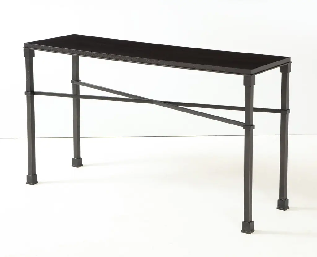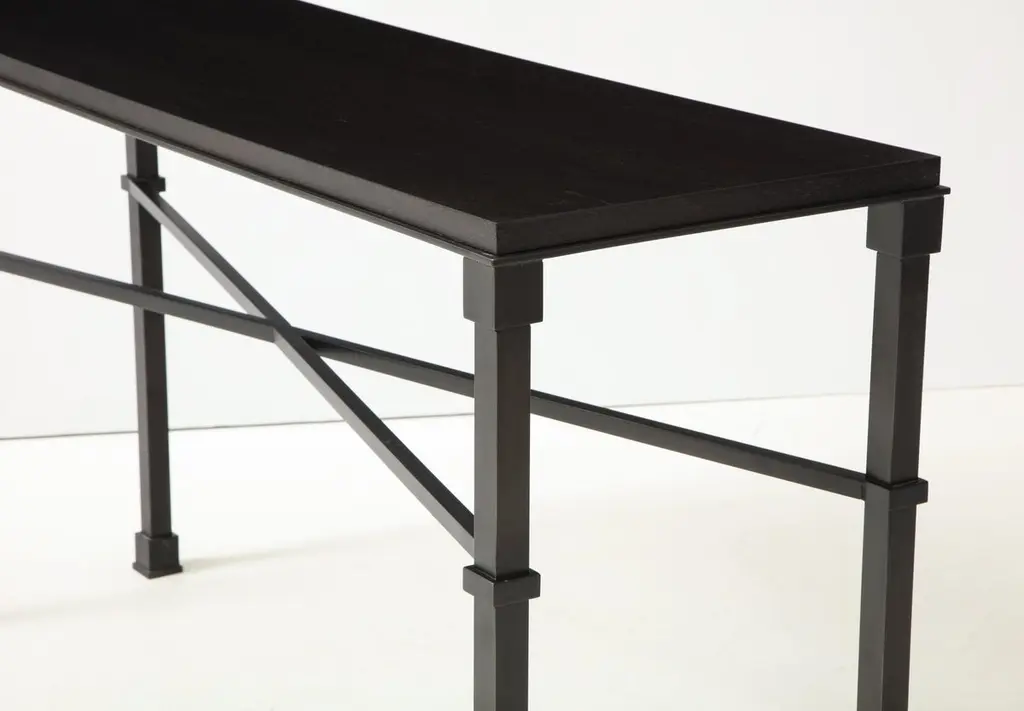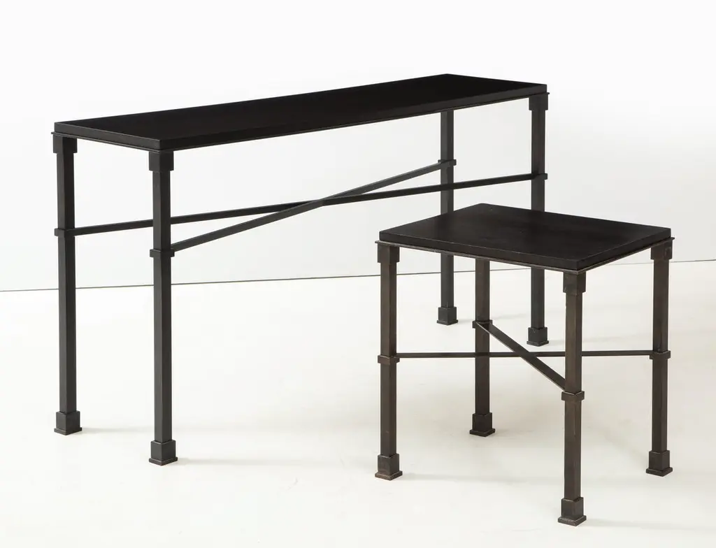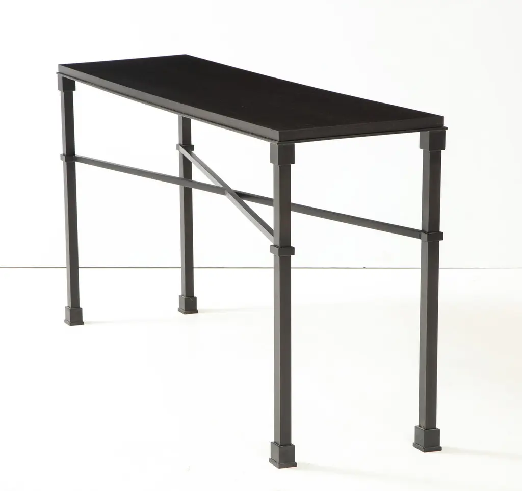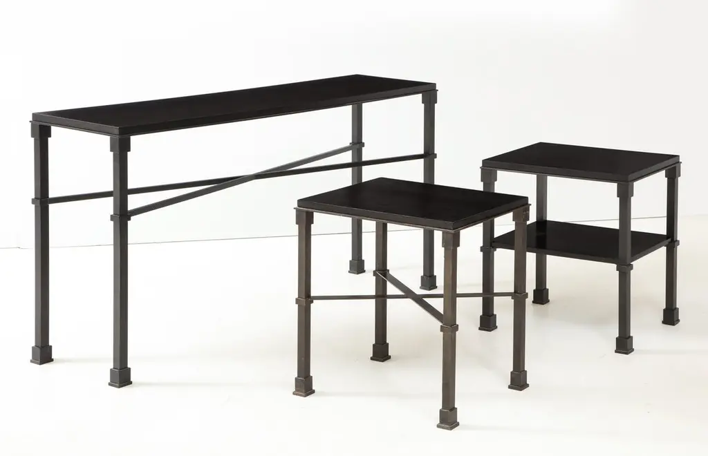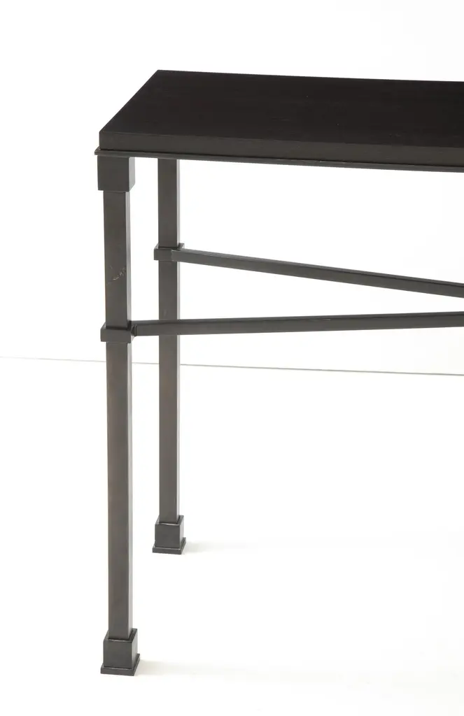 Made to order 'Quinet' console & end tablesHand made metal base, ebonized wood topMeasures: H: 32 D: 18 W: 60 inches This console & table in stock.