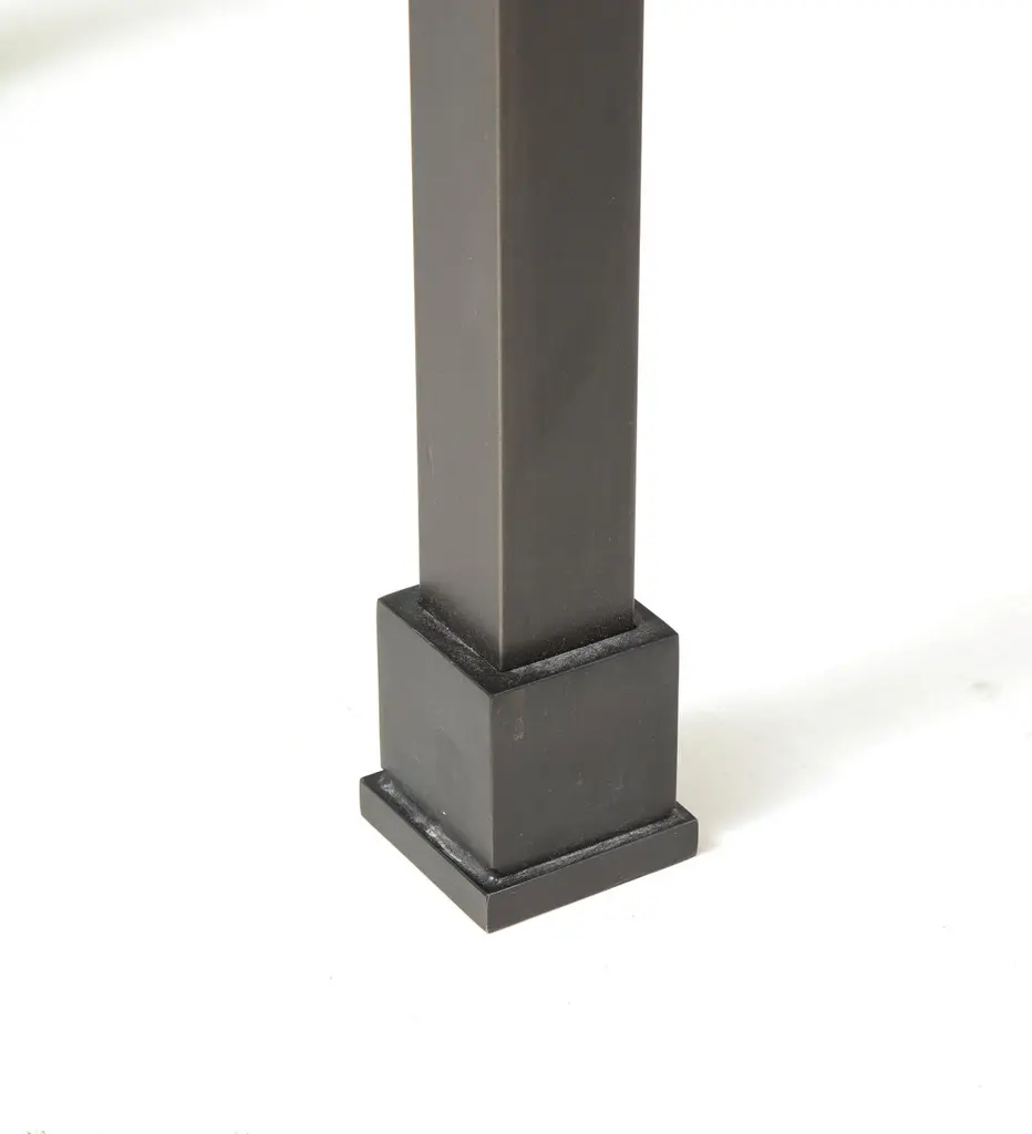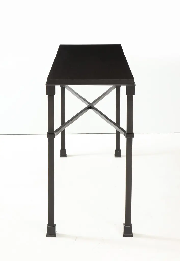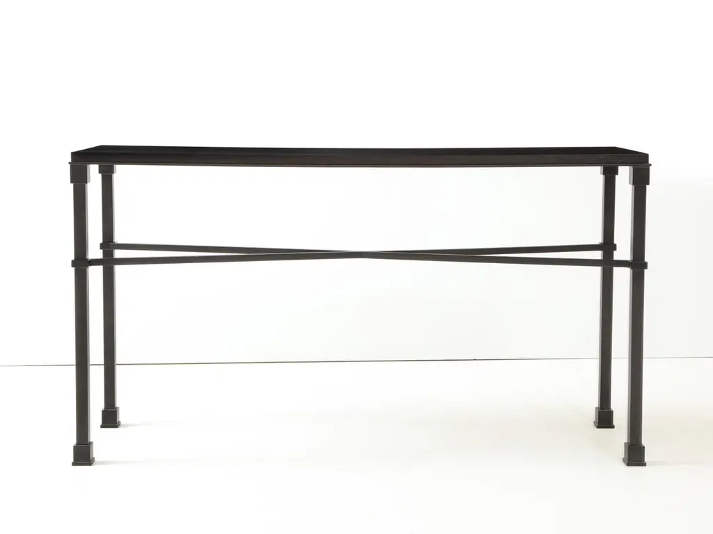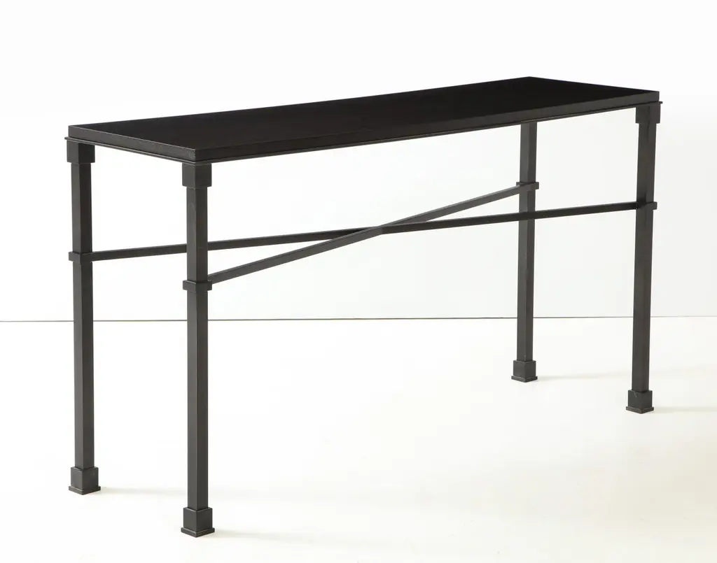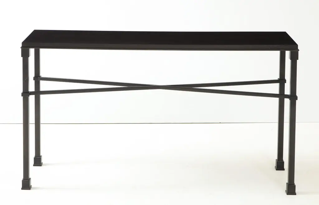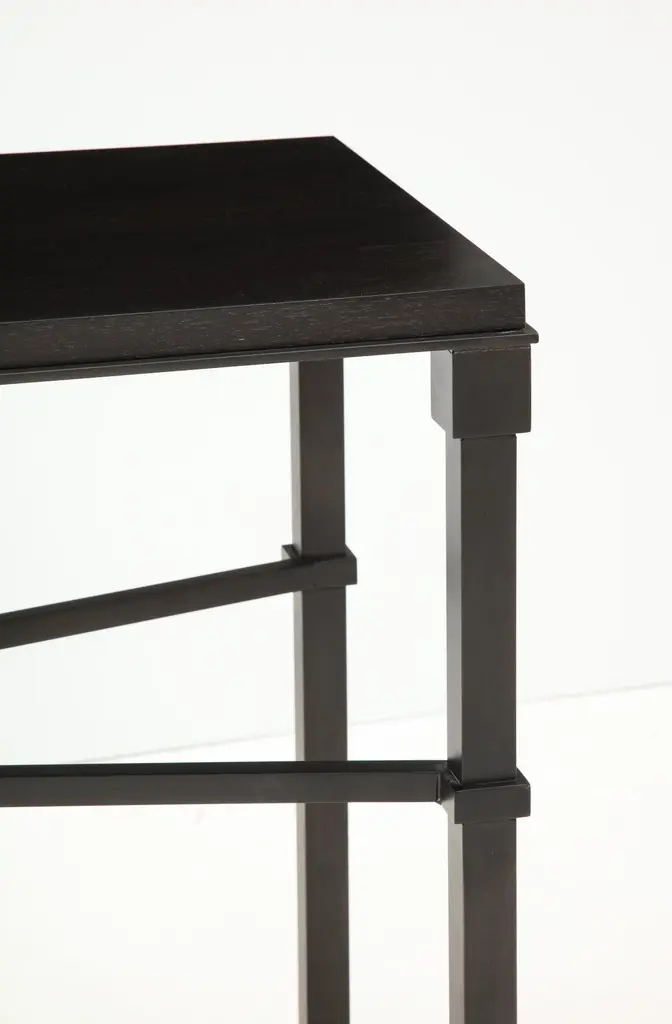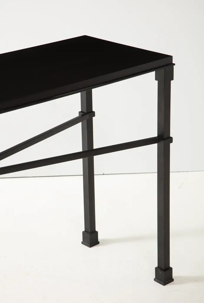 Made to order 'Quinet' console & end tablesHand made metal base, ebonized wood topMeasures: H: 32 D: 18 W: 60 inches This console & table in stock.