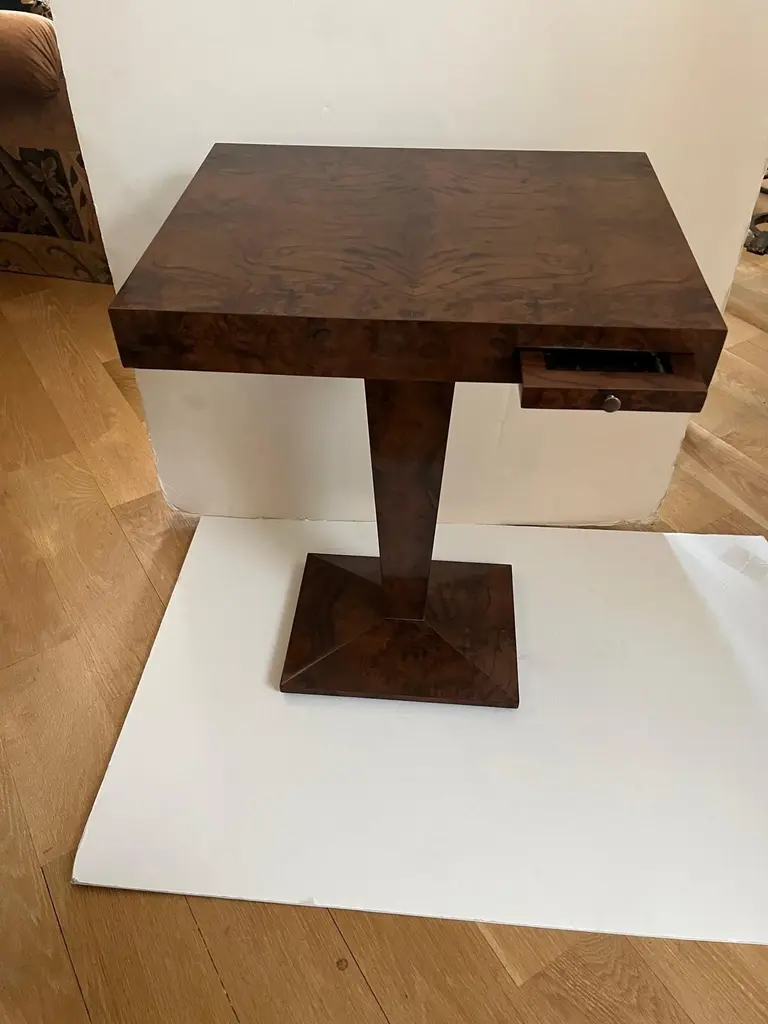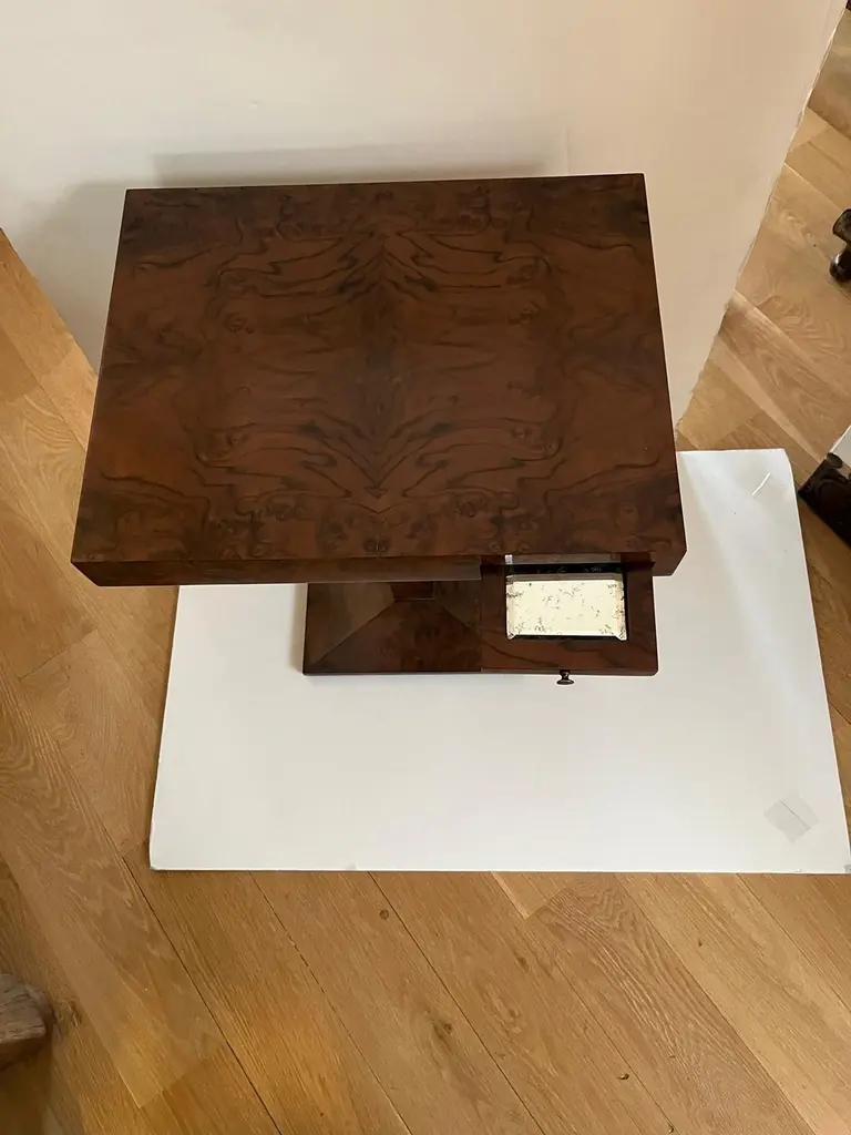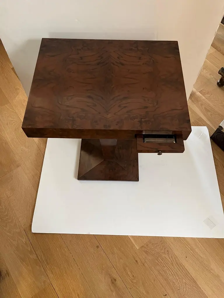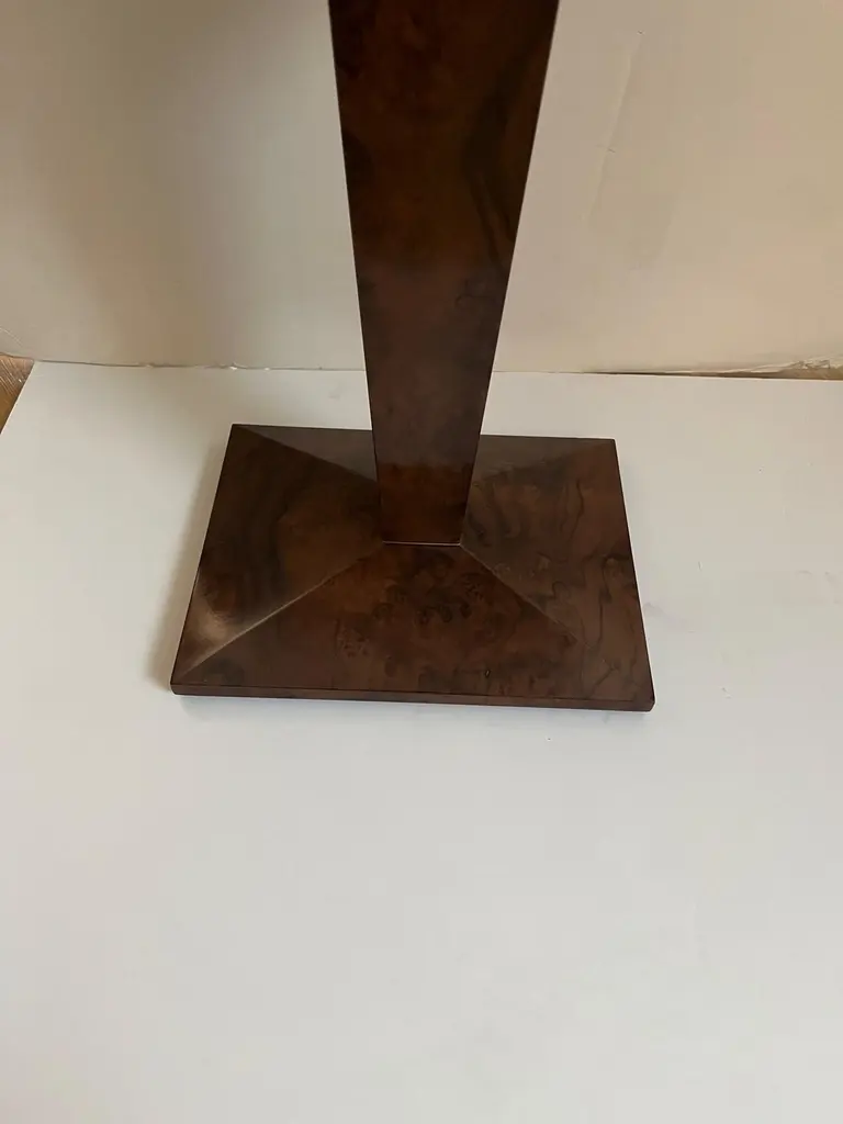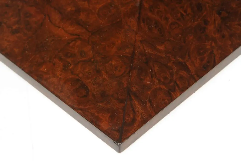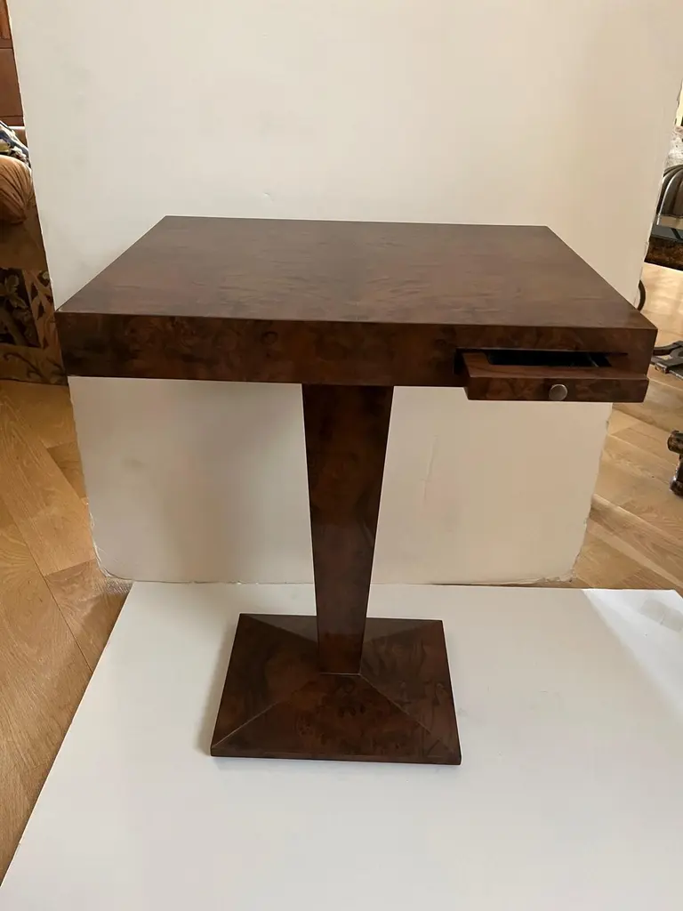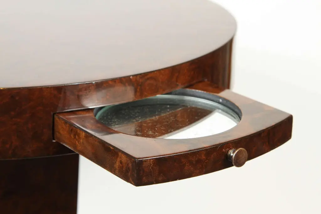 Perfectly scaled and gorgeous in form, this burled walnut side table makes a statement wherever it is. The burled walnut veneer gives this table a rich and stylish elegance that fits perfectly in contemporary design as well as transitional. The top conceals two pull-out drink trays with mirrored bottoms. Round and Square Top Tables availableRound Table Dimensions: 16" Diameter x 23.5"H Base: 12.5" X 9.5" SquareRectangular Table Dimensions: 18"W X 14"D X 23 3/4"H Base: 12.5" X 9.5" Square