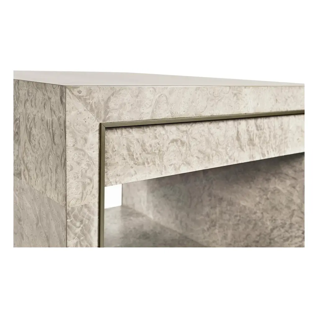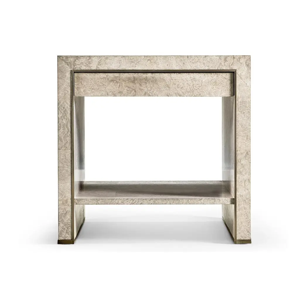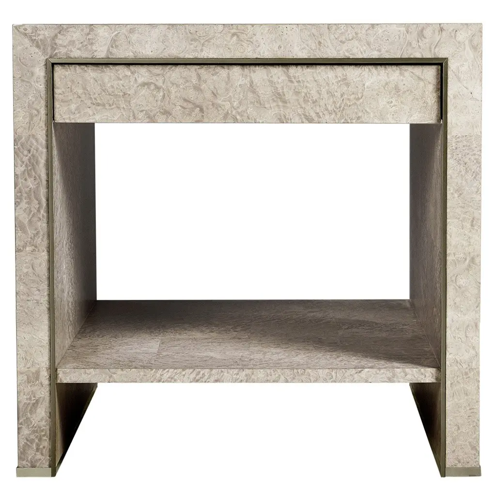 Madrona end table, stands apart from a world of standardized choices. Inspirational design elements lead with a butcher block top and sides honed from mesmerizing Madrona burl slabs finished in smoke gray.Understated metal accents along the base and ridges are finished in satin white brass for a delightful contrast and shimmering lightness. With an alluring surface, one-drawer storage and an open shelf.Dimensions: 24.75" W x 28.5" D x 24" H.
