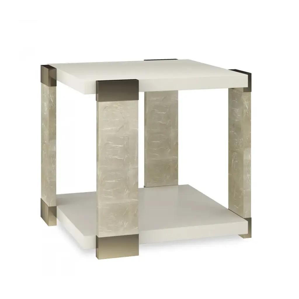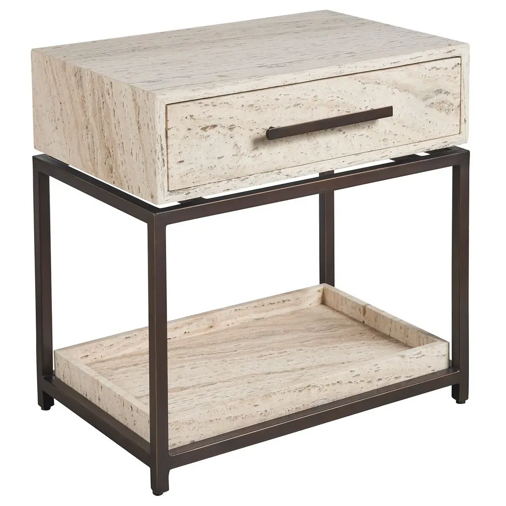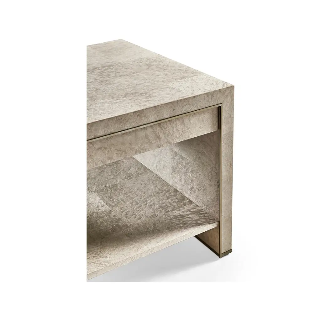 Madrona end table, stands apart from a world of standardized choices. Inspirational design elements lead with a butcher block top and sides honed from mesmerizing Madrona burl slabs finished in smoke gray.Understated metal accents along the base and ridges are finished in satin white brass for a delightful contrast and shimmering lightness. With an alluring surface, one-drawer storage and an open shelf.Dimensions: 24.75" W x 28.5" D x 24" H.