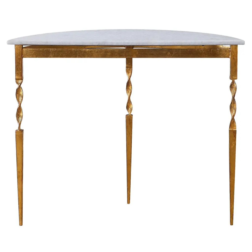 The Maeve Console Table is a masterpiece of elegance and sophistication, designed to captivate the heart and elevate any space it graces. Its demilune shape is a gentle curve of beauty, crowned with a polished marble top that gleams with a timeless allure. Beneath, the solid cast iron base stands as a testament to strength and artistry, adorned with intricate twist details that speak of craftsmanship and care. The tapered legs, finished in an antiqued gold, add a touch of regal charm, making this console table not just a piece of furniture, but a statement of style and grace. Let the Maeve Console Table be the centerpiece of your home, where elegance meets romance in perfect harmony.