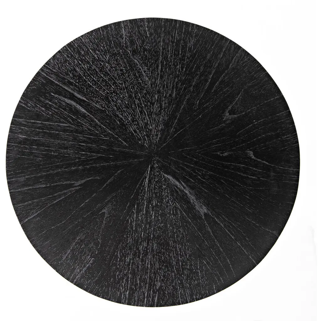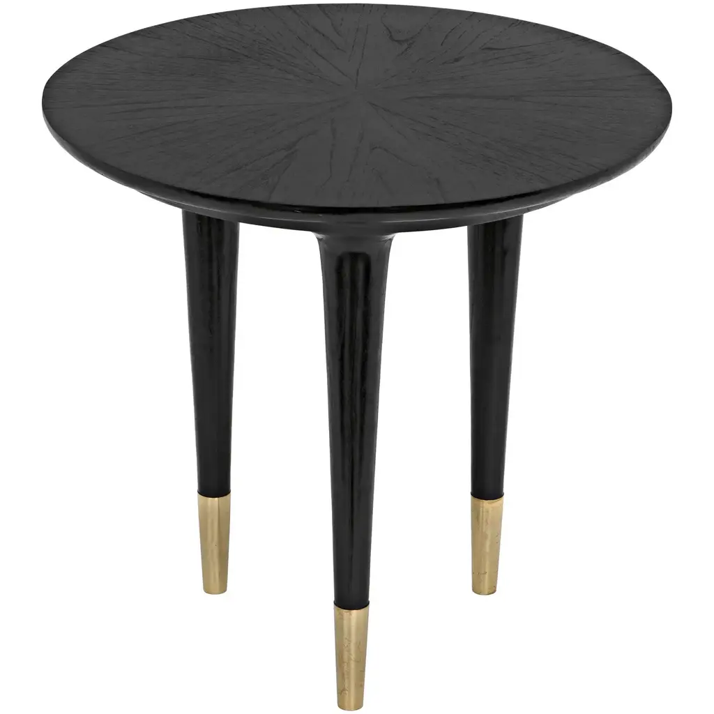 These simple round side tables pair charcoal black finished sungkai wood with brass cap legs for a look both modern and timeless.