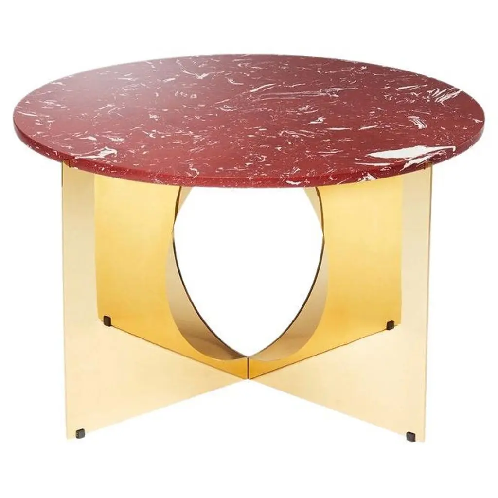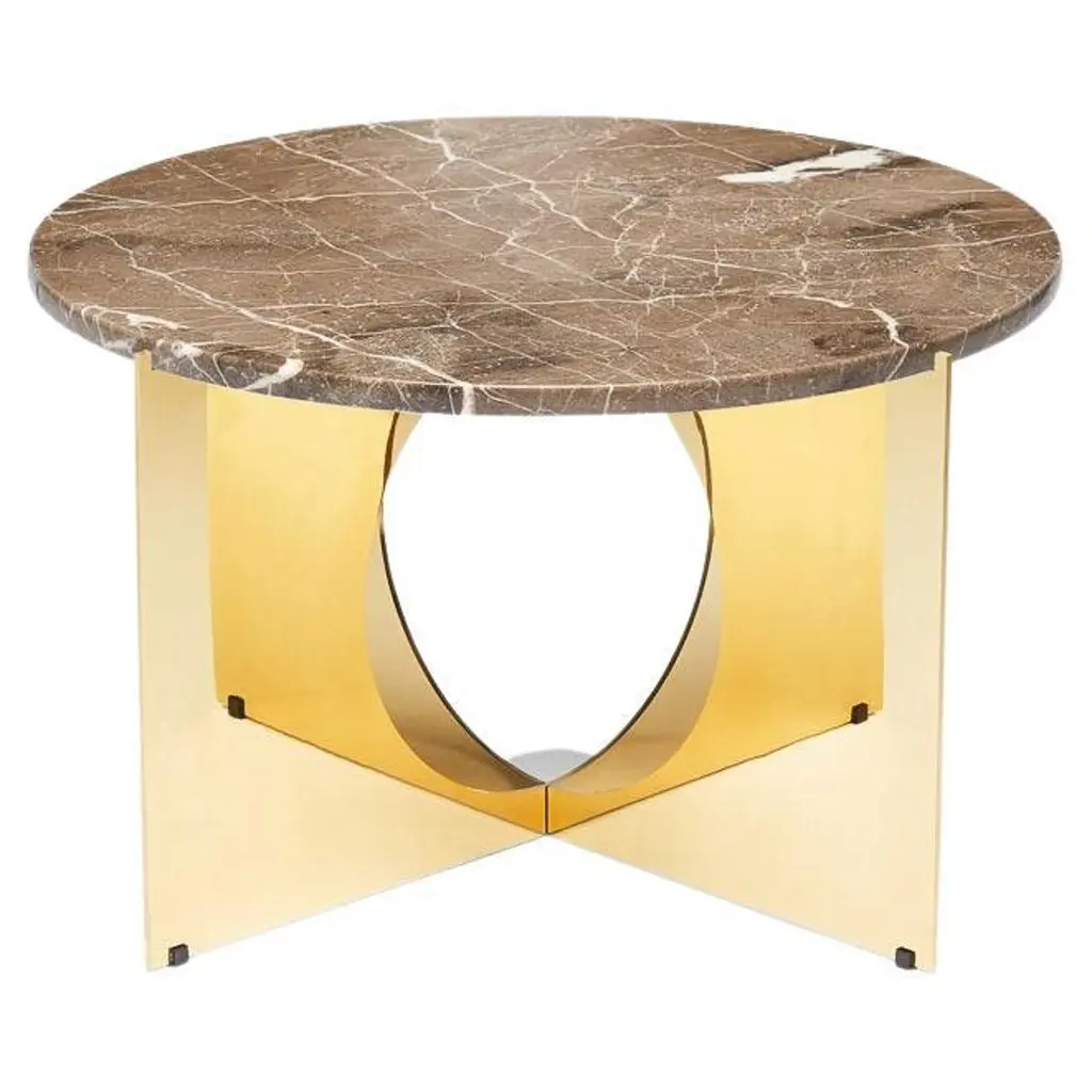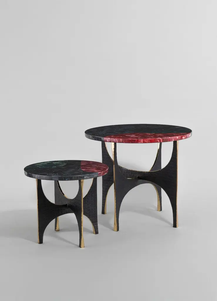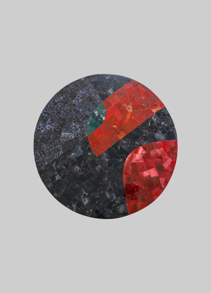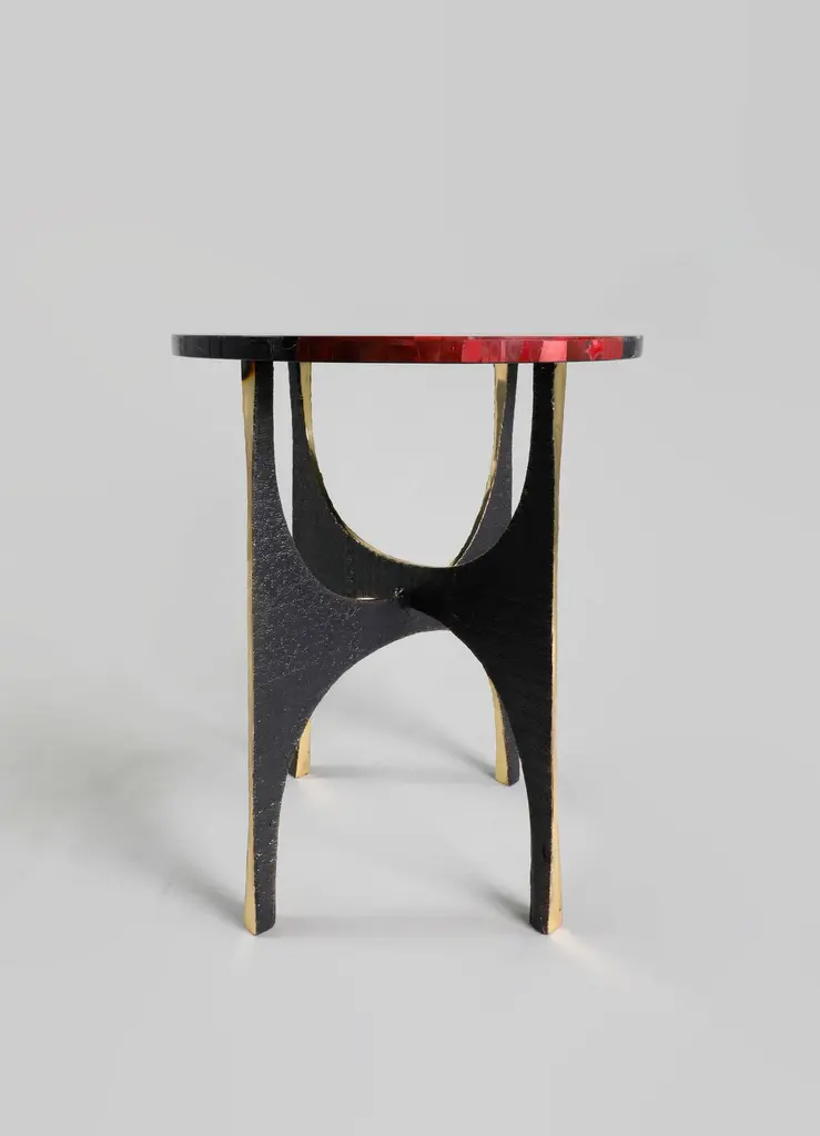 Maheshwar Side Table Medium in Semi Precious Overlay Top, Viya by Vikram GoyalUnfurling ceaselessly, India discovers its eternal muse in the realm of textiles. From the liquid silks of the South to the intricate brocades of the North, handwoven fabrics are artistically rendered in the timeless medium of metal, unveiling a tapestry of irregular textures and patterns that echoes the exquisite diversity of the land.Coffee Table in brass with semi precious overlay top. Handmade in India.Product DetailsMaterial: BrassOverlay Top: Red Jasper, Black Portoro, Red Mookaite Jasper, Moss Agate, Graphic PurpleSize: 20"DIA x 23.5"H 50.8 DIA x 59.7 H cmWeight: 17 kg 37.4 lbsPackage Contains: 1 Side TableSKU: VST402This product has been handcrafted by local artisans. As such, slight variations are a testament to the unique character of a piece made by hand.