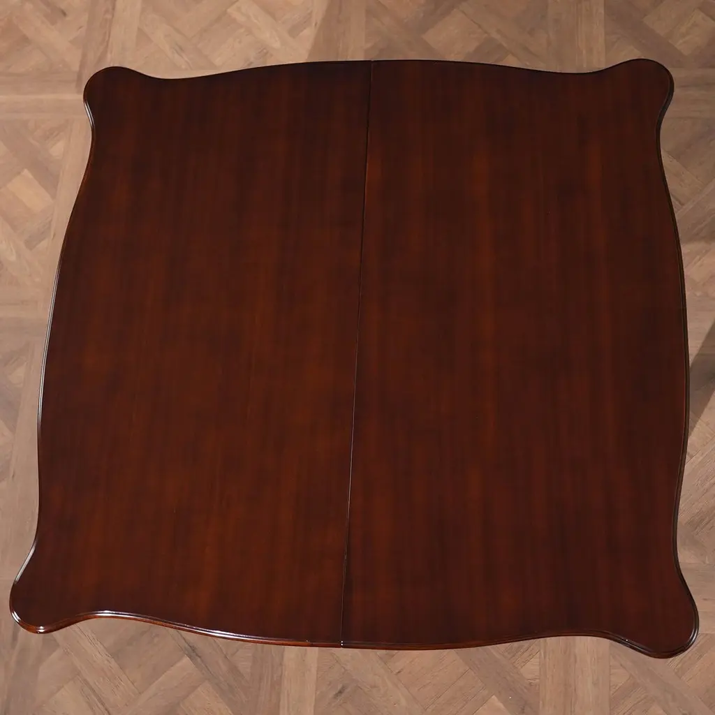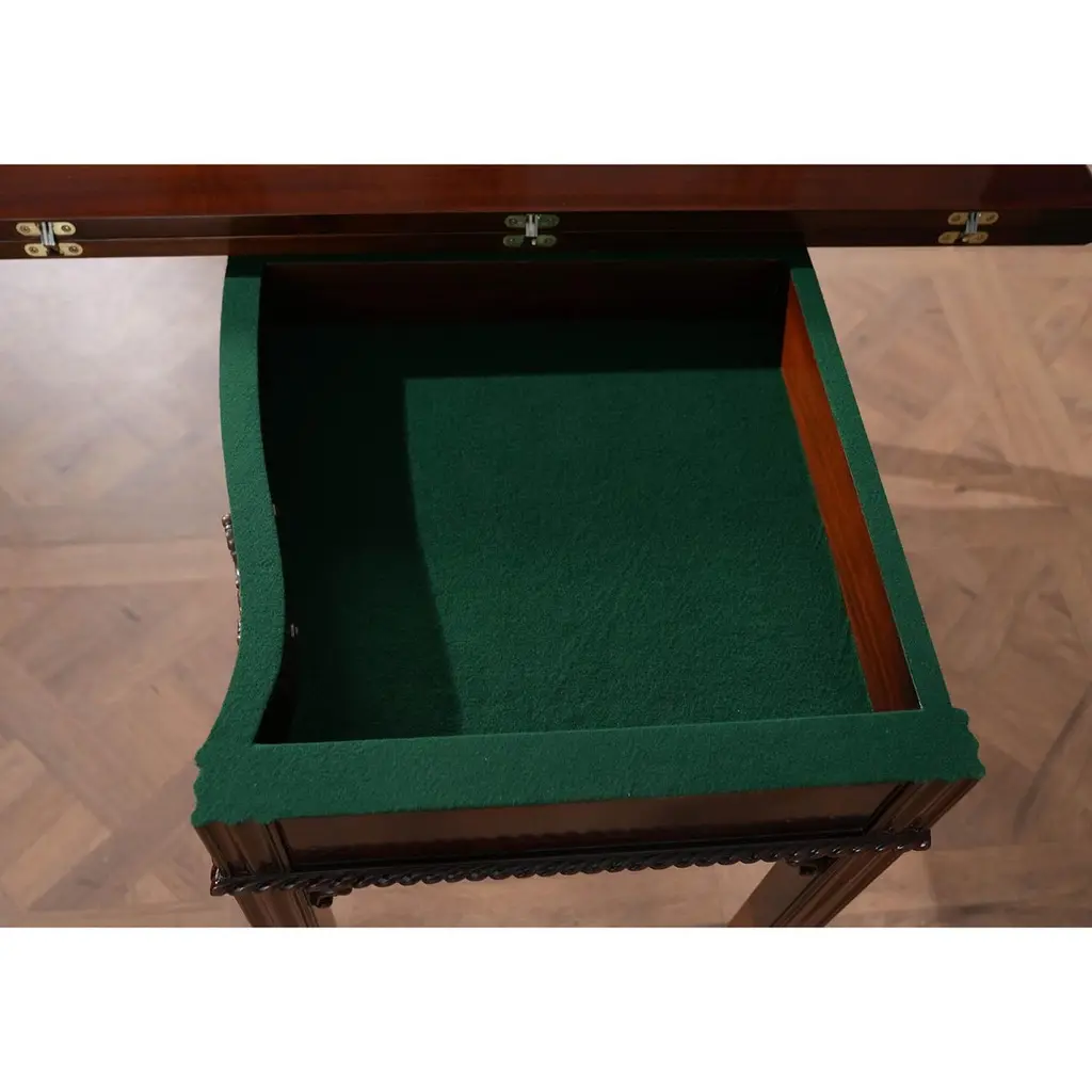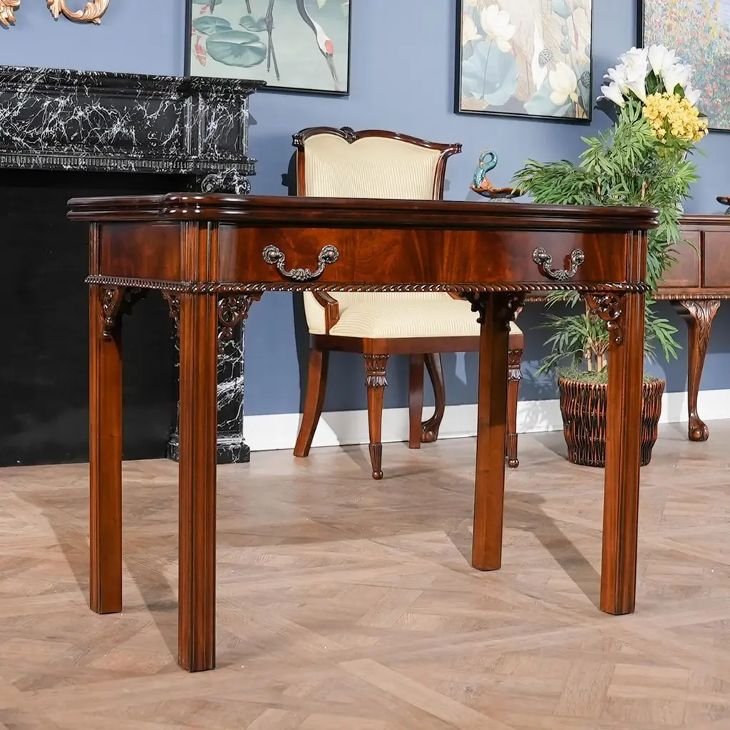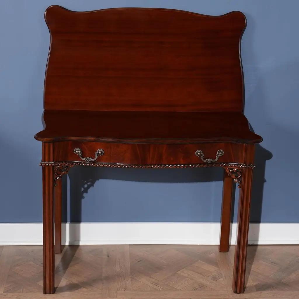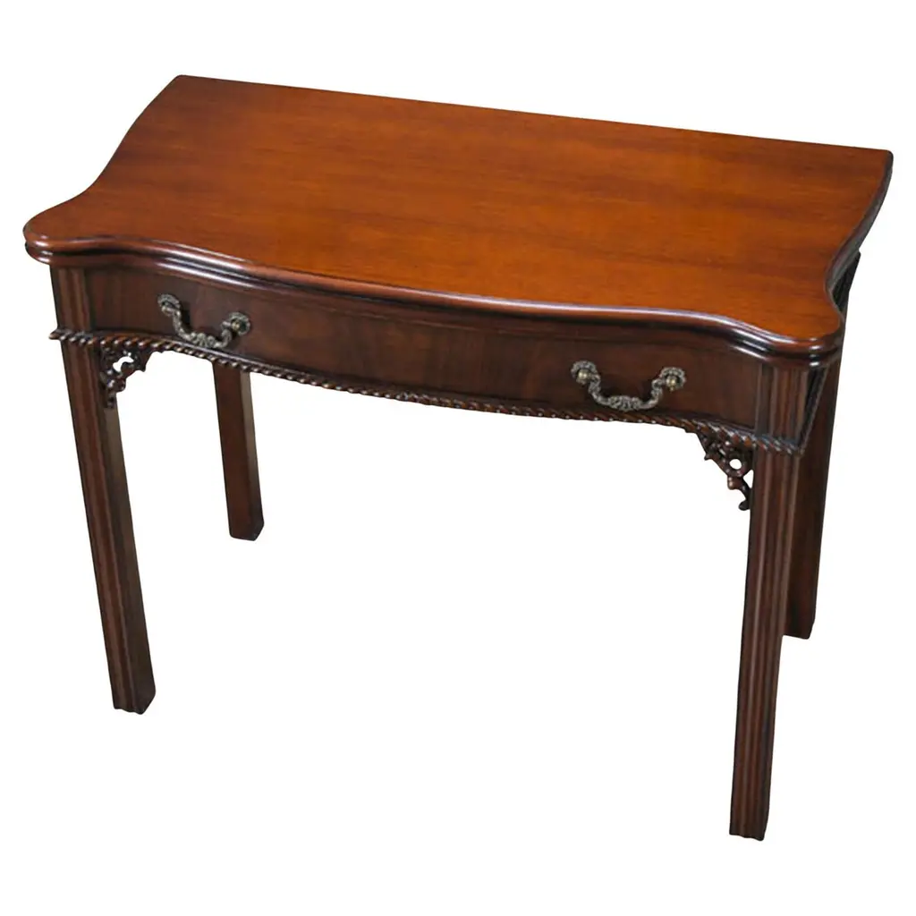 This large straight leg Mahogany Chippendale Game Table has a serpentine top with figural mahogany grain and a crisply moulded edge. The flamed veneered frieze with high quality rococo style hardware and fine gadroon carving sits above pierced and scrolled leaf brackets on straight fronted, solid mahogany chamfered legs. The entire top section of the Mahogany Chippendale Game Table can be turned on a pivot and opened to reveal a green felt lined storage space to the interior, ideal for storing playing cards. With the accordion top opened and supported lengthwise on the table frame a large gaming or eating surface can be created.Measures 40″w x 21″-42″d x 31″h Metric 102 53-106 79