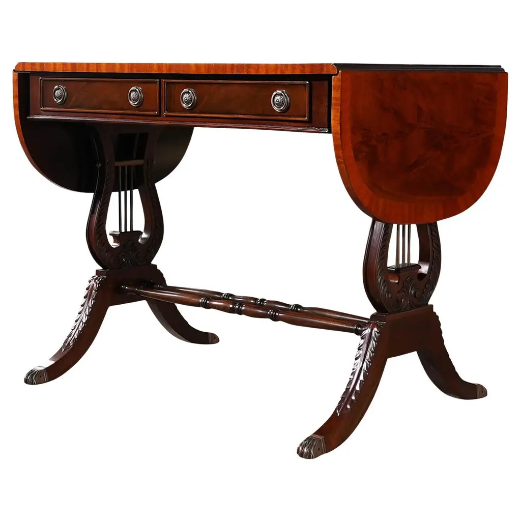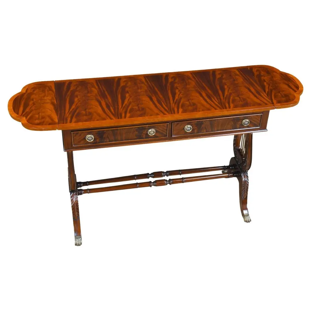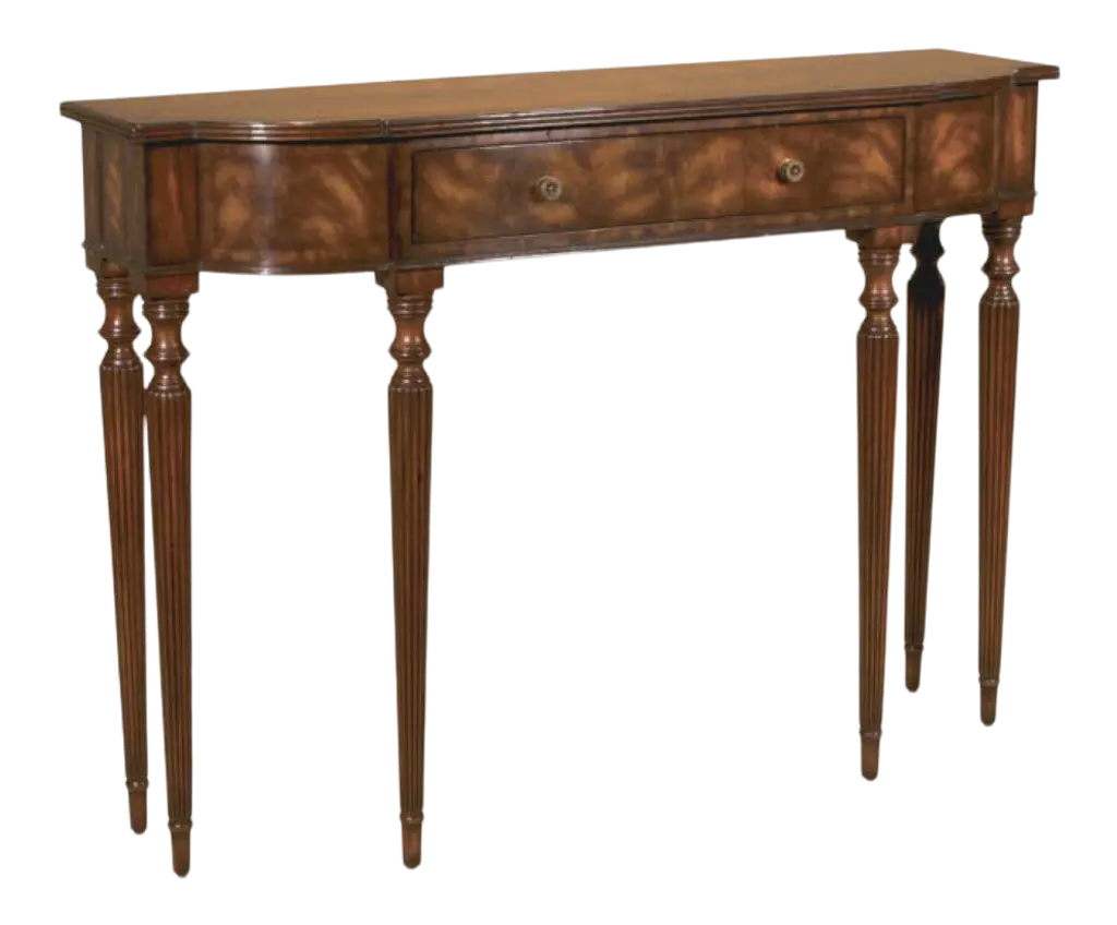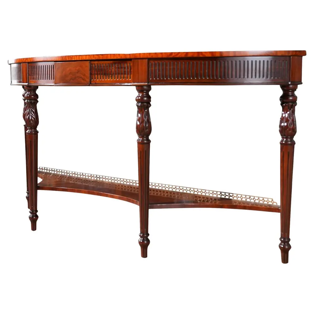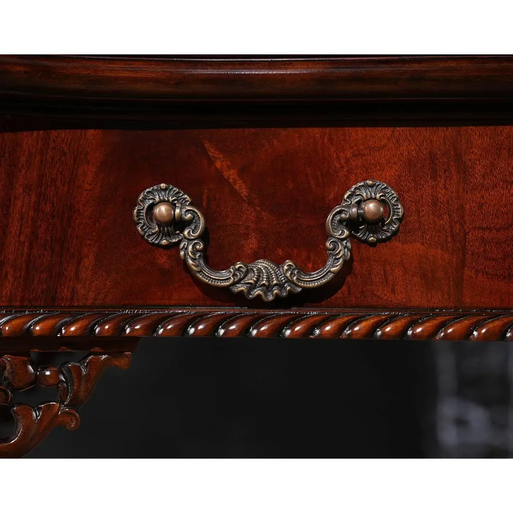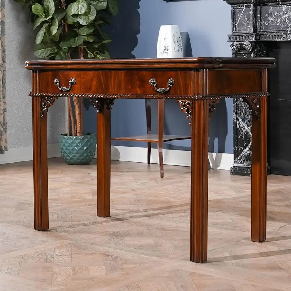 This large straight leg Mahogany Chippendale Game Table has a serpentine top with figural mahogany grain and a crisply moulded edge. The flamed veneered frieze with high quality rococo style hardware and fine gadroon carving sits above pierced and scrolled leaf brackets on straight fronted, solid mahogany chamfered legs. The entire top section of the Mahogany Chippendale Game Table can be turned on a pivot and opened to reveal a green felt lined storage space to the interior, ideal for storing playing cards. With the accordion top opened and supported lengthwise on the table frame a large gaming or eating surface can be created.Measures 40″w x 21″-42″d x 31″h Metric 102 53-106 79