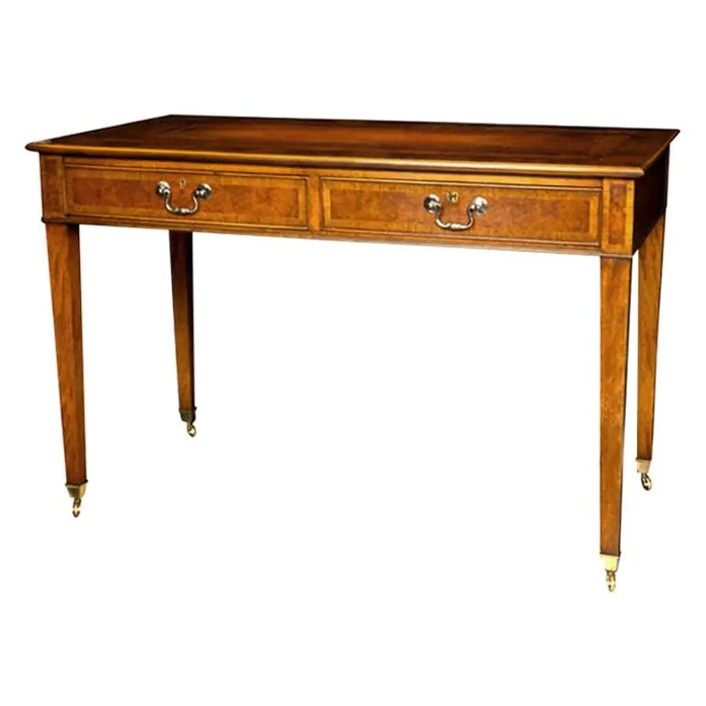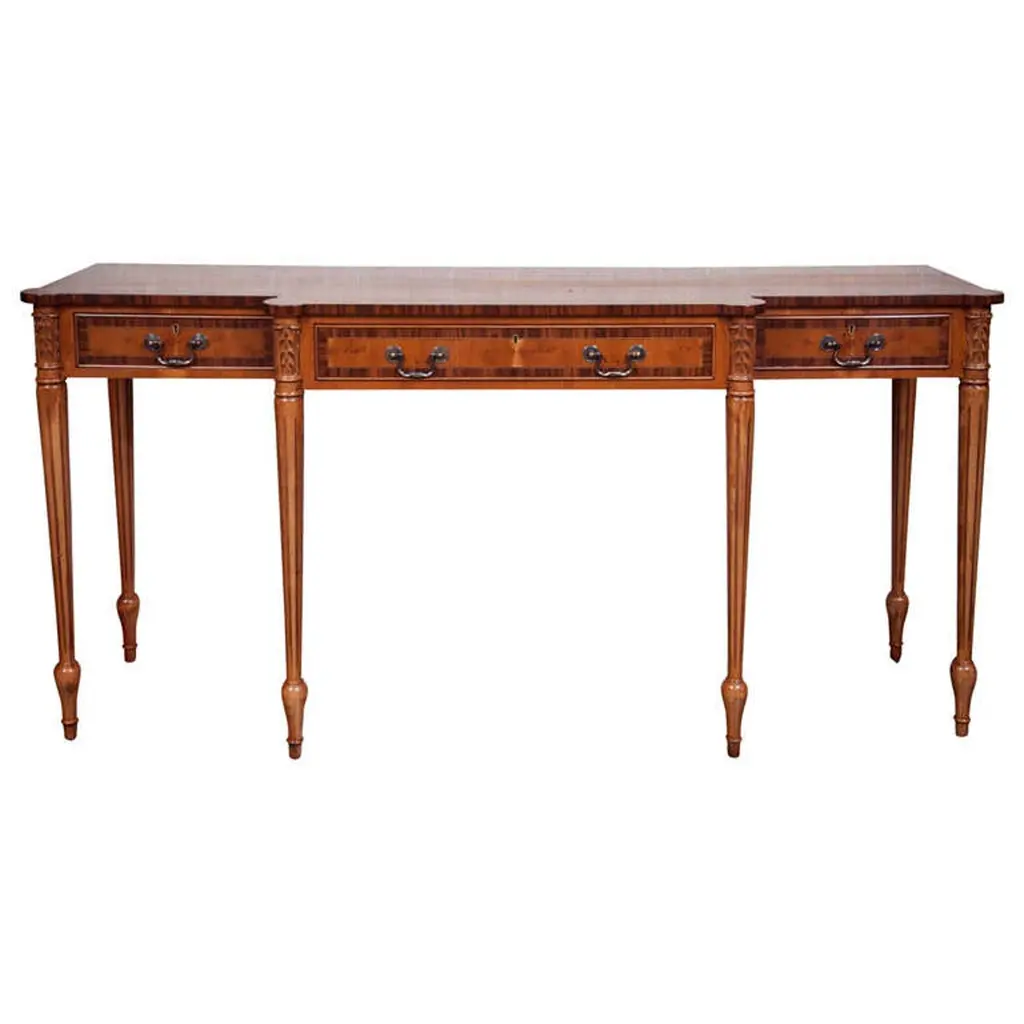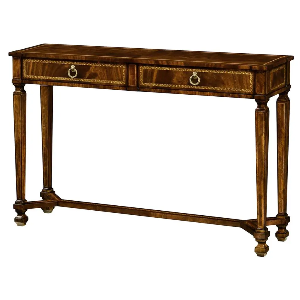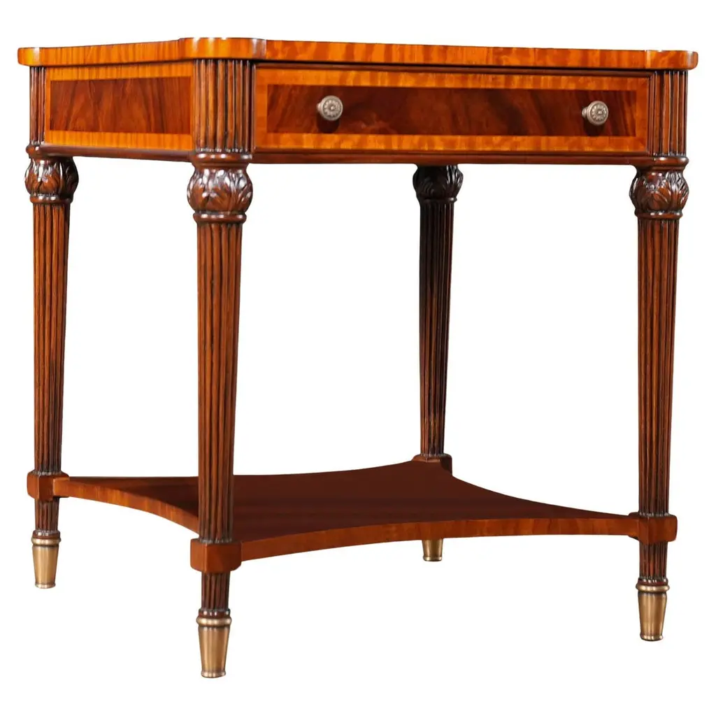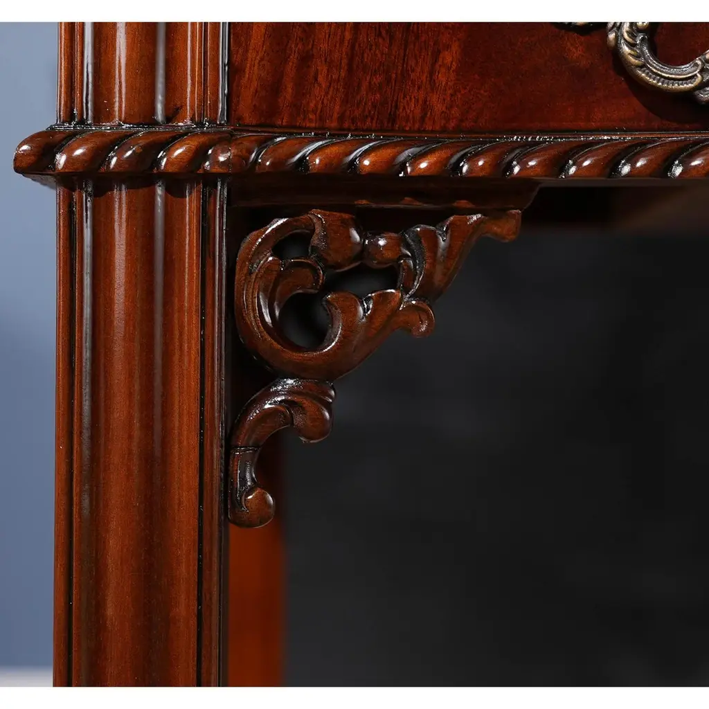 This large straight leg Mahogany Chippendale Game Table has a serpentine top with figural mahogany grain and a crisply moulded edge. The flamed veneered frieze with high quality rococo style hardware and fine gadroon carving sits above pierced and scrolled leaf brackets on straight fronted, solid mahogany chamfered legs. The entire top section of the Mahogany Chippendale Game Table can be turned on a pivot and opened to reveal a green felt lined storage space to the interior, ideal for storing playing cards. With the accordion top opened and supported lengthwise on the table frame a large gaming or eating surface can be created.Measures 40″w x 21″-42″d x 31″h Metric 102 53-106 79