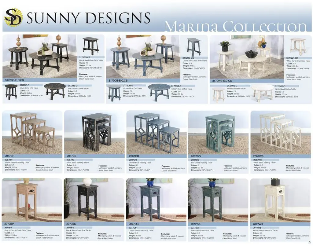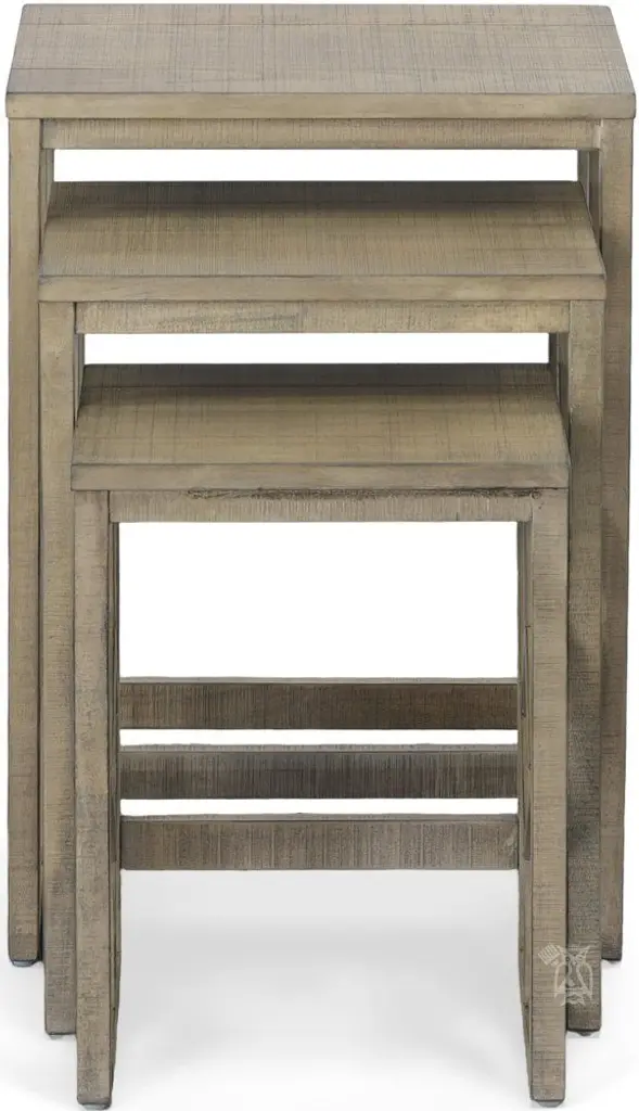 Solid Mahogany Wood Set of 3 Nesting Tables in Beach Pebble Finish. If you believe life is better in sandals (an opinion I will never flip-flop on), this Sandy Beach collection is made for you! The Sandy Beach collection features durable hardwood, solid wood drawer boxes and wood slides. All pieces come in your choice of fun beachy colors. Be shellfish and bring the ocean indoors! This table is ideally placed between two chairs but can serve many functions. It is also paired well with the matching rocking chair and accent tables. Fully assembled. Manufacturer: Sunny Designs.