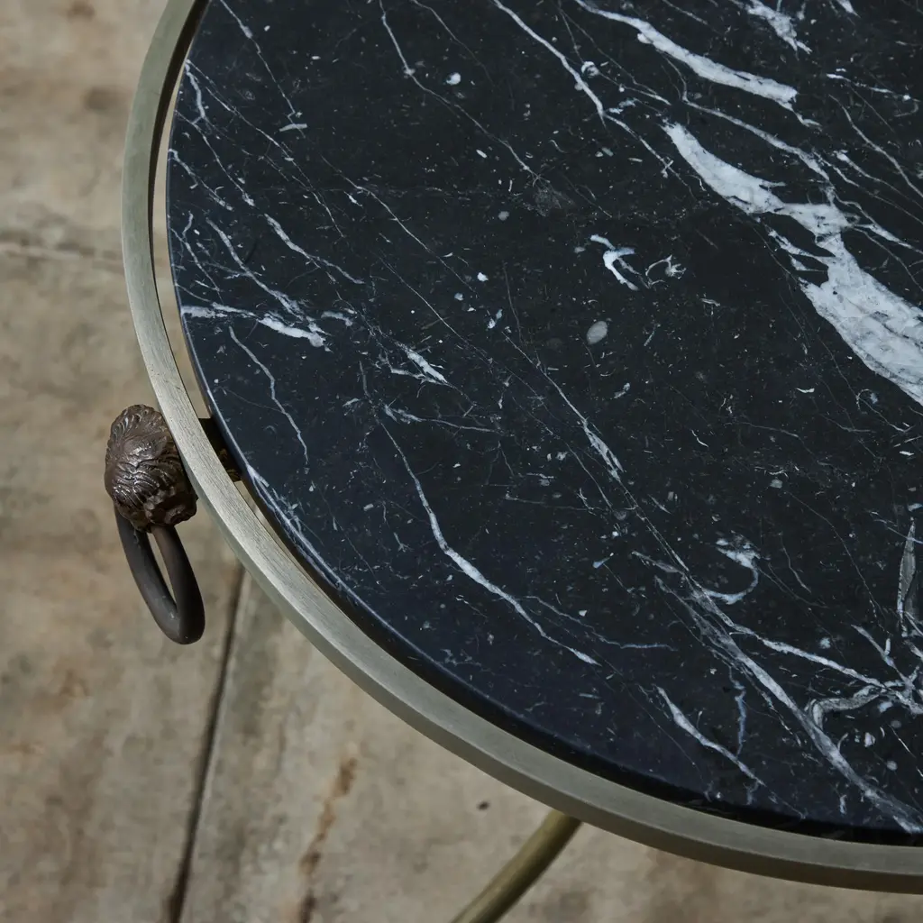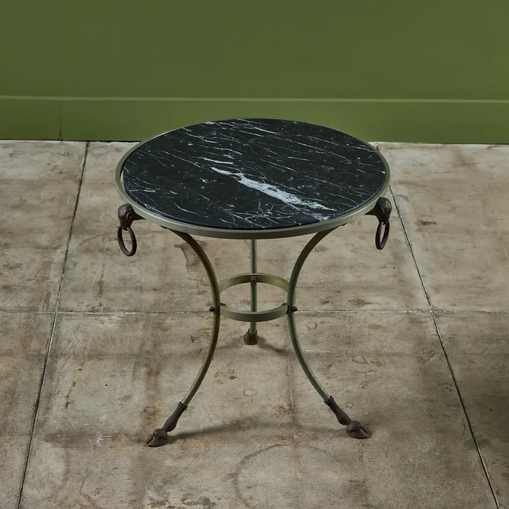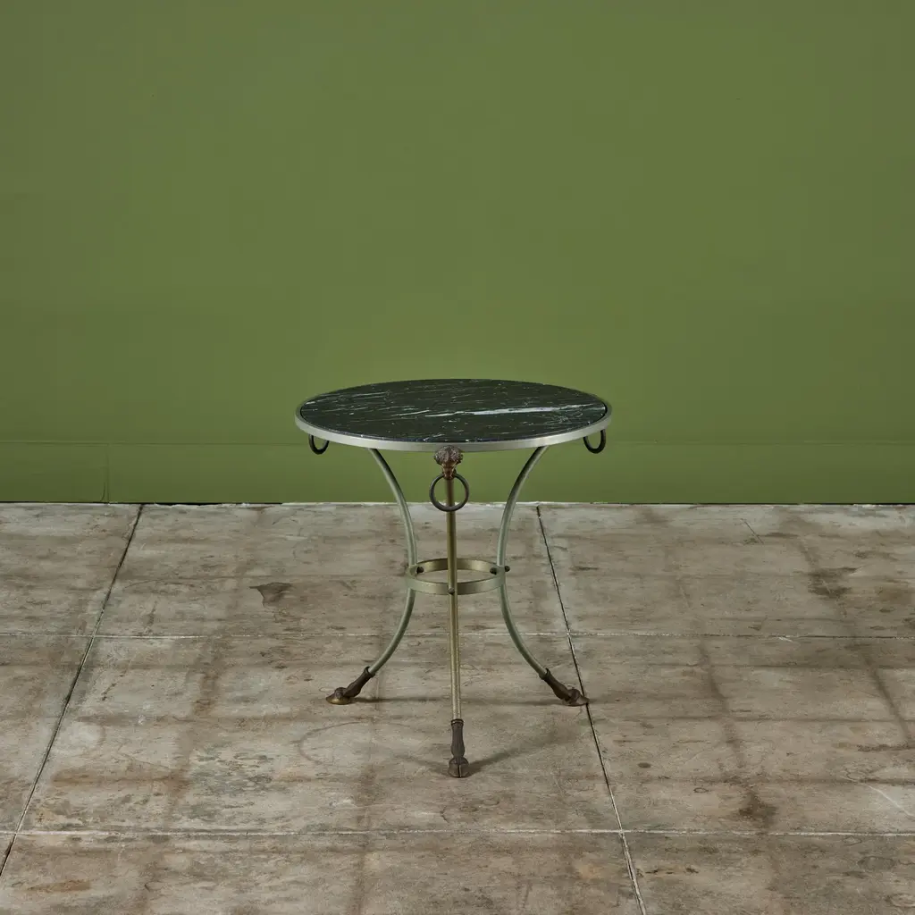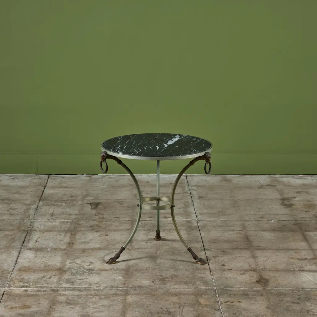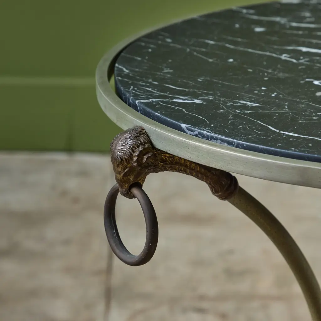 Three legged side table with marble top in the style of Maison Jansen. The round table has a brushed nickel plated frame with brass details around the table top and at the bottom of each leg. The leg caps each resemble a ram's foot, while the side of the table top showcases three brass rams with ring detail. Two available. Dimensions 21" diameter x 21.75" height. Condition Excellent vintage condition, metal carries age appropriate patina. Newly cut marble table top.