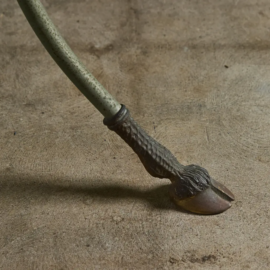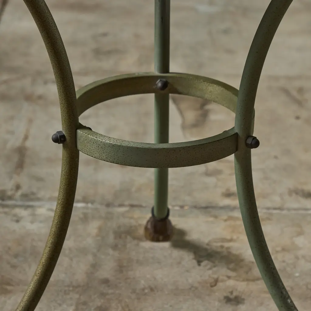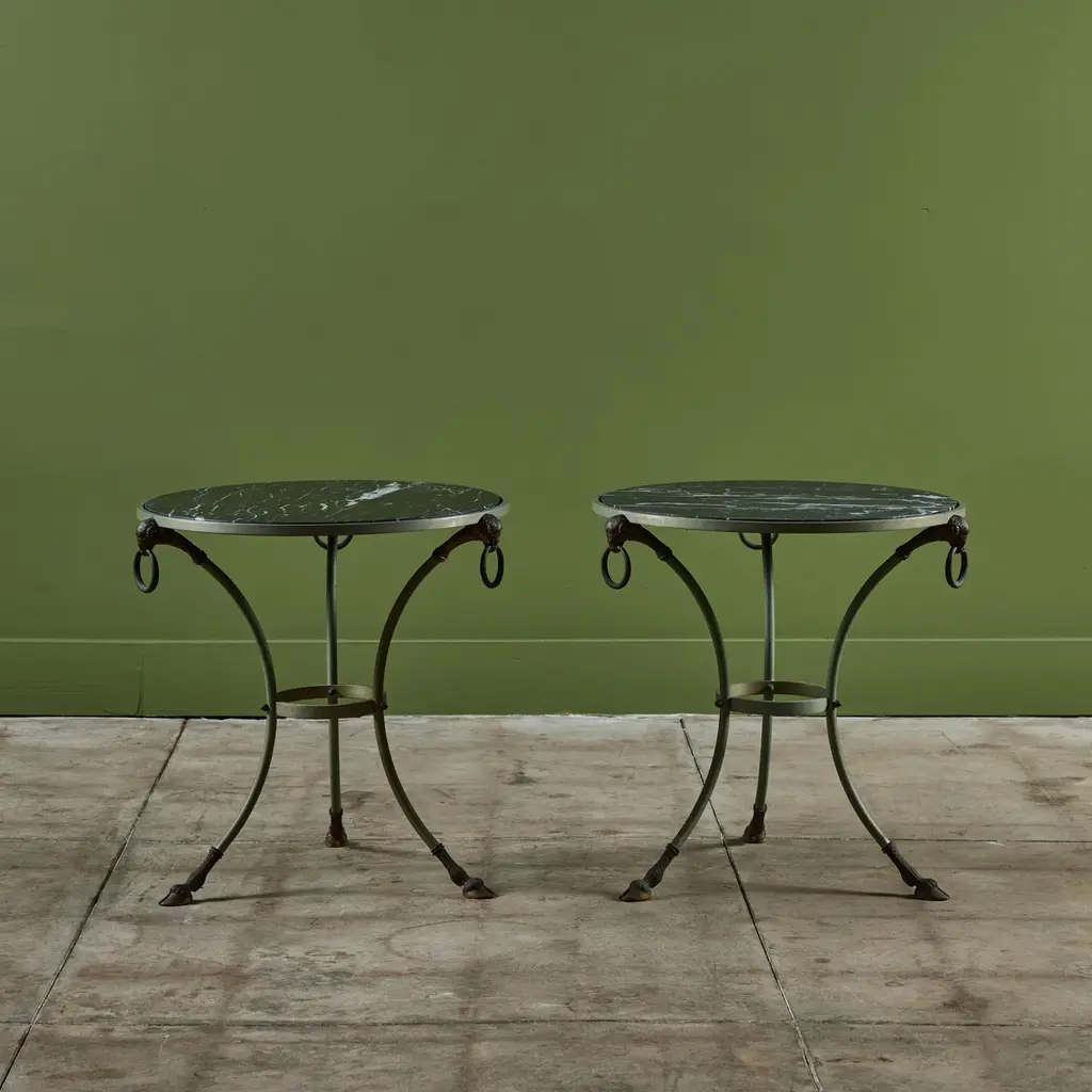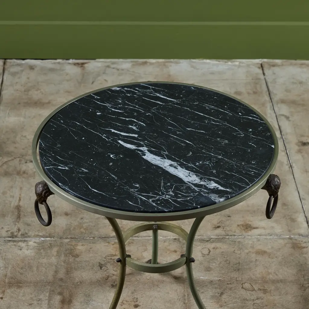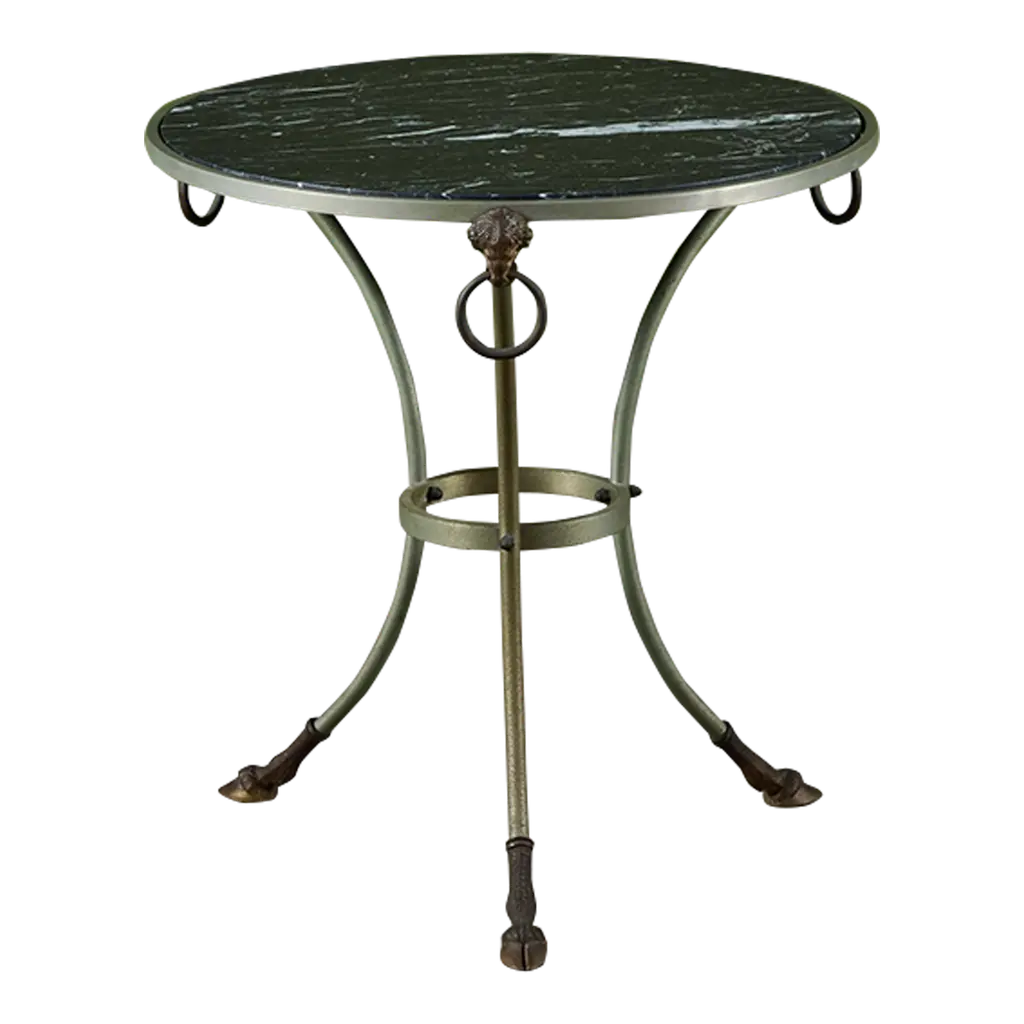 Three legged side table with marble top in the style of Maison Jansen. The round table has a brushed nickel plated frame with brass details around the table top and at the bottom of each leg. The leg caps each resemble a ram's foot, while the side of the table top showcases three brass rams with ring detail. Two available. Dimensions 21" diameter x 21.75" height. Condition Excellent vintage condition, metal carries age appropriate patina. Newly cut marble table top.